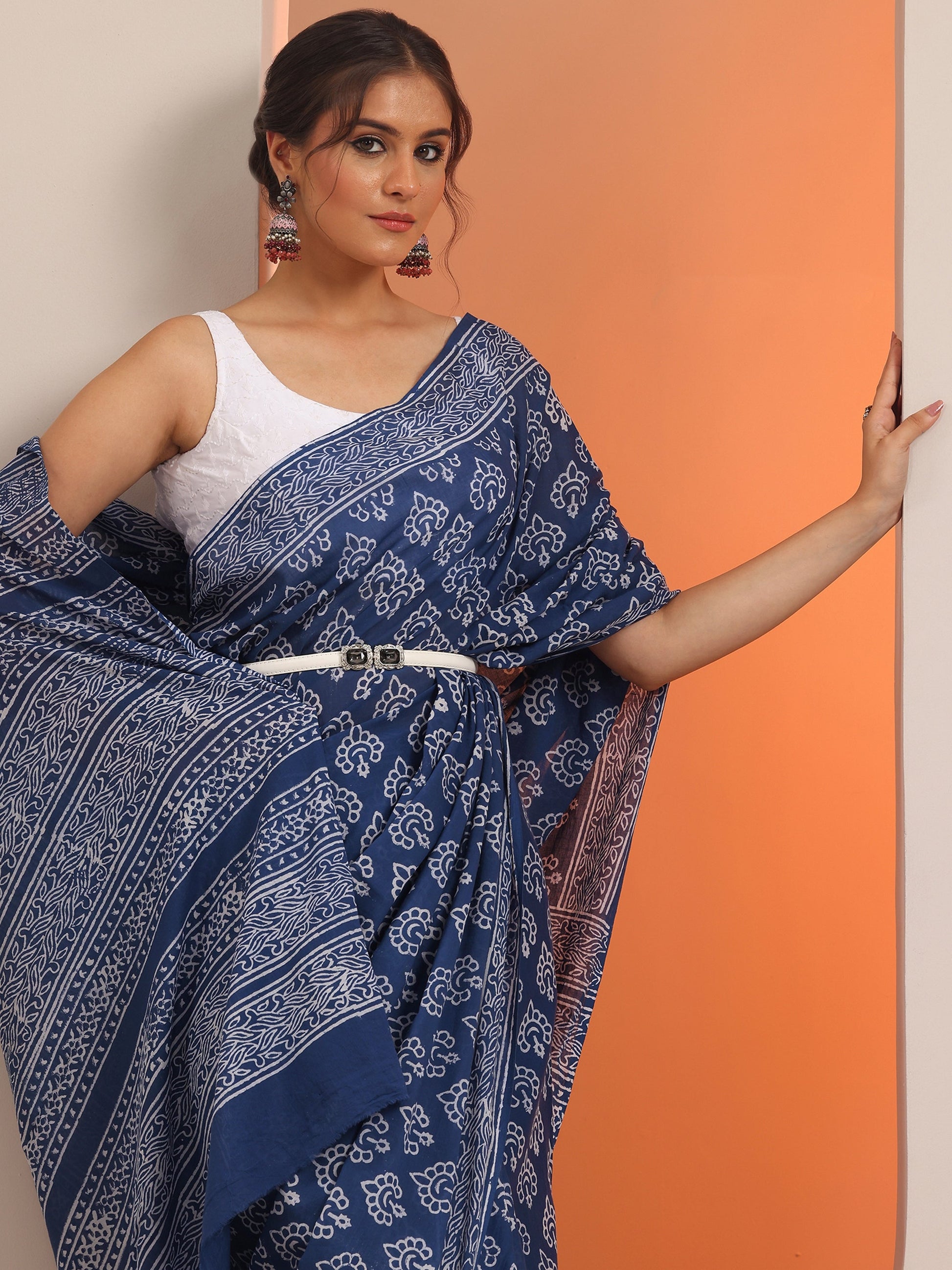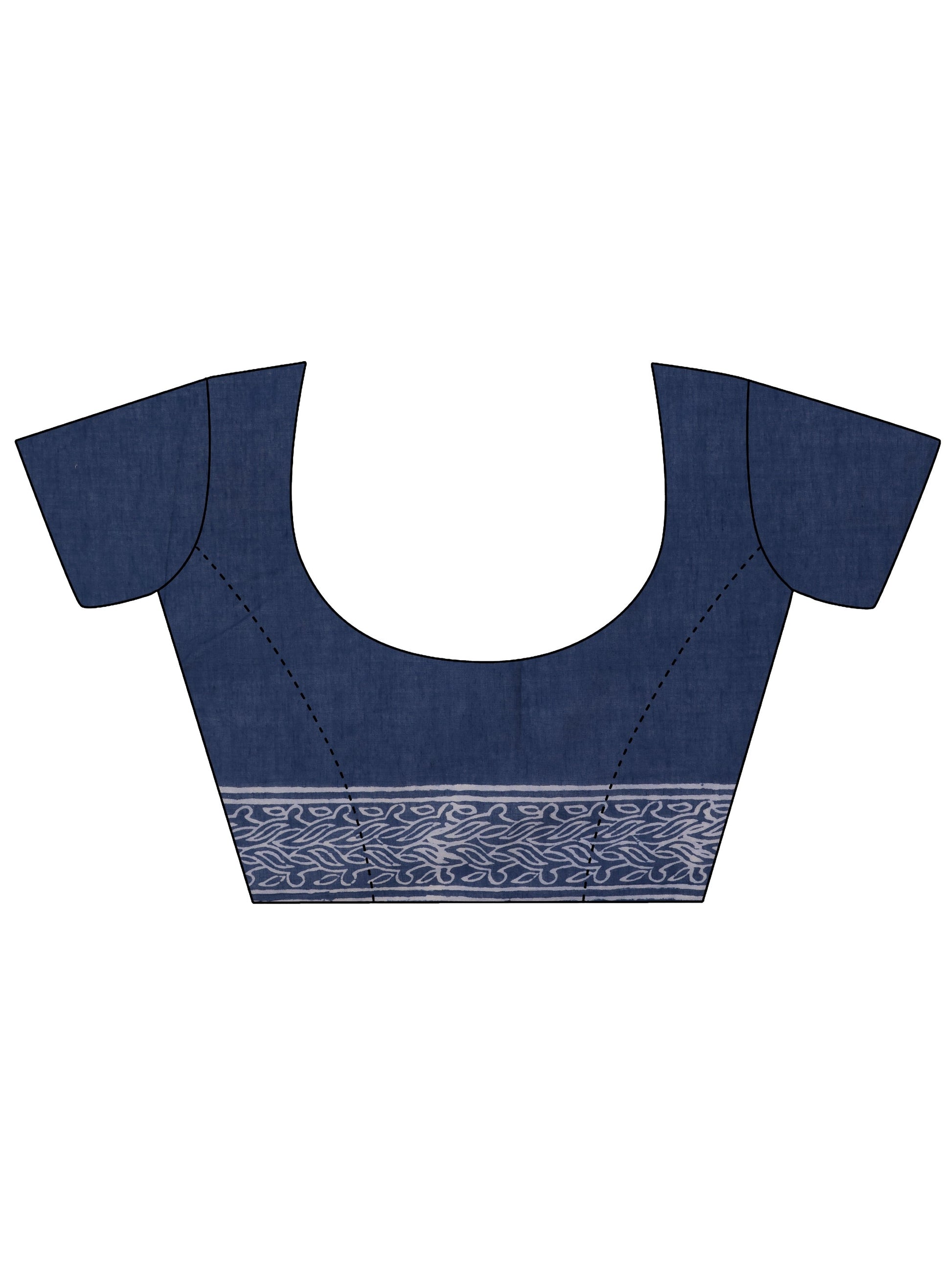 Blue Printed Cotton Saree With Unstitched Blouse Piece