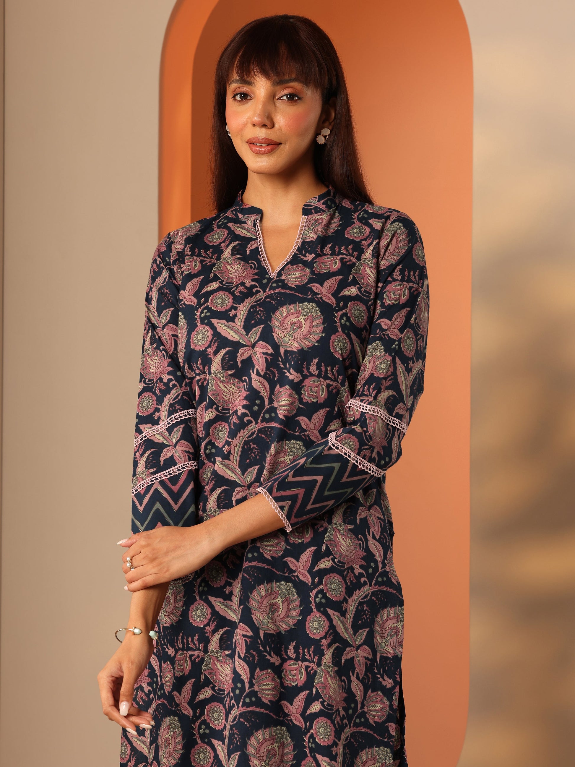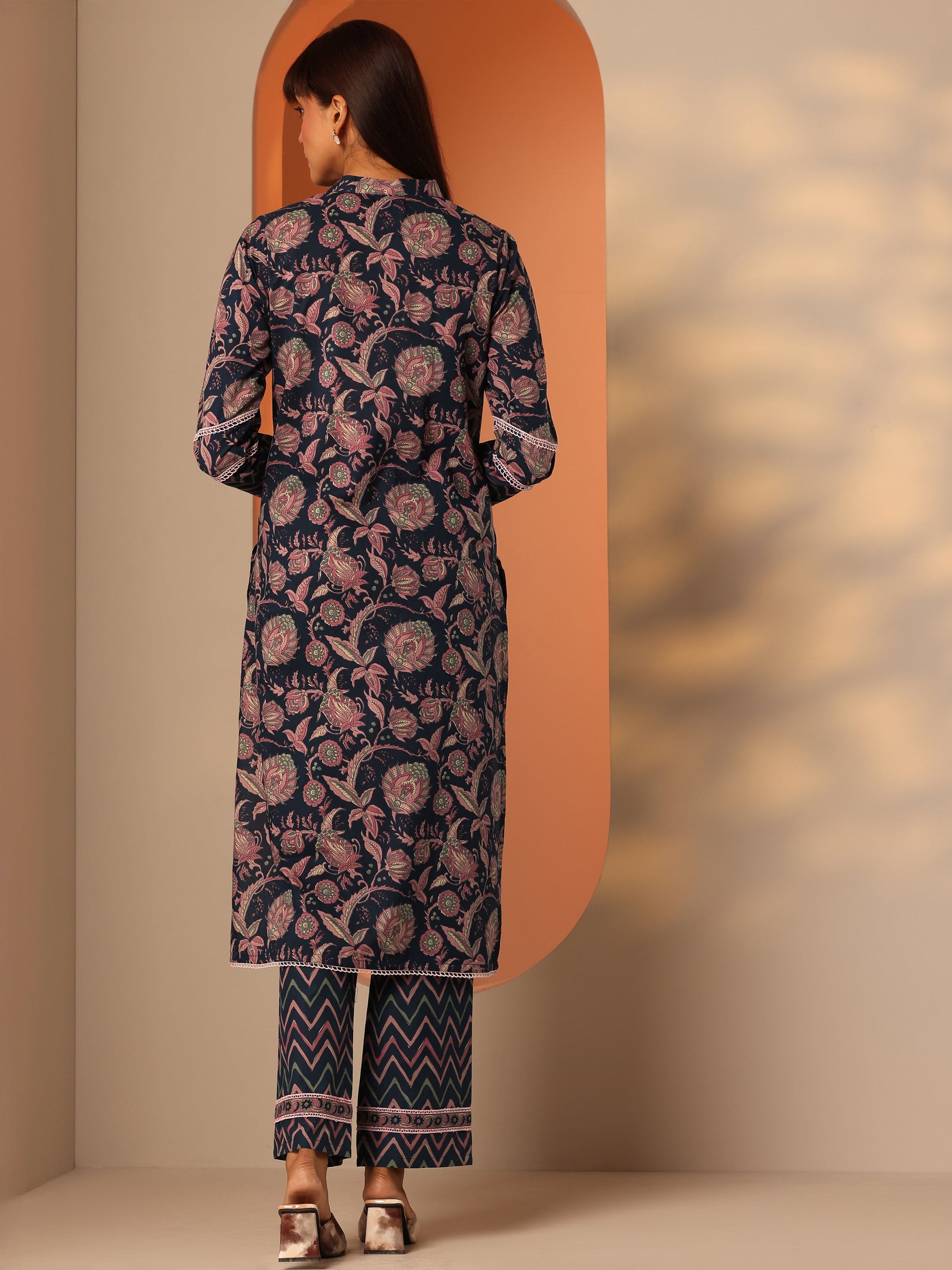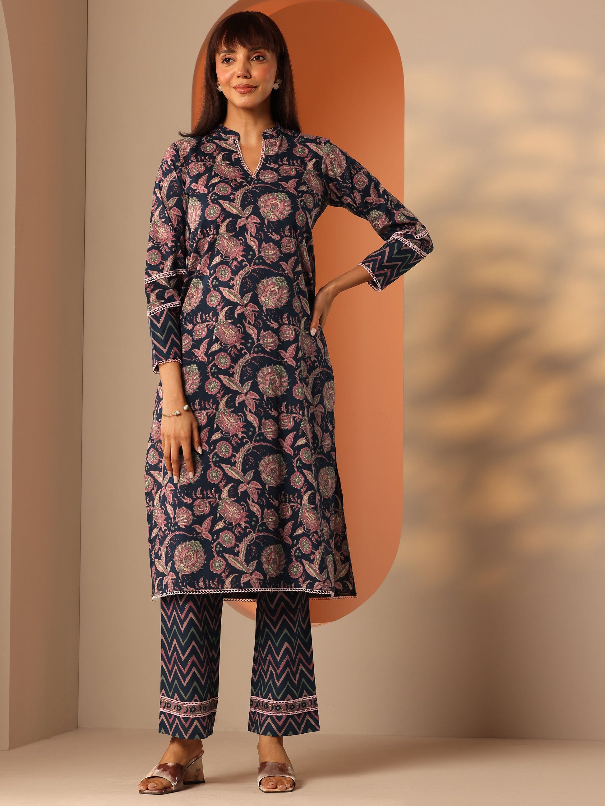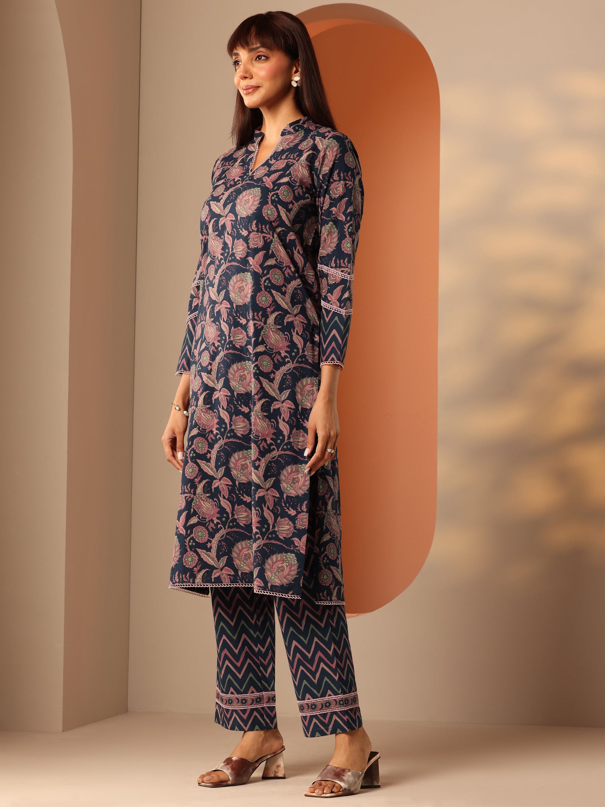 Our 2-Piece Navy Blue Cotton Straight-Fit Features A Notched Neckline, Regular Sleeves, And Statement Yoke. Complemented With Straight Pants With A Partially Elasticated Waistband And 2 Pockets. Adorned With Floral Printed, This Style Is Perfect For Casual Wear.