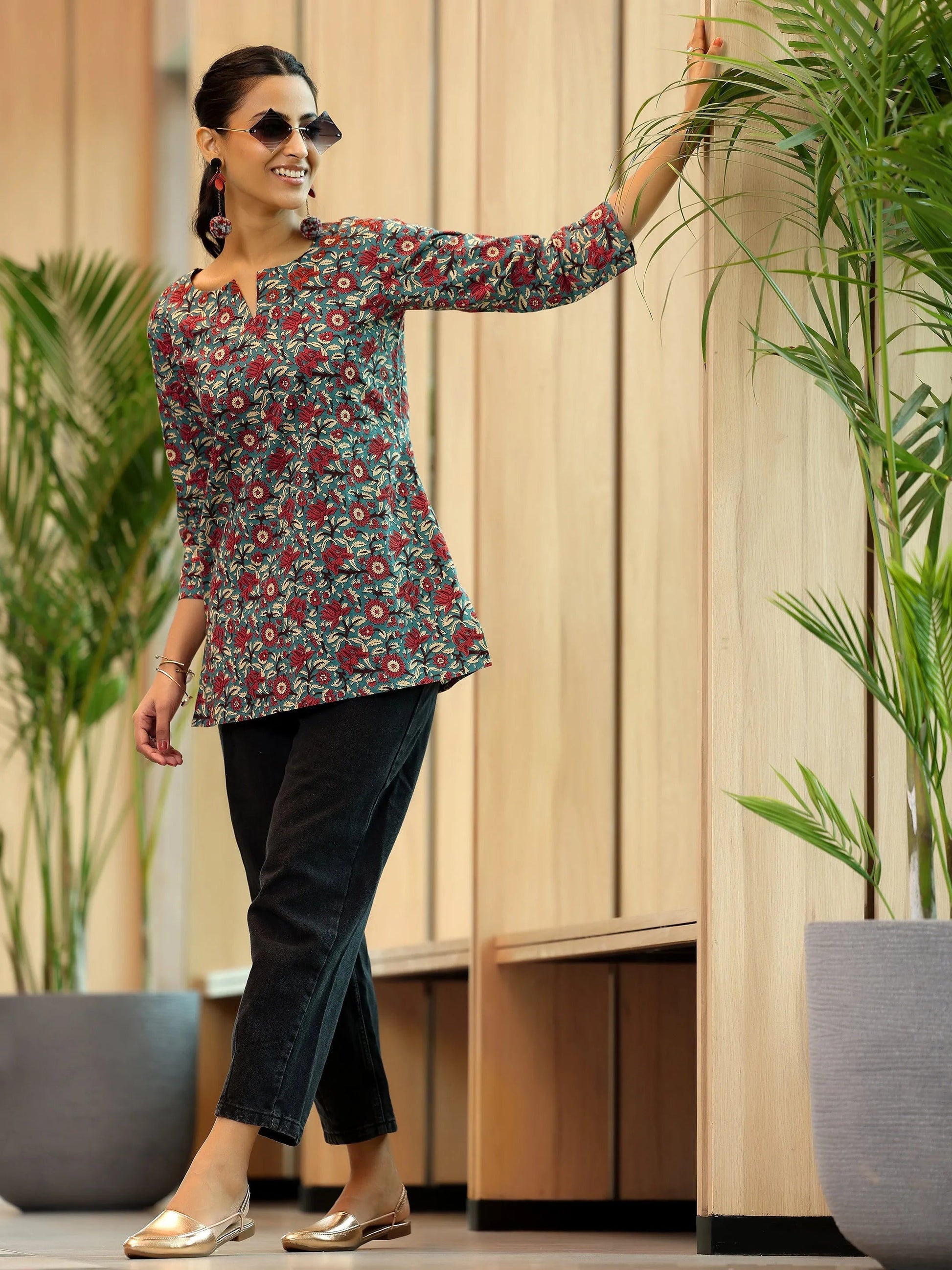 Our blue printed straight-fit kurti, crafted in cotton fabric, features a notched neckline and three-quarter sleeves. Highlighted with floral prints, this style is perfect for casual outings.
