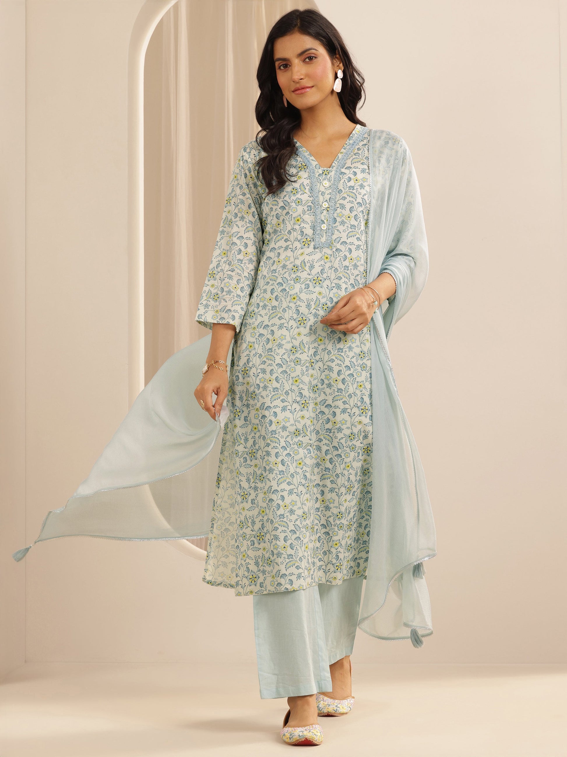 Blue Printed Cotton Straight Suit Set With Dupatta