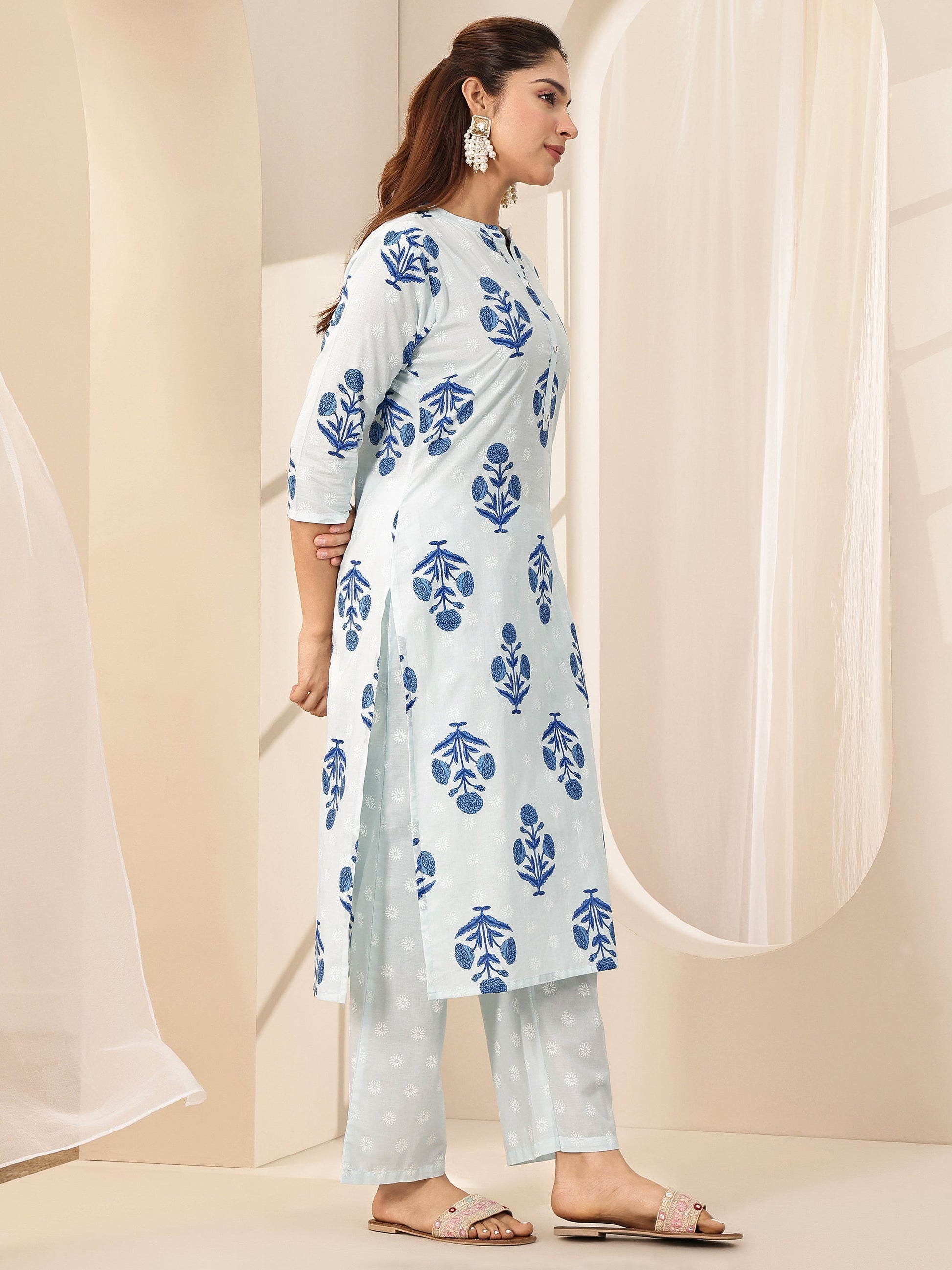 Blue Printed Cotton Straight Suit Sets With Dupatta