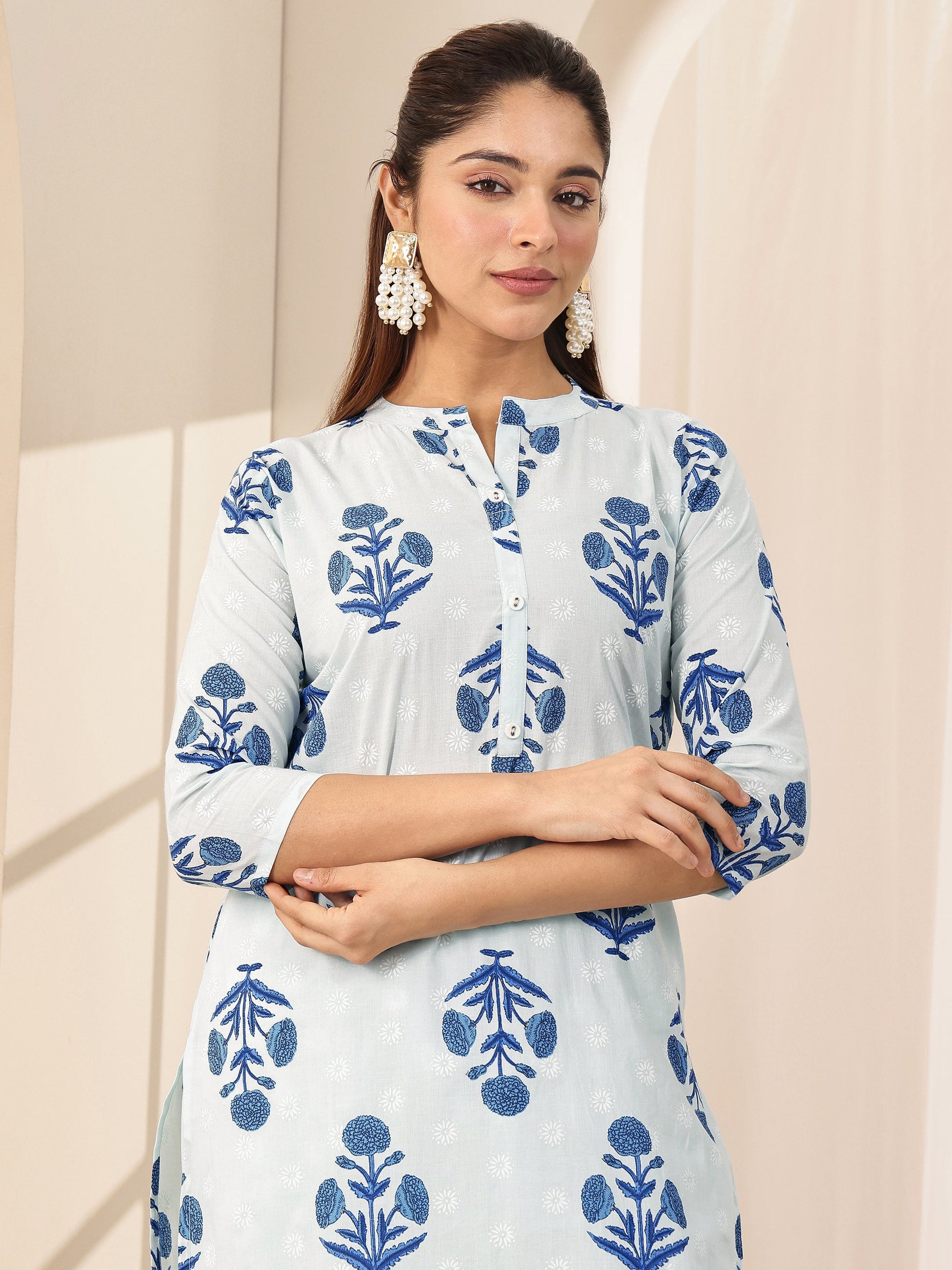 Our 3-piece blue and white cotton straight-fit kurta set features a mandarin collar neckline, regular sleeves, and a statement yoke. Complemented with straight pants with an elasticated waistband and a printed dupatta. Adorned with floral prints, this style is perfect for casual occasions.