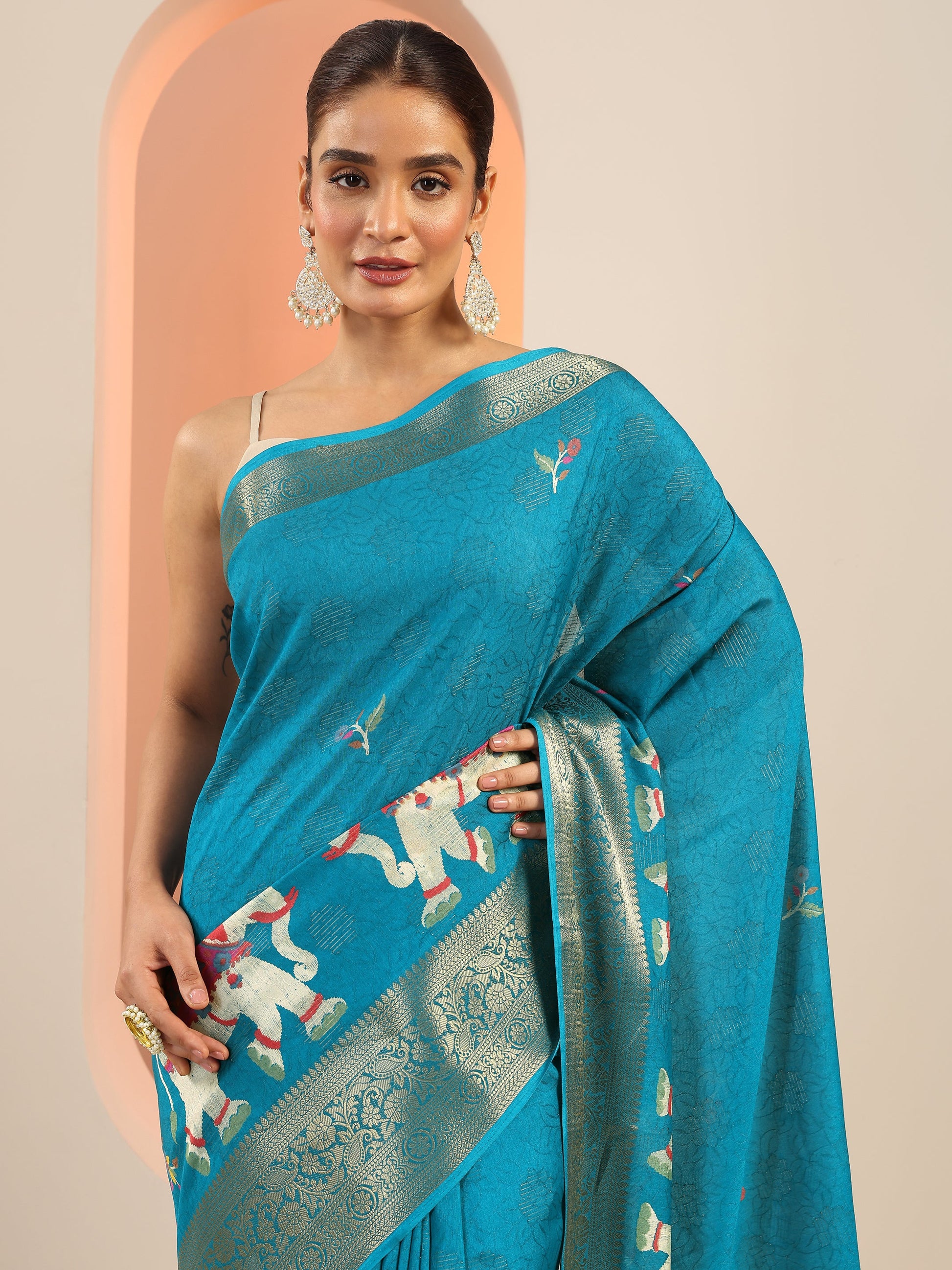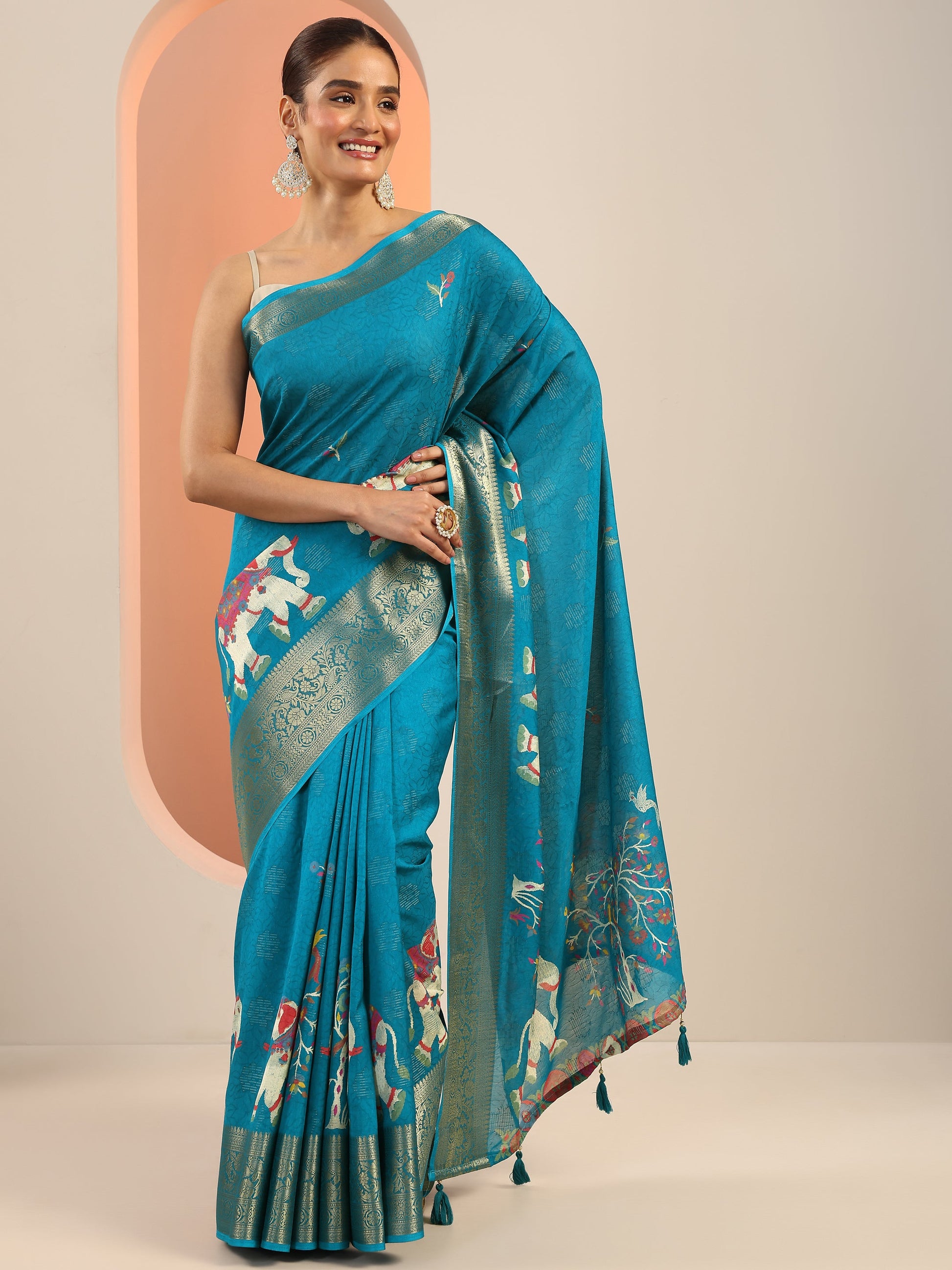 Our Turquoise Blue Printed Georgette Saree Features Captivating Tribal Printed Design. Complemented With An Unstitched Blouse Piece. This Charming Saree Is Perfect For Festive Wear