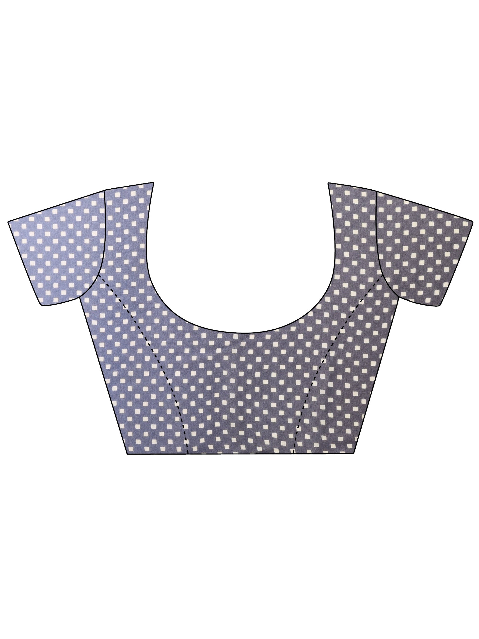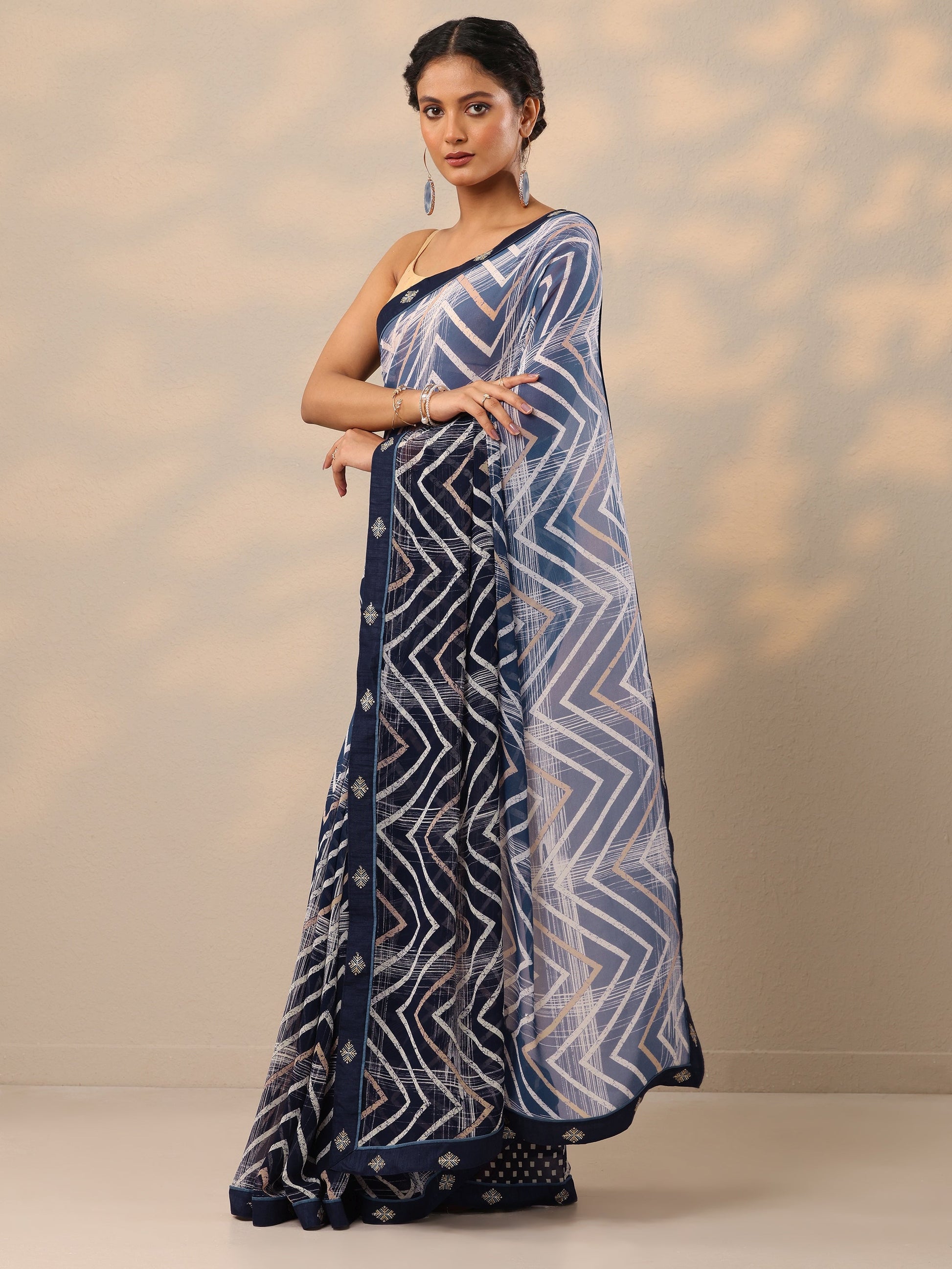 Our Navy Blue printed Georgette saree features captivating geometric print. Complemented with a unstitched blouse Piece. This charming saree is perfect for festive occasions