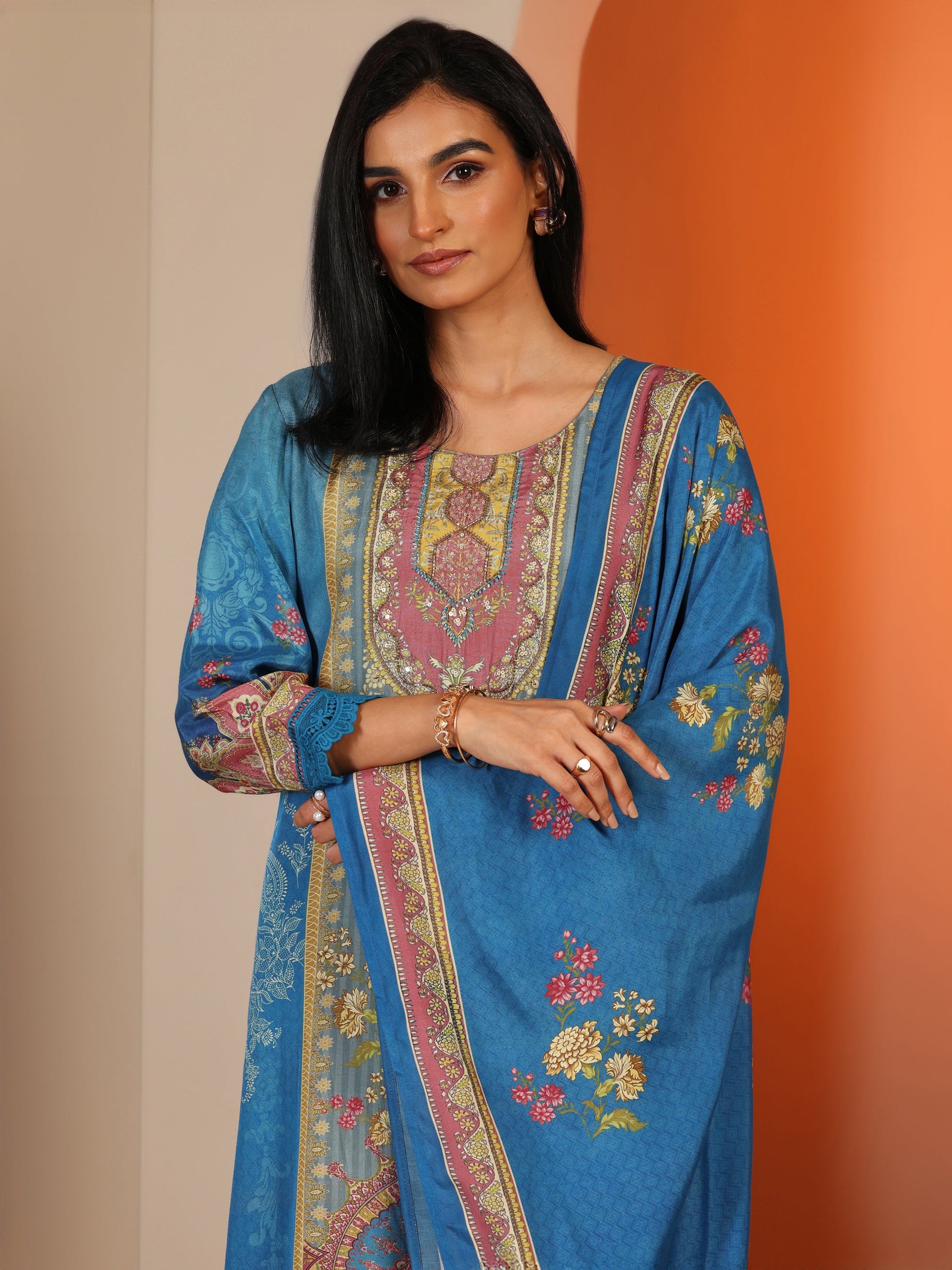 Blue Printed Muslin Straight Suit Set With Dupatta