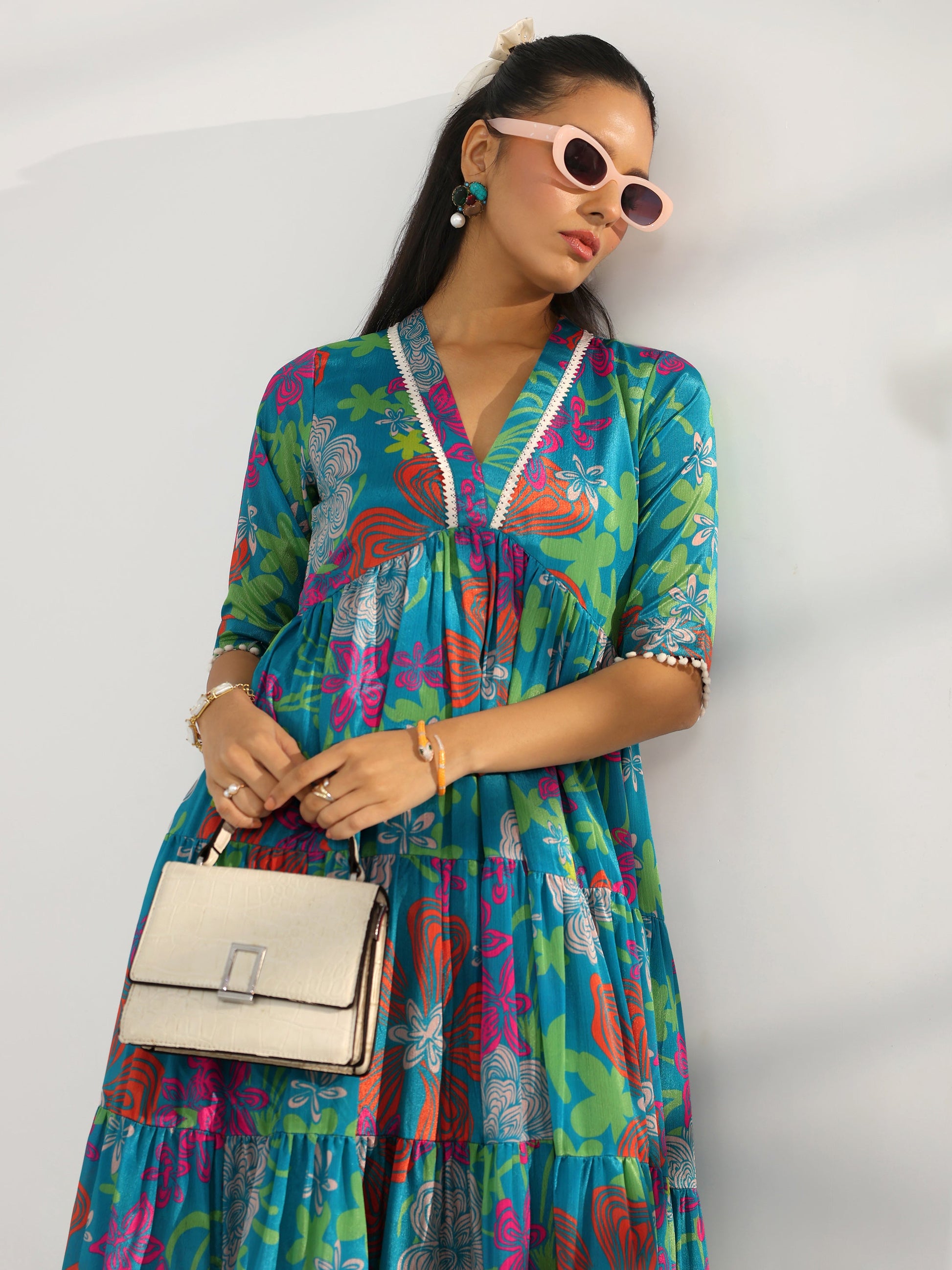 Blue Printed Silk Blend Fit And Flare One Piece Dress