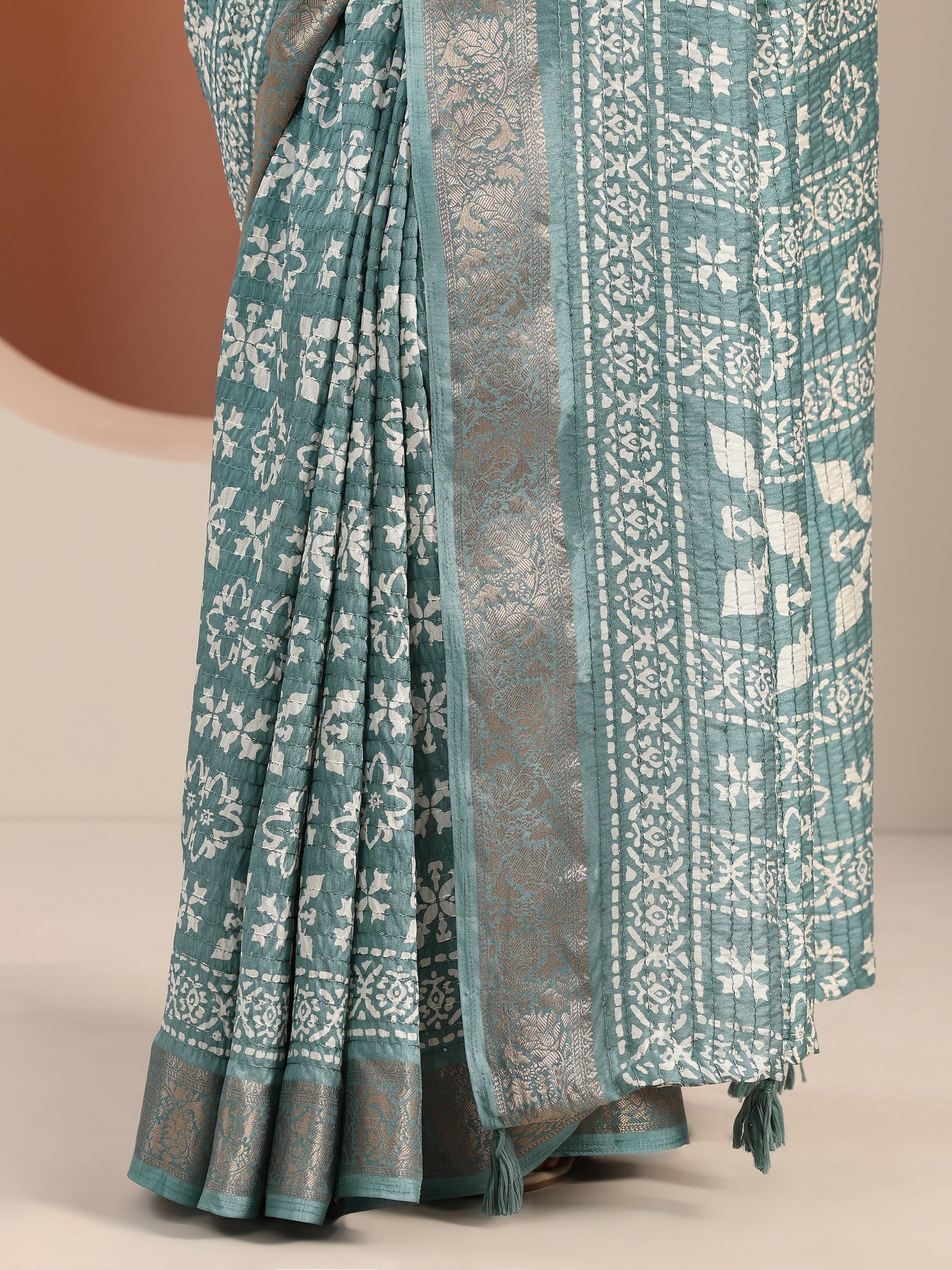Our Teal Printed Silk Blend Saree Features Captivating Ethnic Motif Printed Design. Complemented With A Unstitched Blouse Piece. This Charming Saree Is Perfect For Festive Wear.