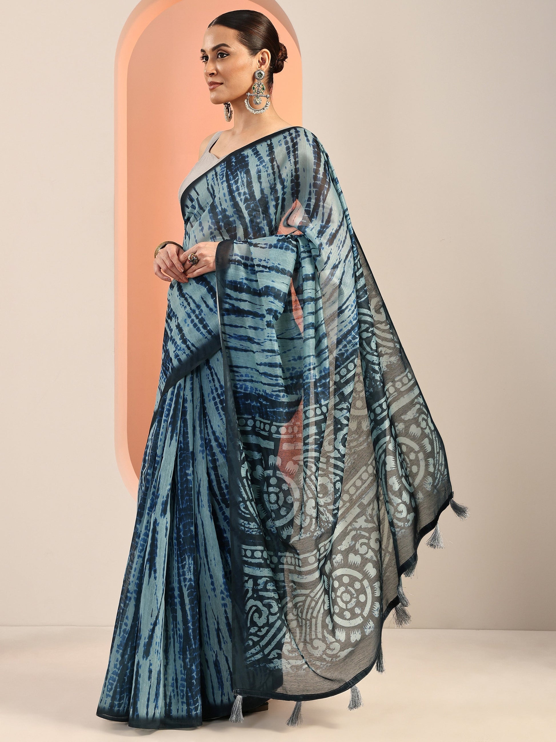 Our Blue Printed Silk Blend Saree Features Captivating Abstract Printed Design. Complemented With An Unstitched Blouse Piece. This Charming Saree Is Perfect For Festive Wear