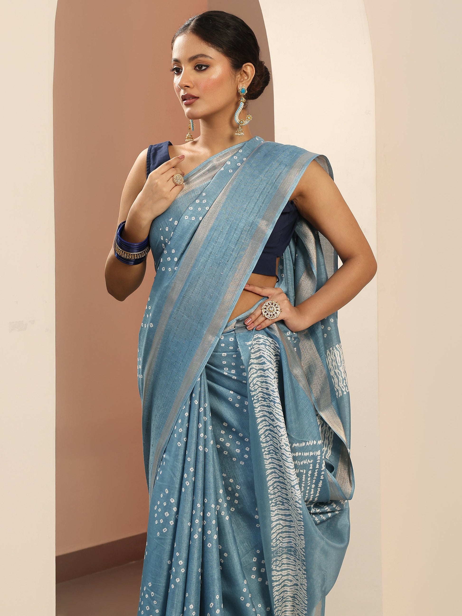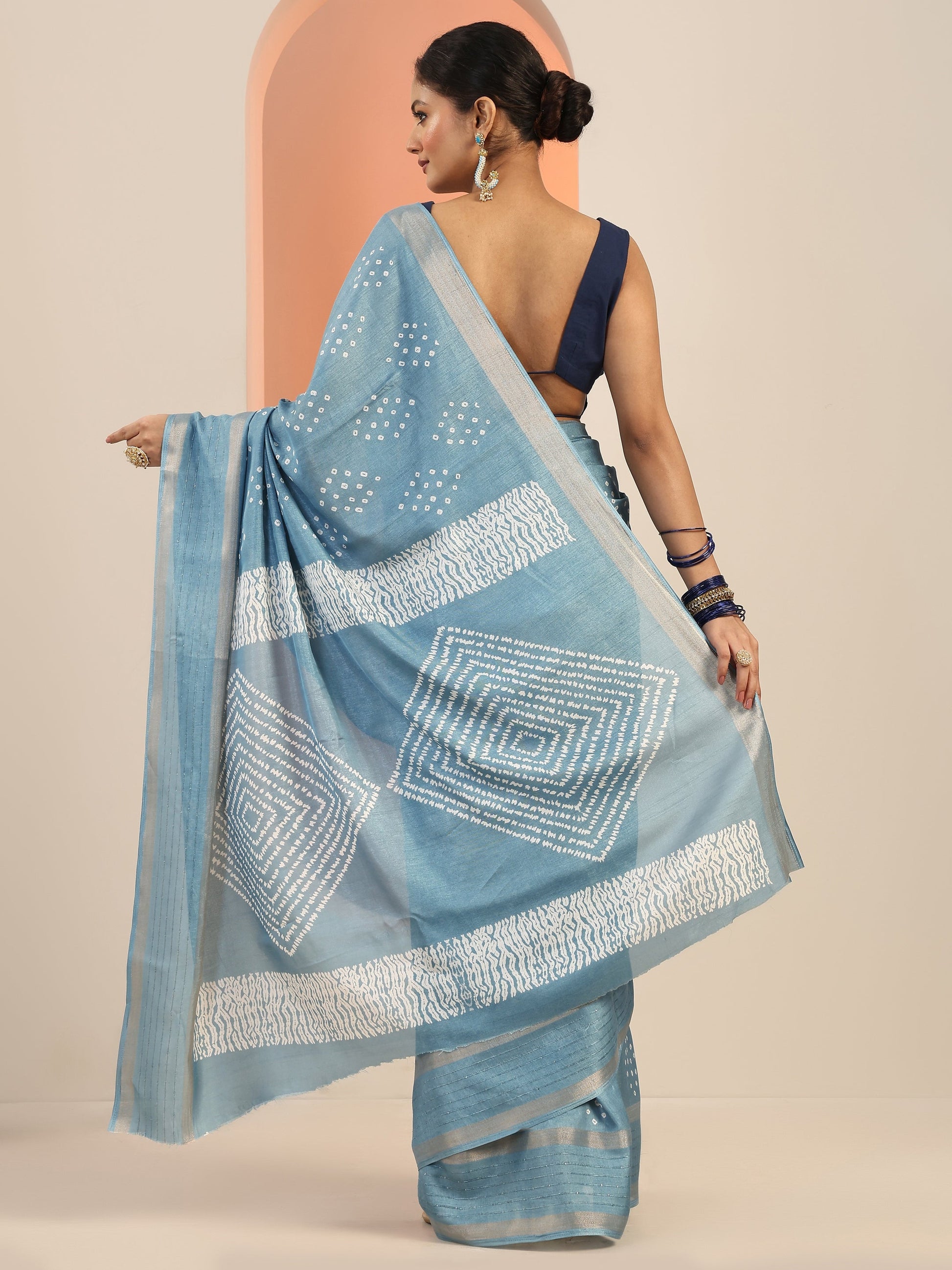 Our Turquoise Blue Printed Silk Blend Saree Features Captivating Bandhani Printed Design. Complemented With An Unstitched Blouse Piece. This Charming Saree Is Perfect For Festive Wear