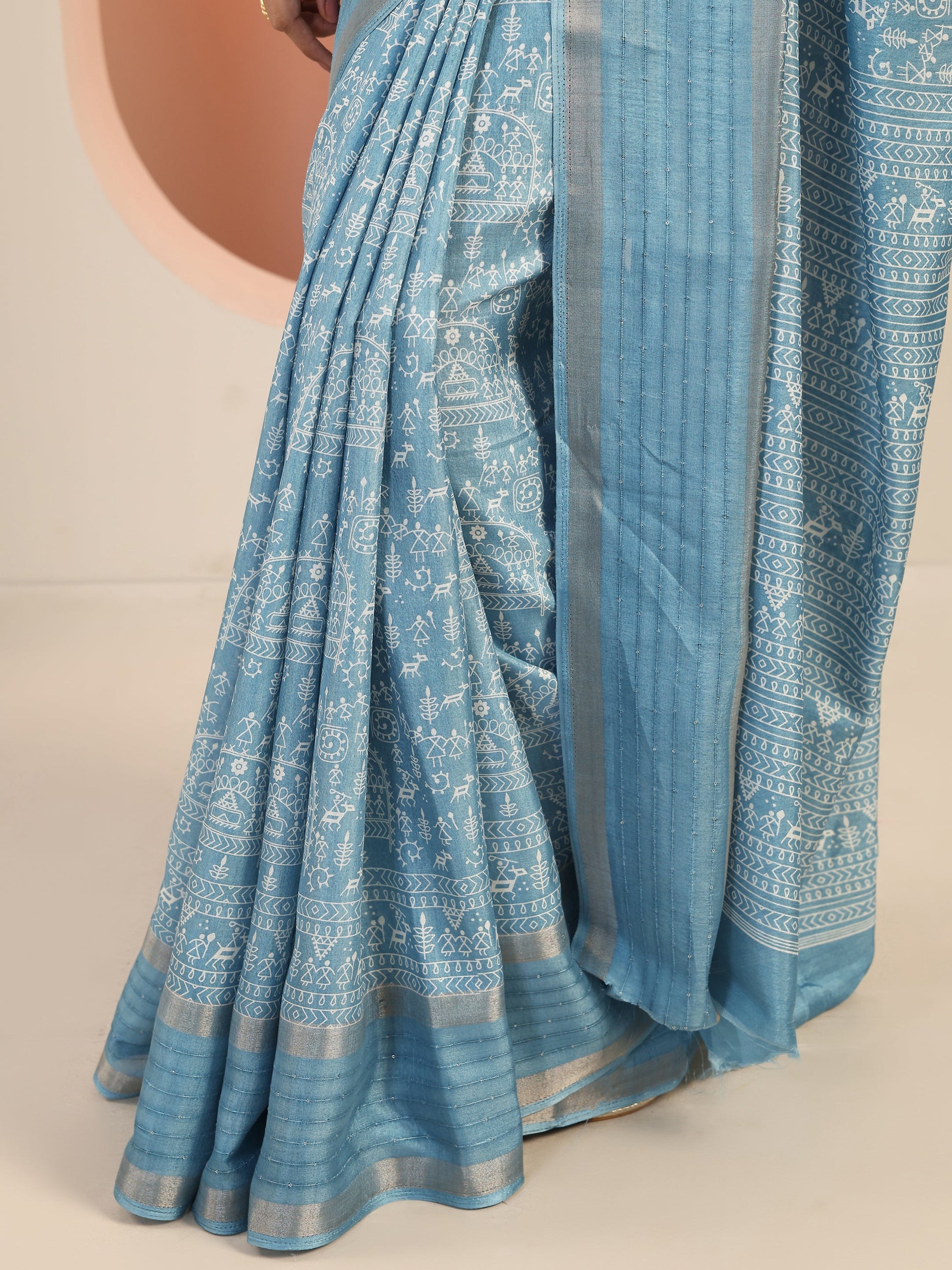 Our Turquoise Blue Printed Silk Blend Saree Features Captivating Tribal Printed Design. Complemented With An Unstitched Blouse Piece. This Charming Saree Is Perfect For Festive Wear