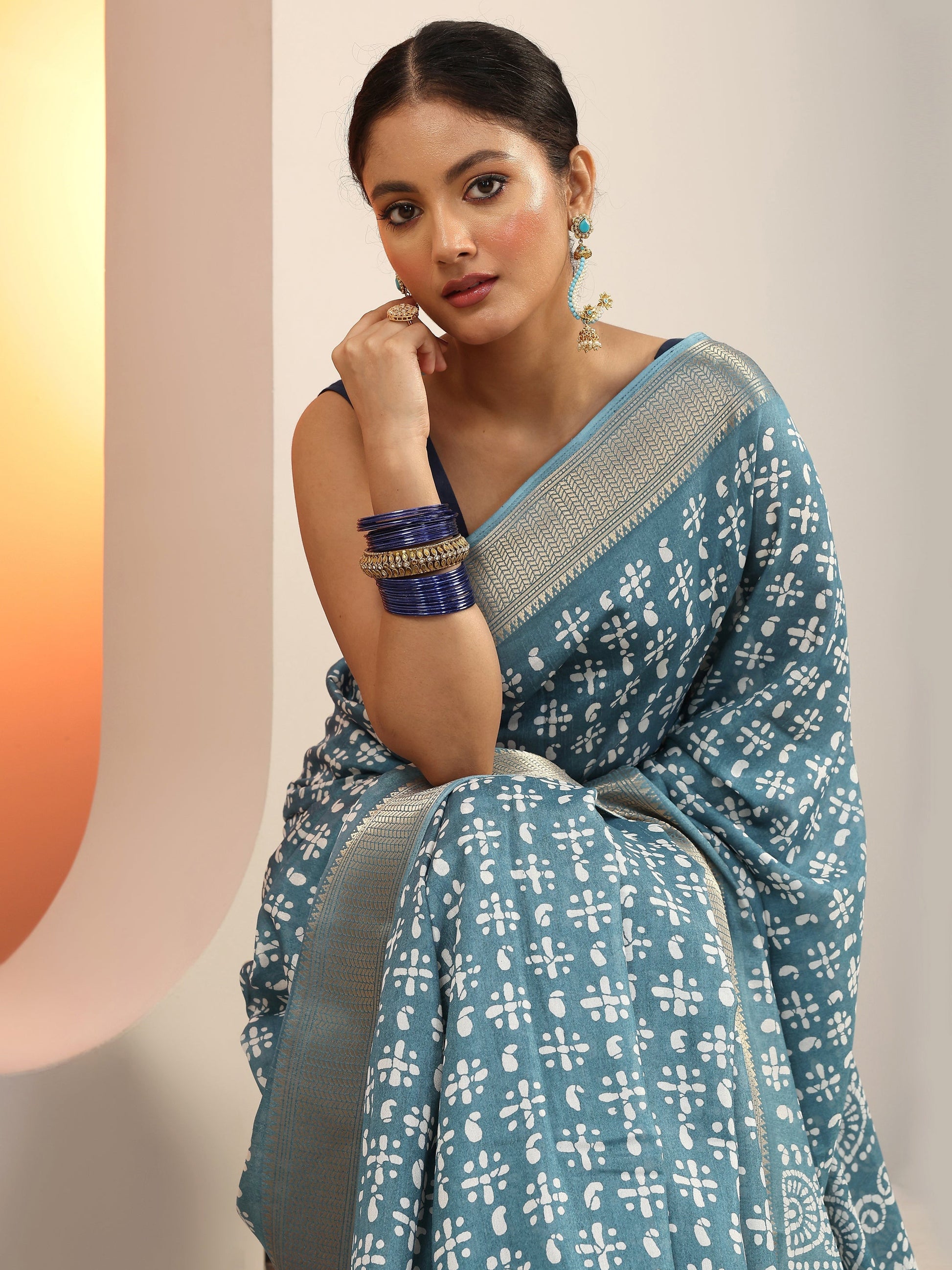 Our Turquoise Blue Printed Silk Blend Saree Features Captivating Ethnic Motif Printed Design. Complemented With An Unstitched Blouse Piece. This Charming Saree Is Perfect For Festive Wear