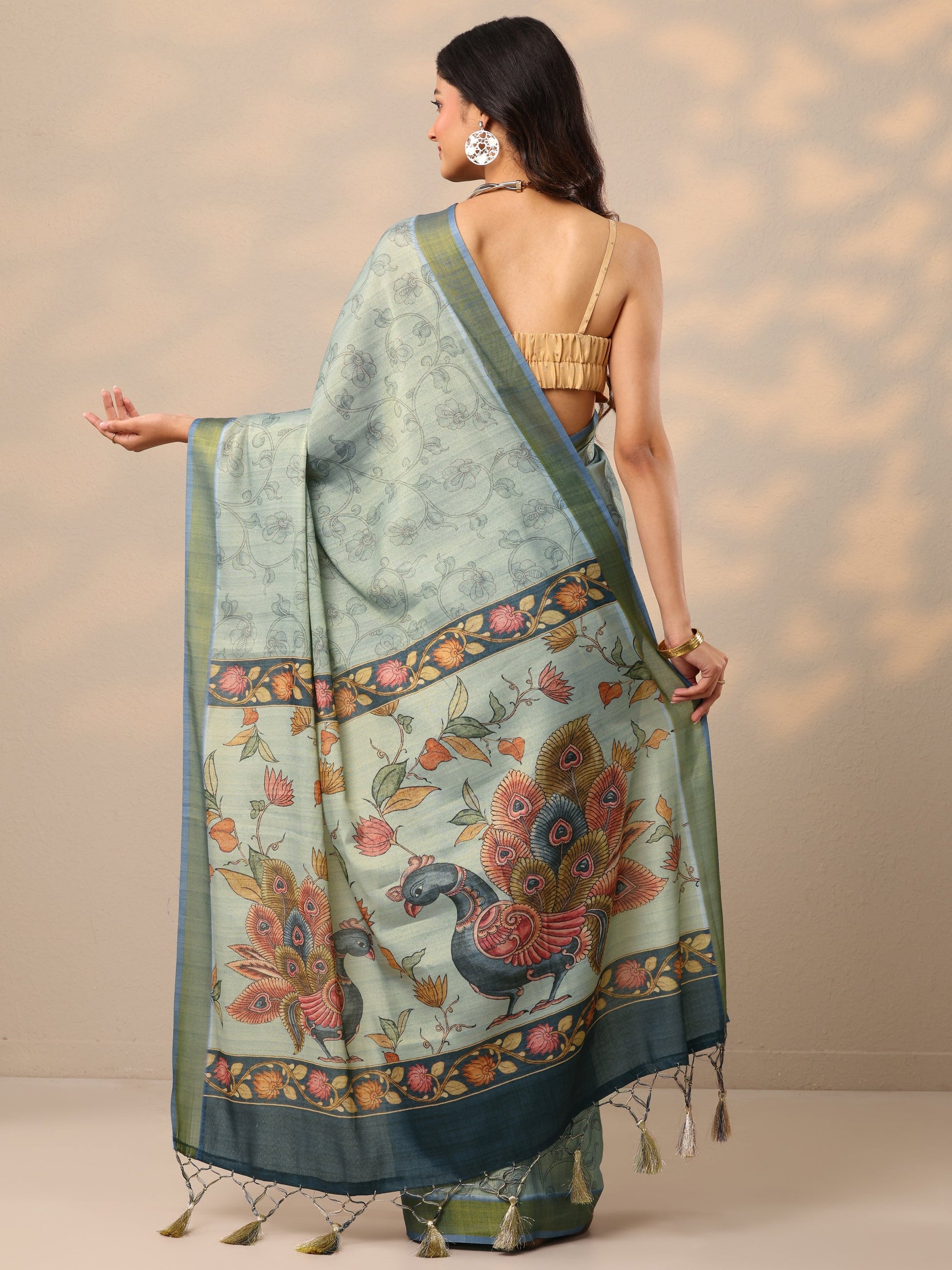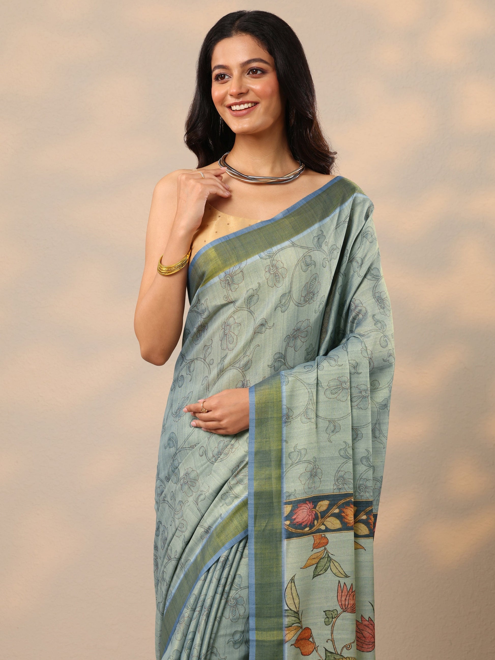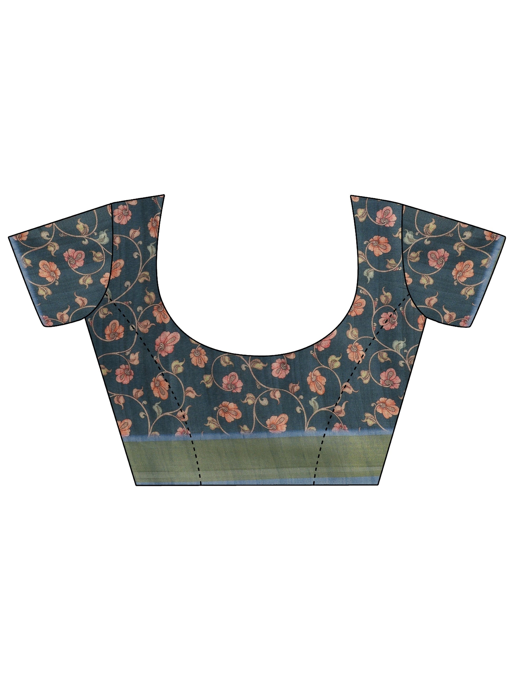 Blue Printed Silk Blend Sarees With Unstitched Blouse Piece