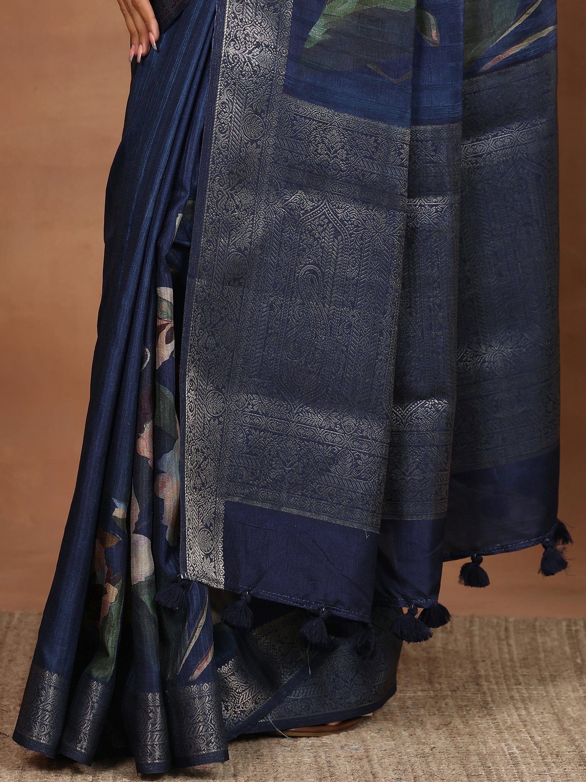 Blue Printed Silk Blend Sarees With Unstitched Blouse Piece