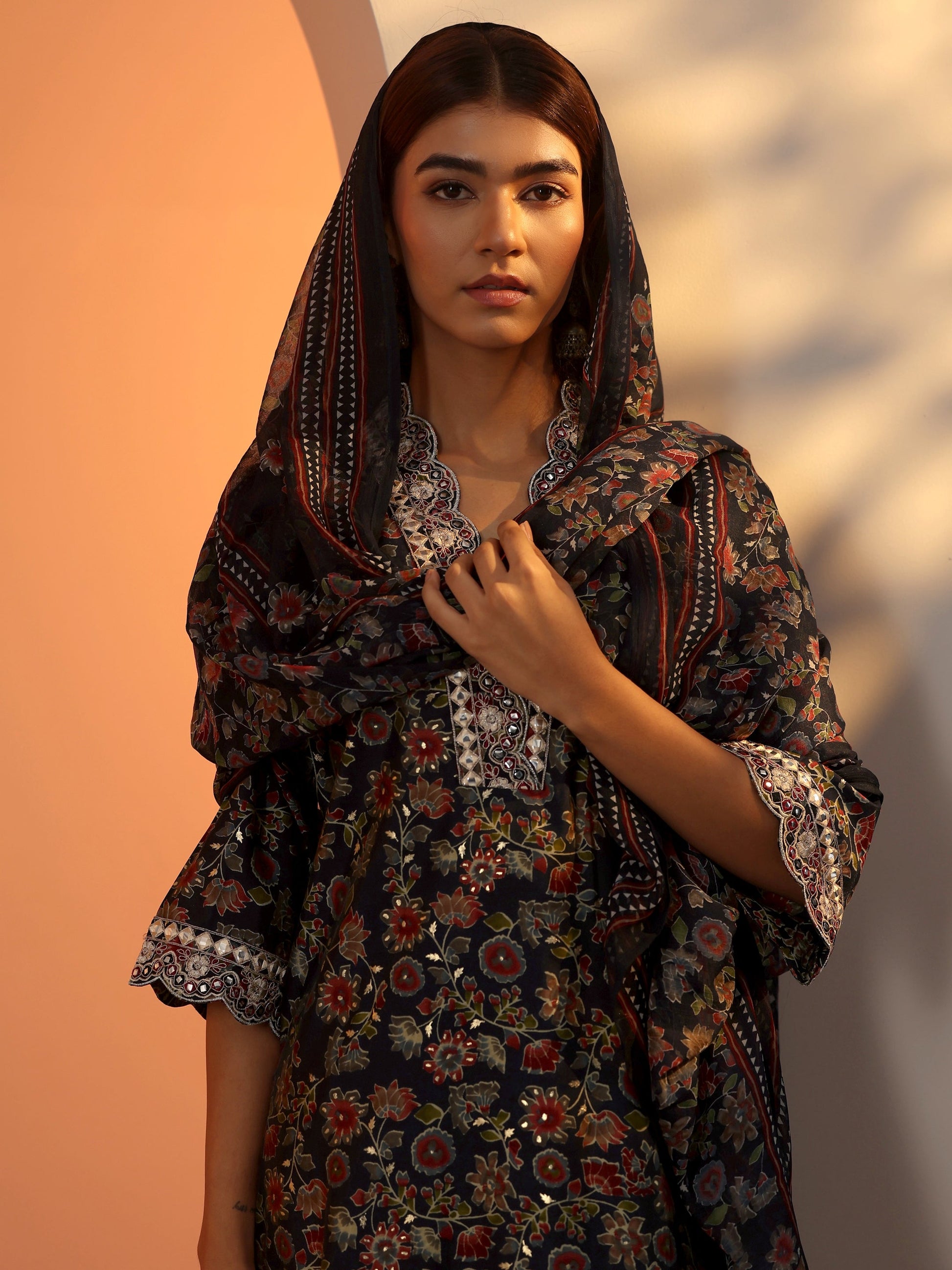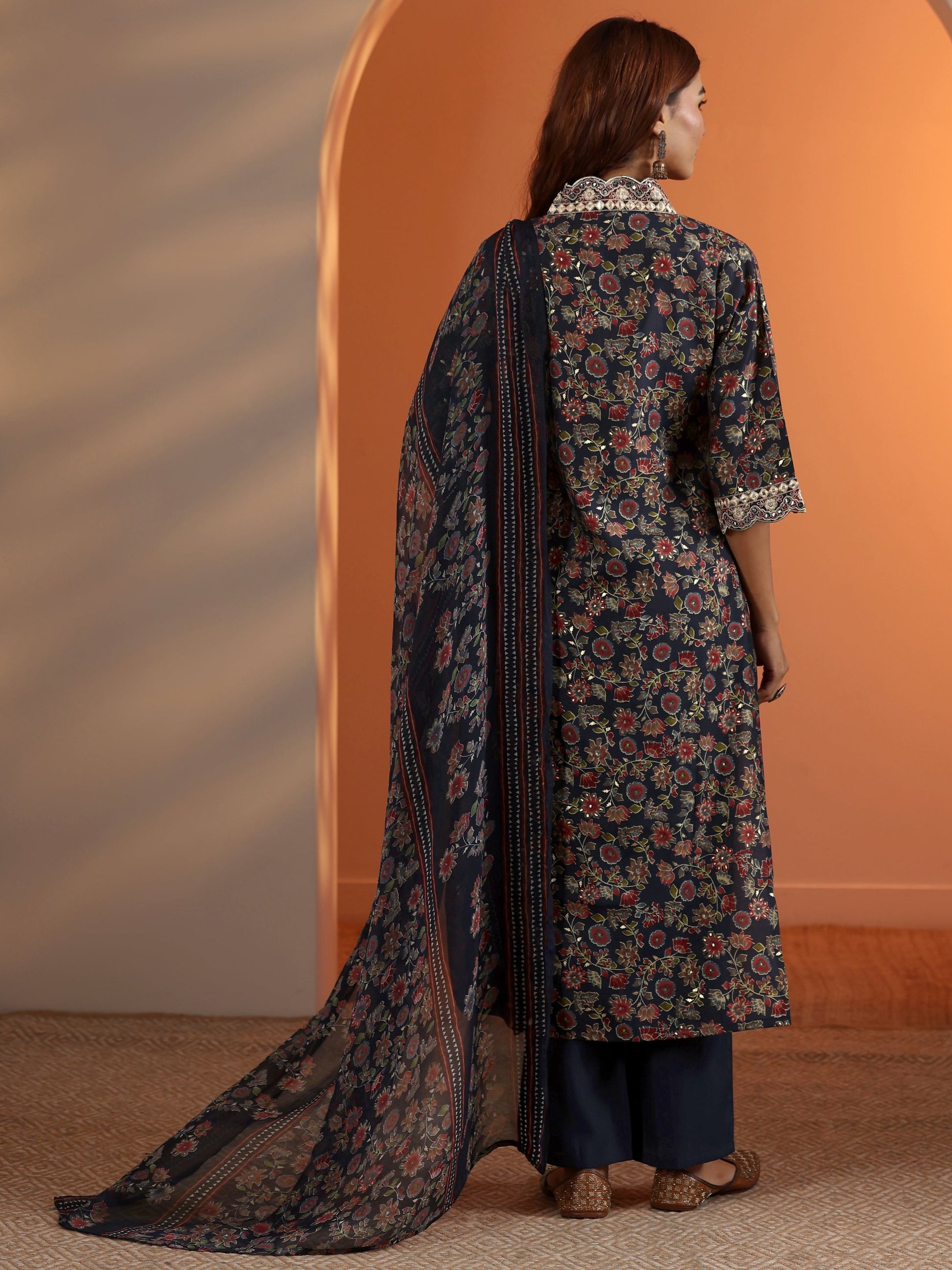 Our 3-piece Navy Blue Silk blend Kurta Set features a V-Neckline, Regular Sleeves, and statement yoke. Complemented with Straight Pants with a Partially Elasticated waistband and 2 pockets, and a Floral dupatta. Adorned with floral printed accents, this style is perfect for Dark Festive occasions.