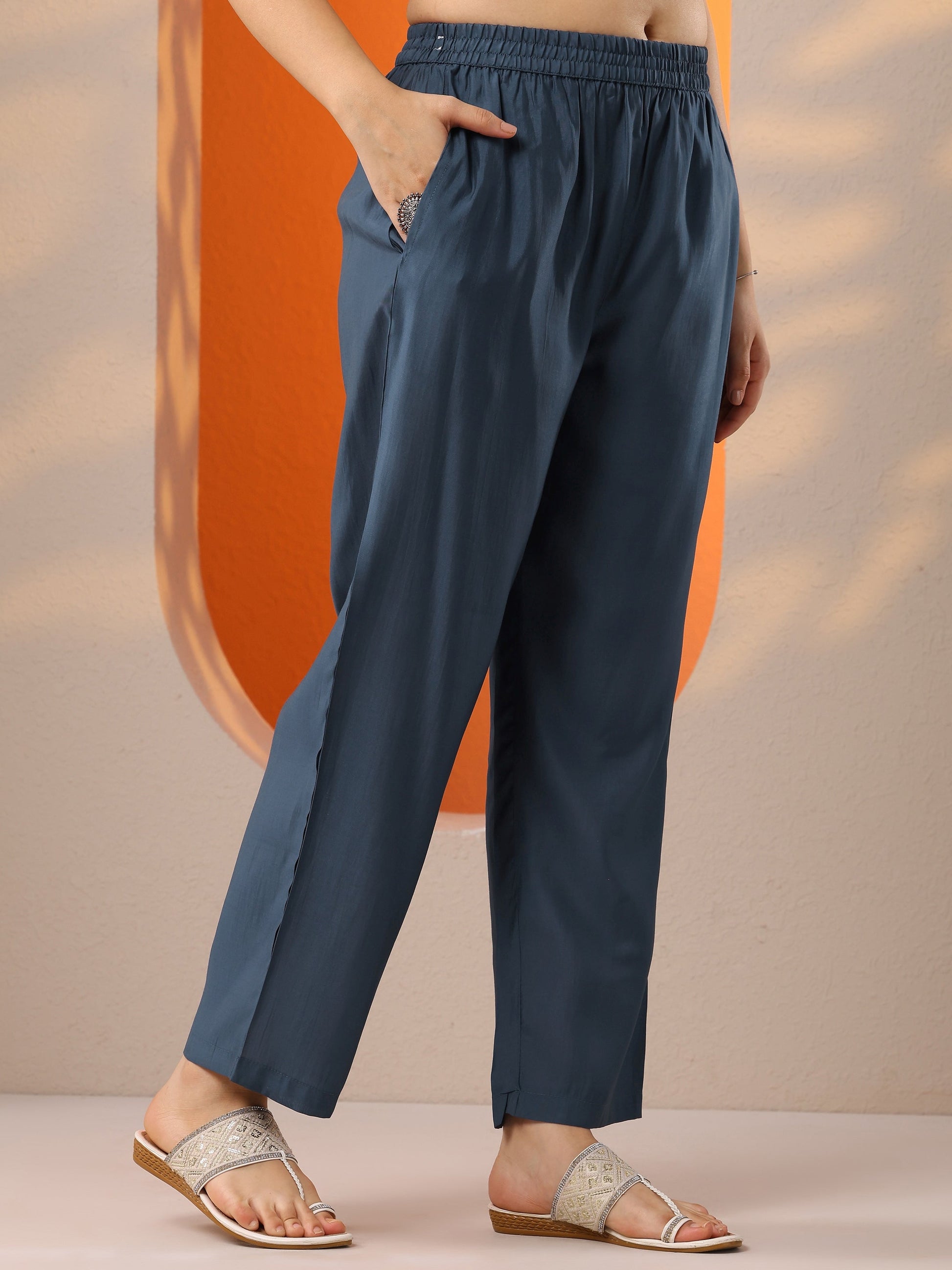 Our 3-piece blue silk blend straight-fit kurta set features a sweetheart neck neckline, regular sleeves. Complemented with straight pants with a partially elasticated waistband and 2 pockets, and a printed dupatta. Adorned with floral accents, this style is perfect for festive occasions.