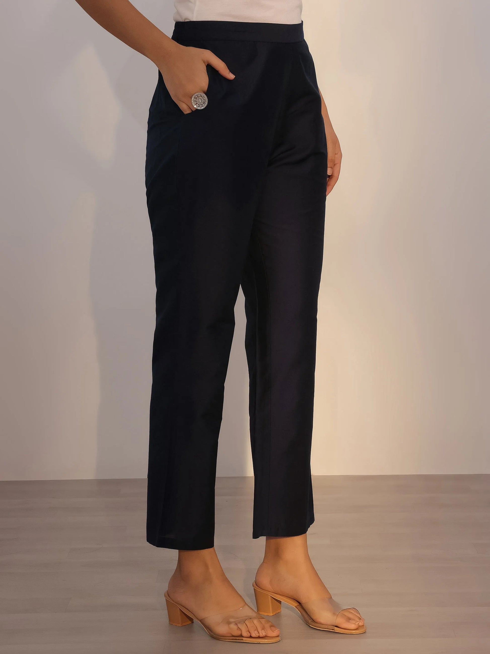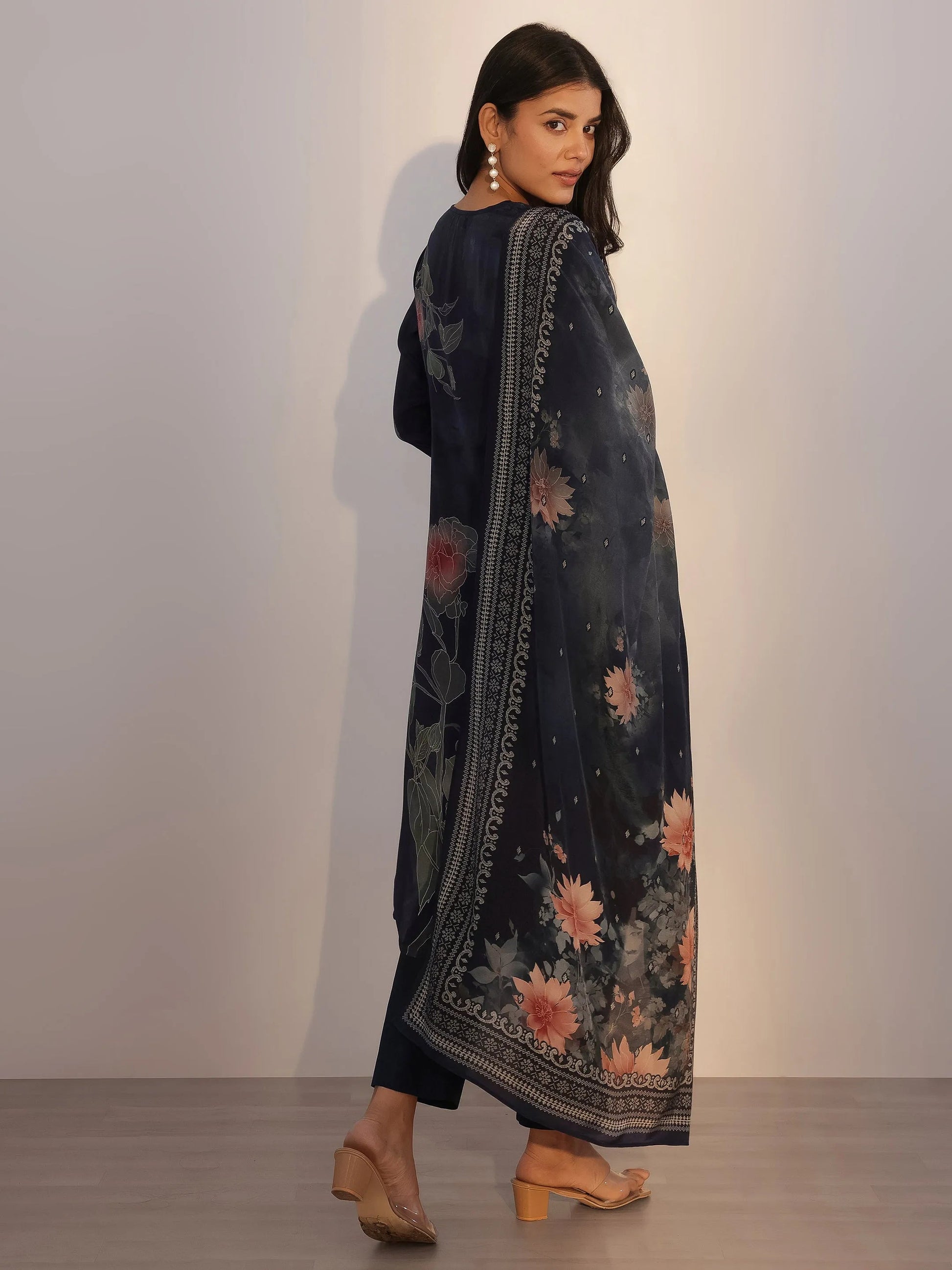 Our 3-piece navy blue printed silk blend straight suit set features a straight-fit kurta with a keyhole neckline and three-quarter sleeves. Adorned with matching straight pants with a partially elasticated waistband, roomy pockets, and a printed dupatta. Highlighted with floral prints, this charming style is perfect for elevated everyday wear.
