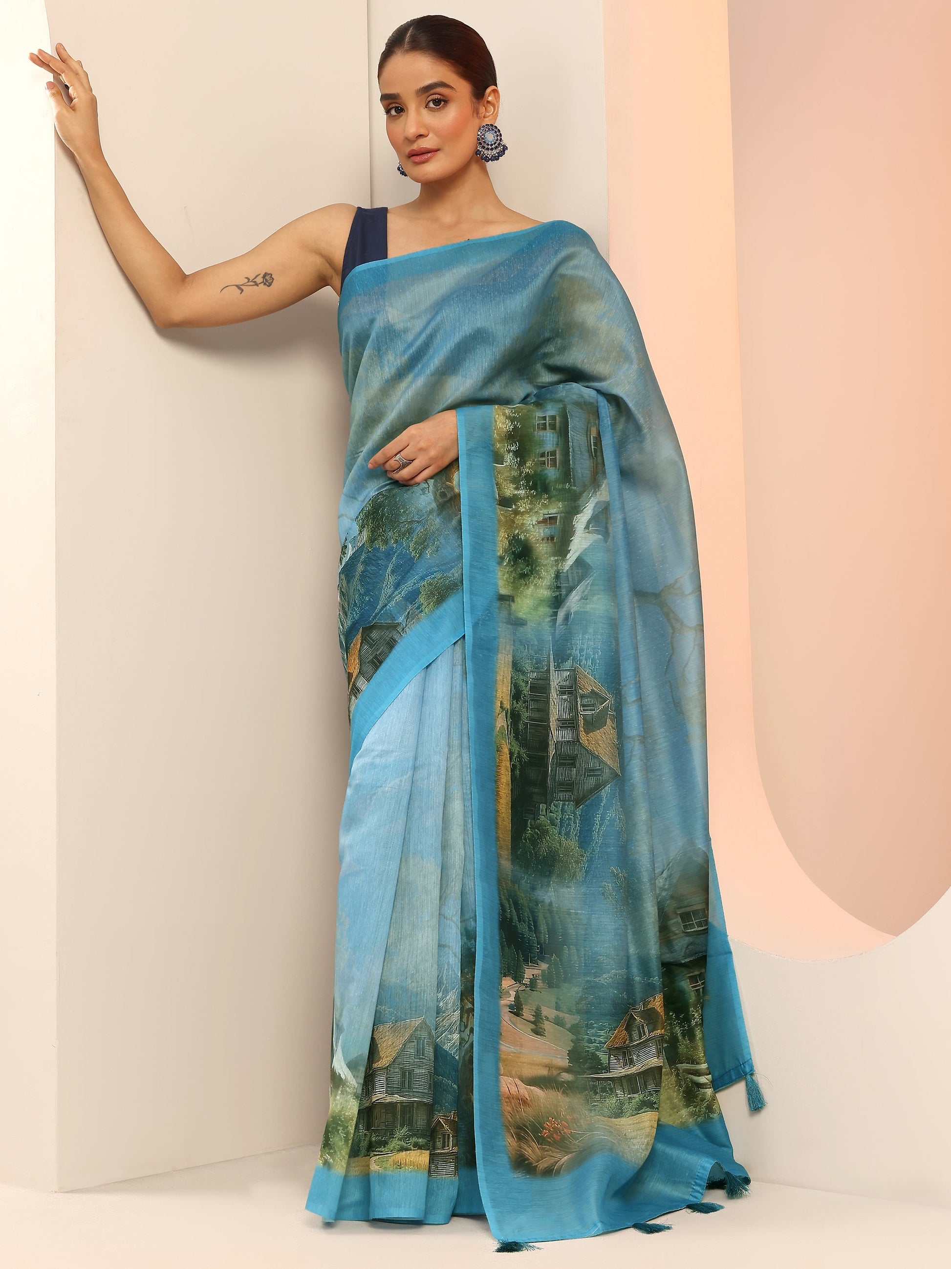Our Turquoise Blue Printed Silk Blend Saree Features Captivating Printed Design. Complemented With An Unstitched Blouse Piece. This Charming Saree Is Perfect For Festive Wear