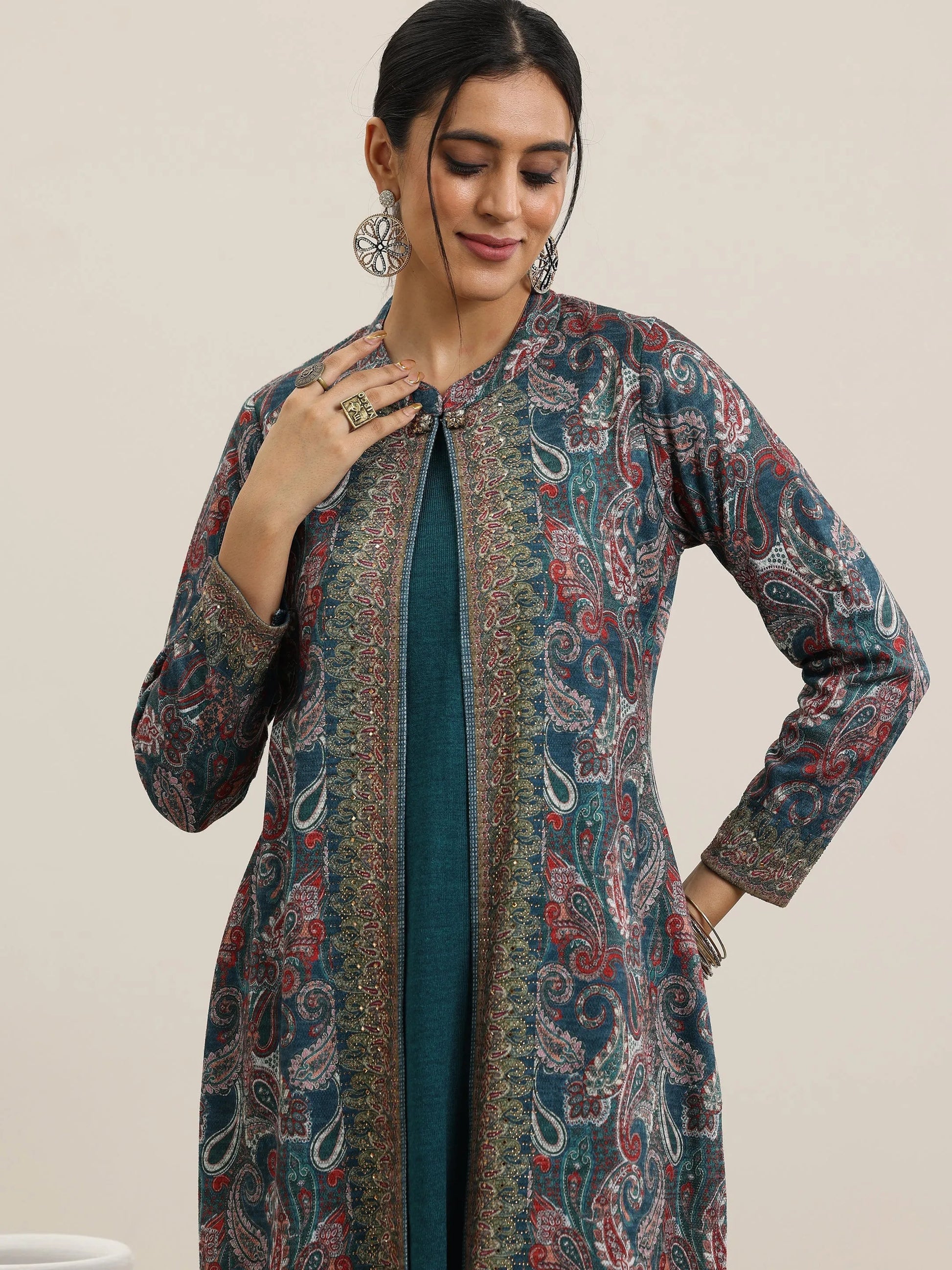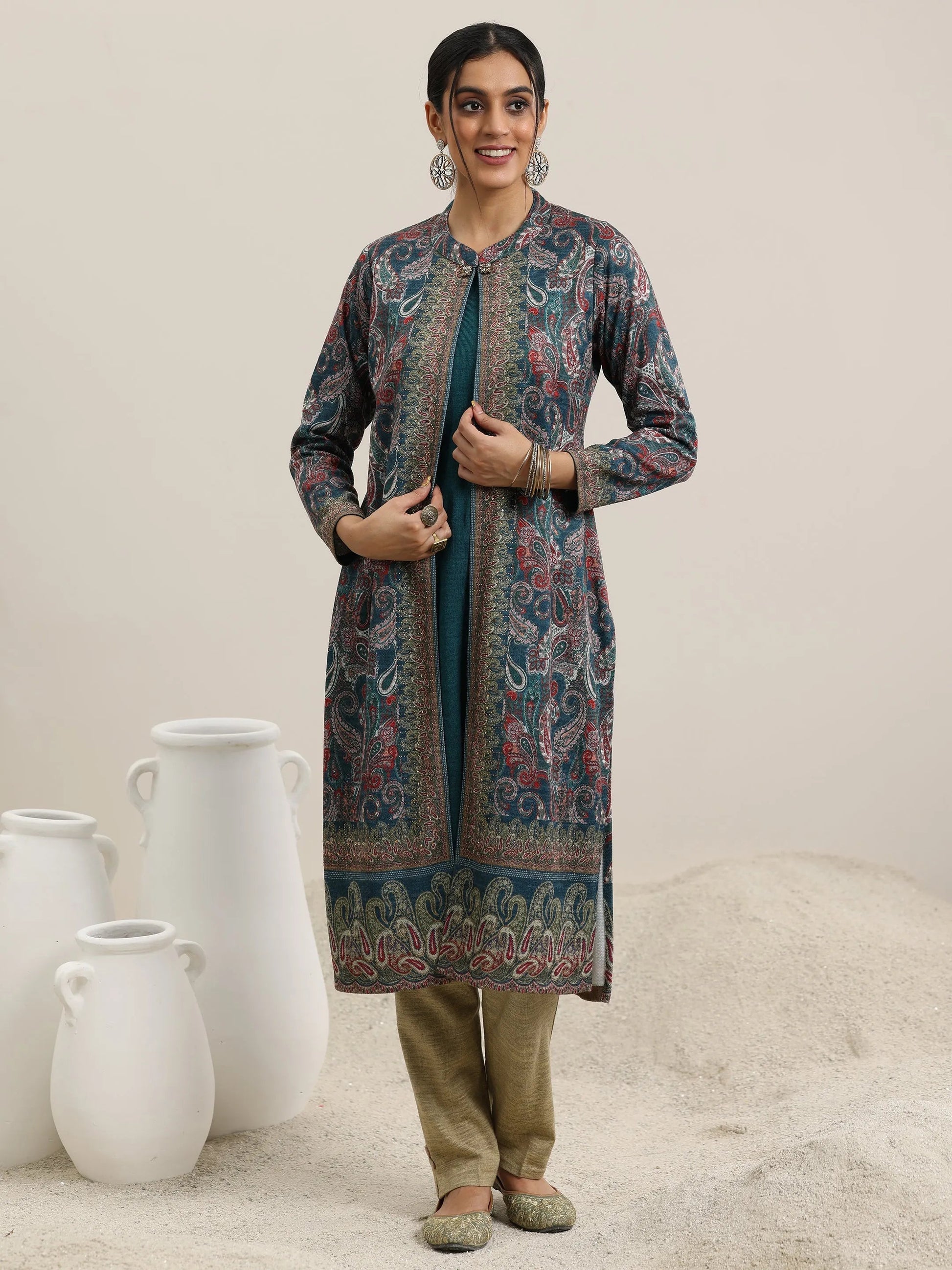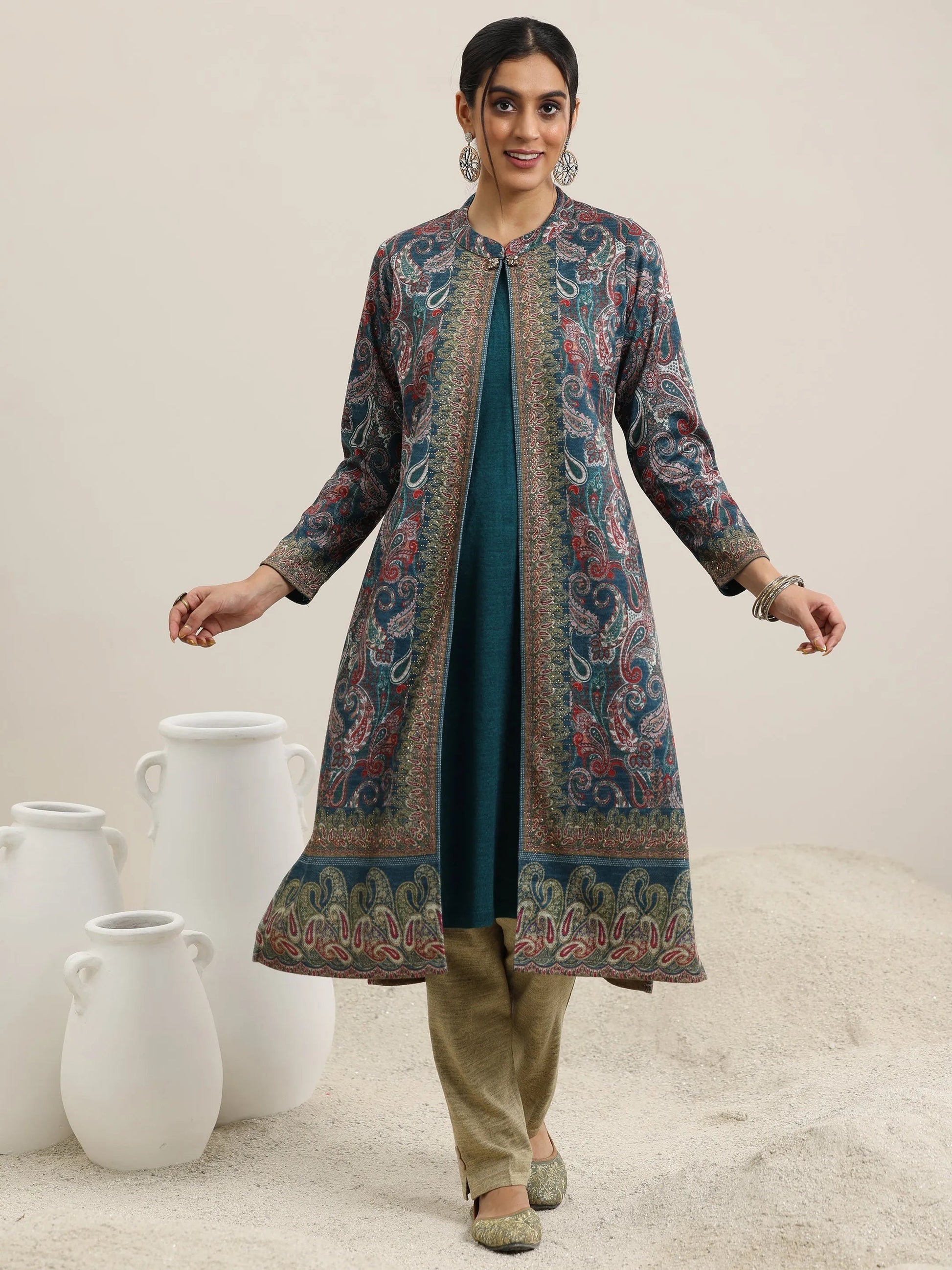 Our blue printed wool straight kurta features a round neckline and comfortable full sleeves. Layered with a printed jacket and elevated with stylish button accents, this style is perfect for festive celebrations.
