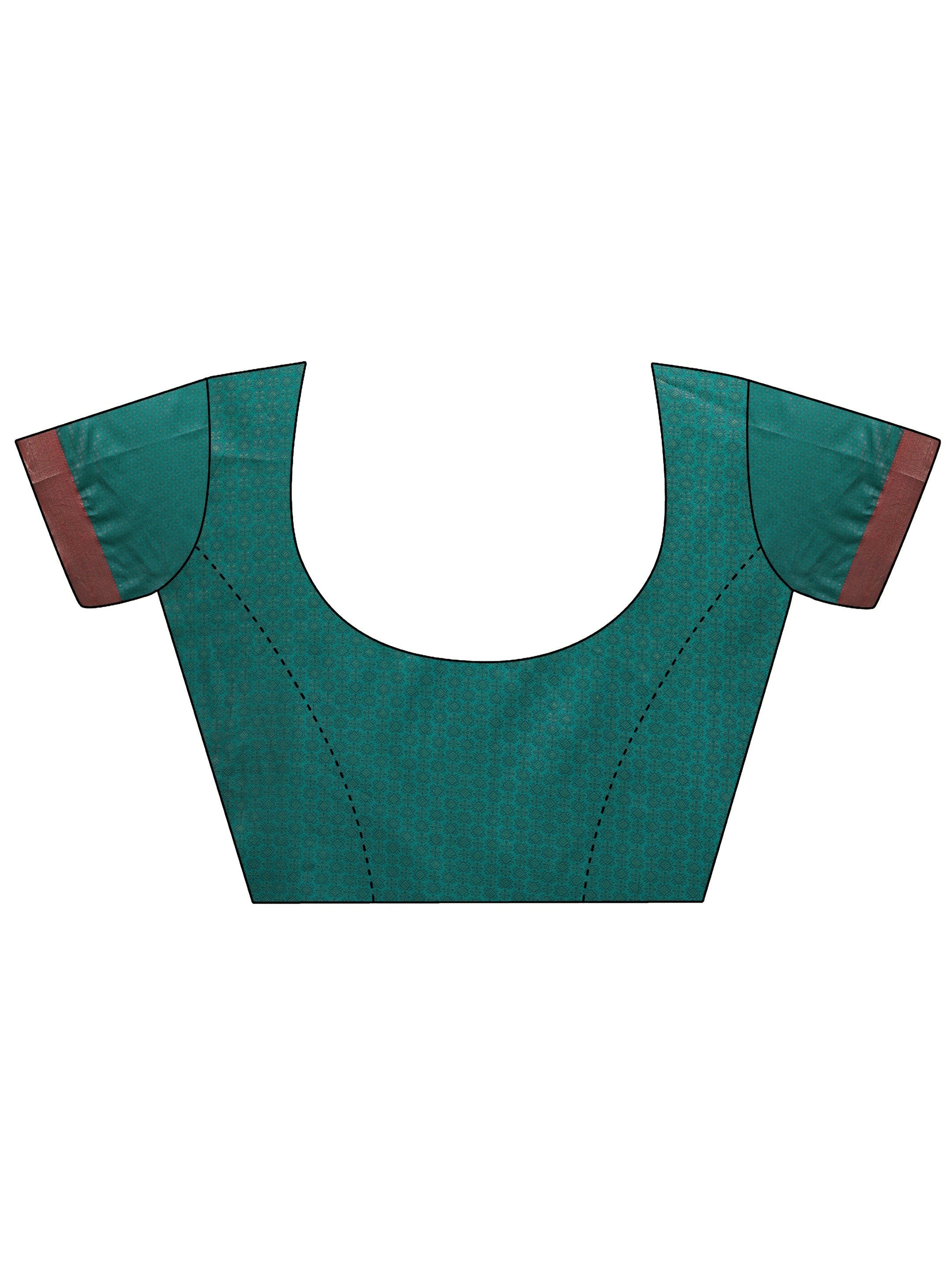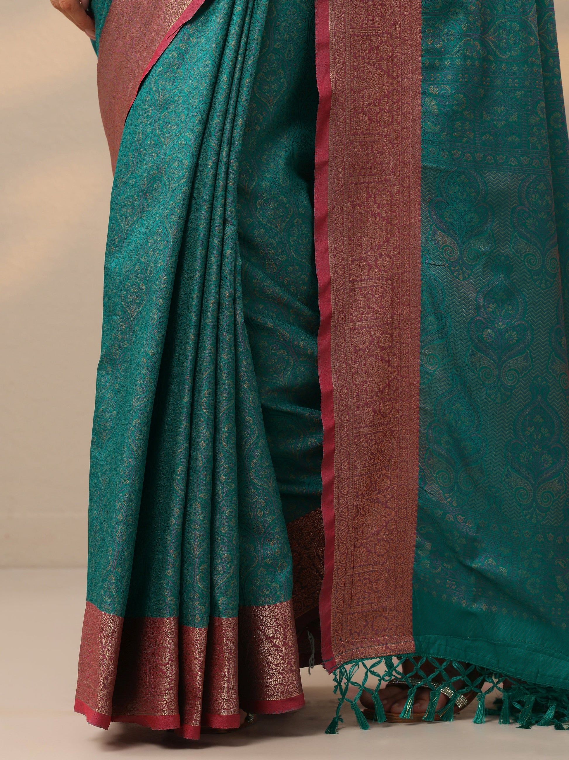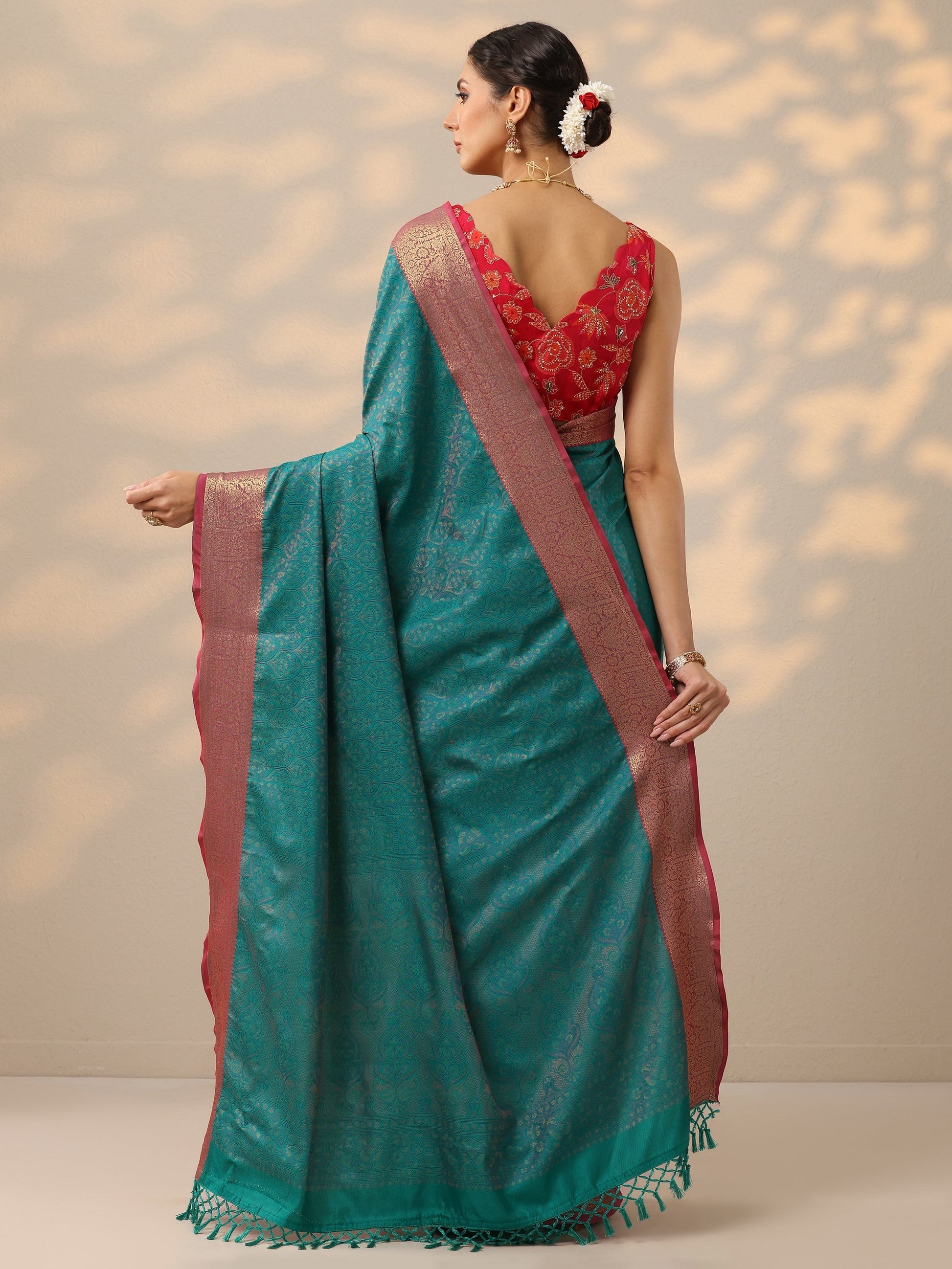 Our Teal Printed Silk Blend Saree Features Captivating Intricate Patterns. Complemented With An Unstitched Blouse Piece. This Charming Saree Is Perfect For Festive Occasions