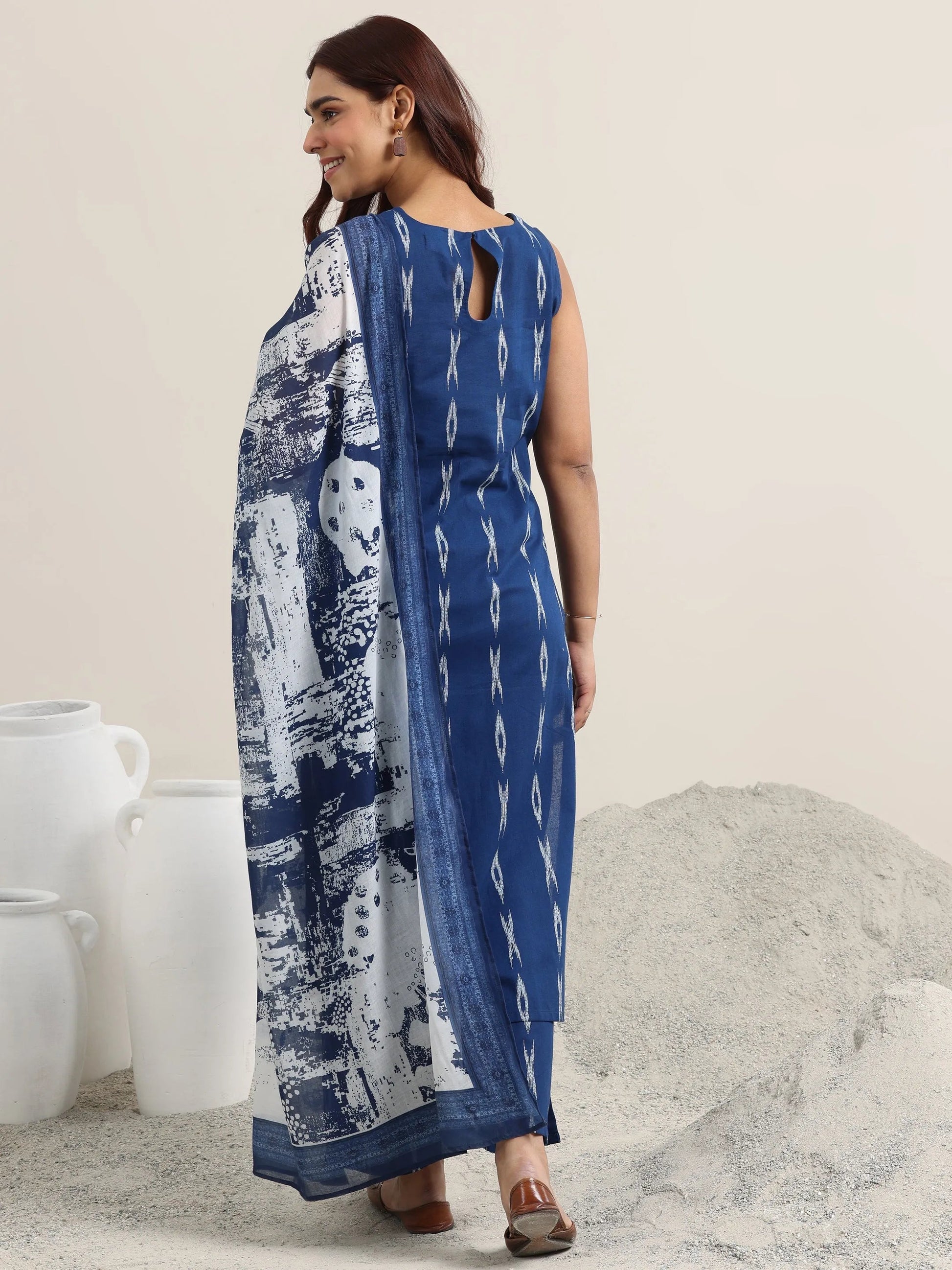Our 3-piece blue printed cotton blend straight suit set features a sleeveless straight-fit kurta with a V-neckline. Complemented with matching trousers with a partially elasticated waistband, roomy pockets, and a printed dupatta. Highlighted with geometric print, this refreshing style is perfect for light festivities.