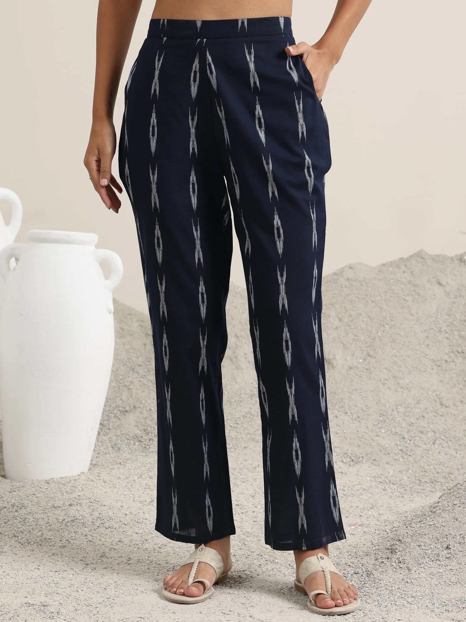 Our 3-piece blue printed cotton blend straight suit set features a kurta with a V-neckline and three-quarter sleeves. Complemented with trousers with a partially elasticated waistband and roomy pockets, and a dupatta. Highlighted with thread work and Ikat-inspired prints, this style is perfect for casual outings.