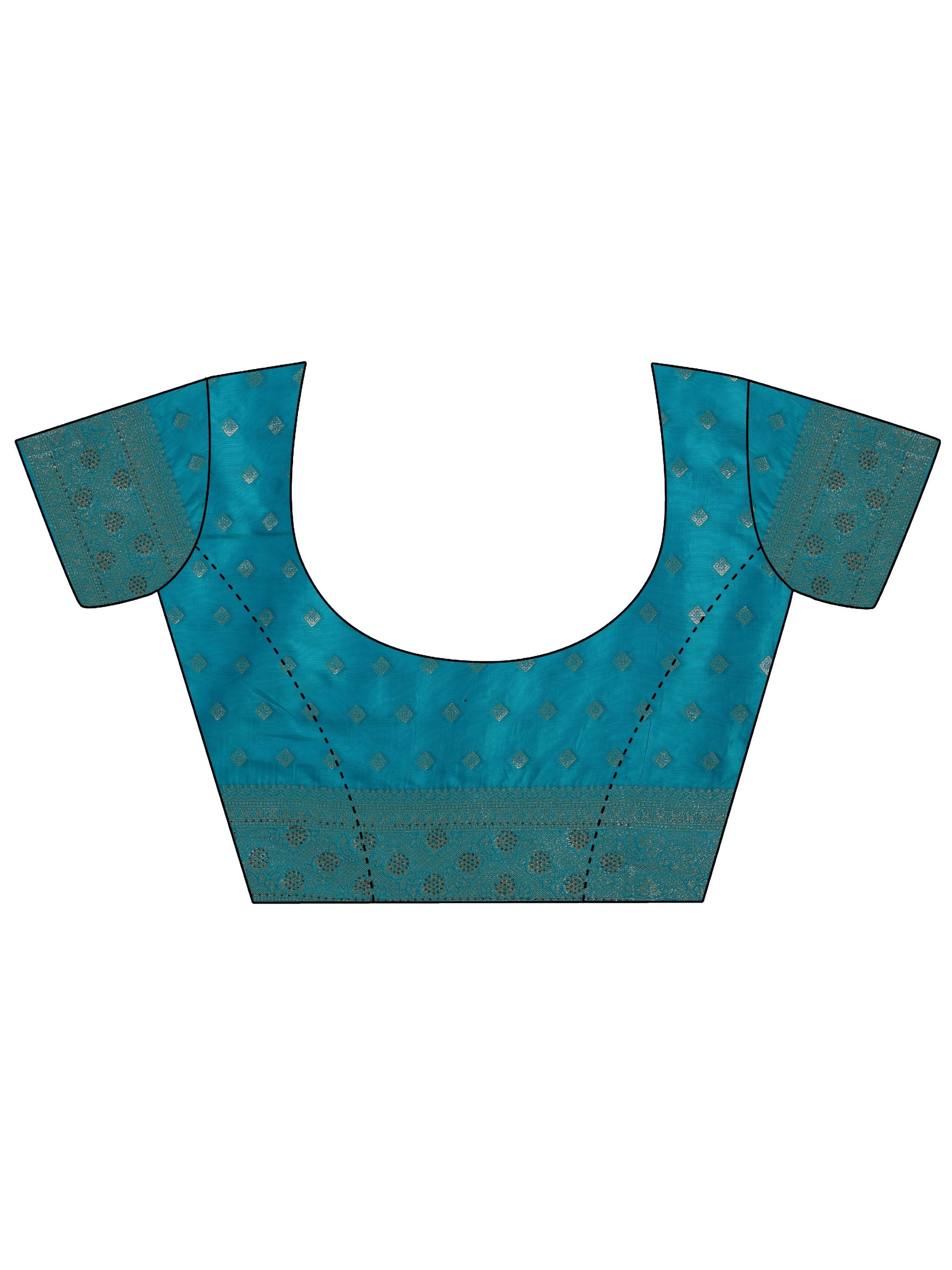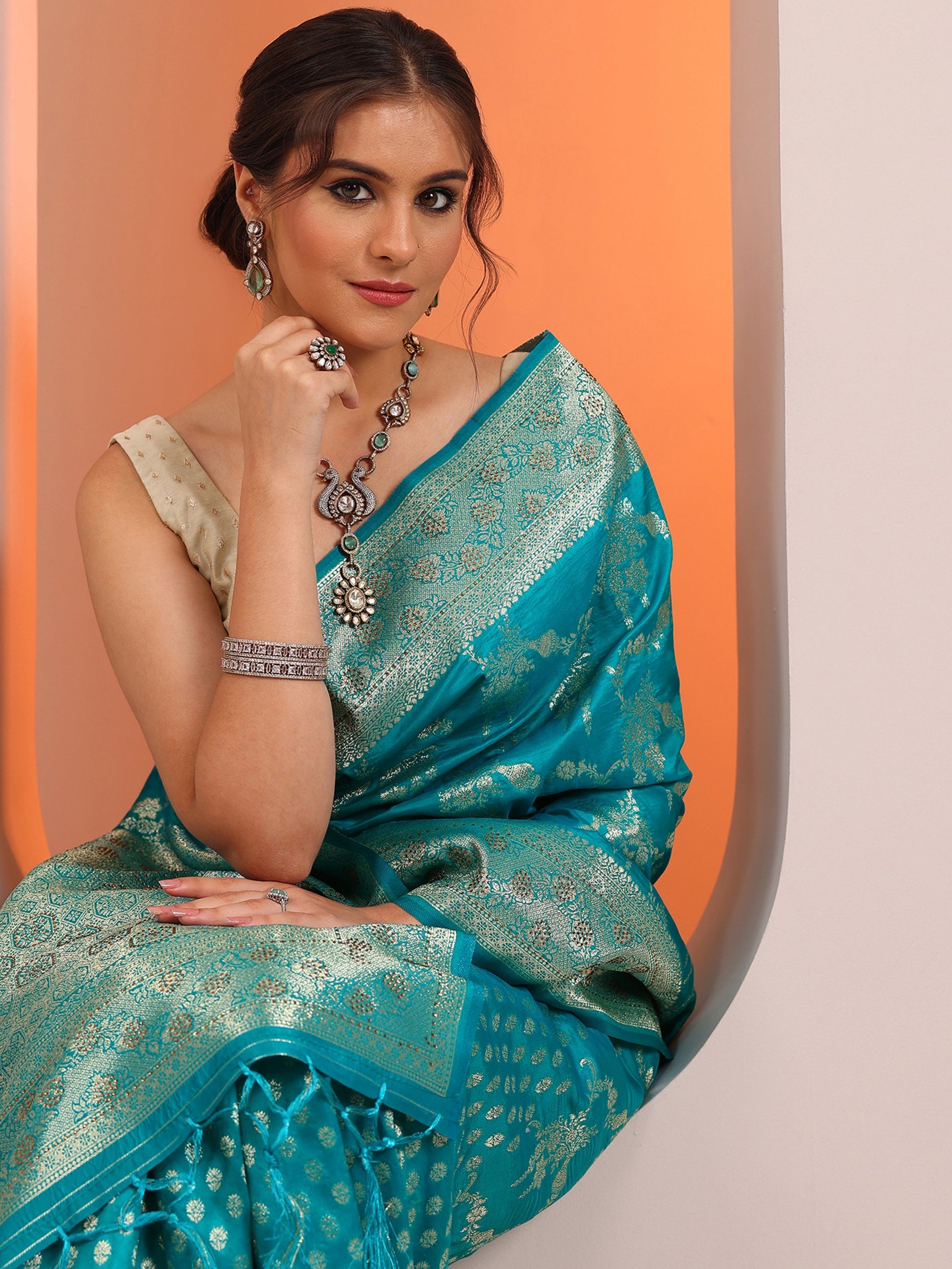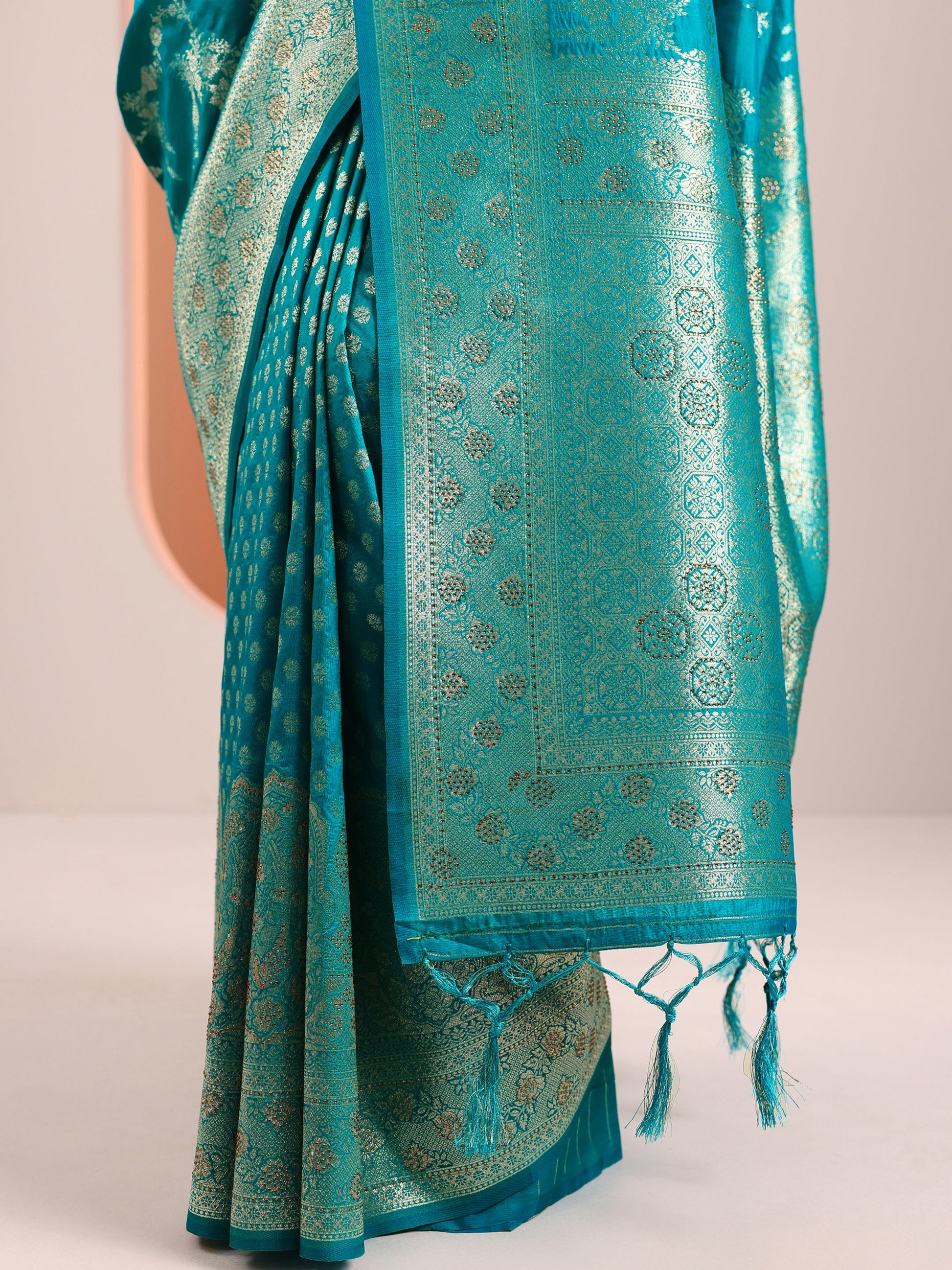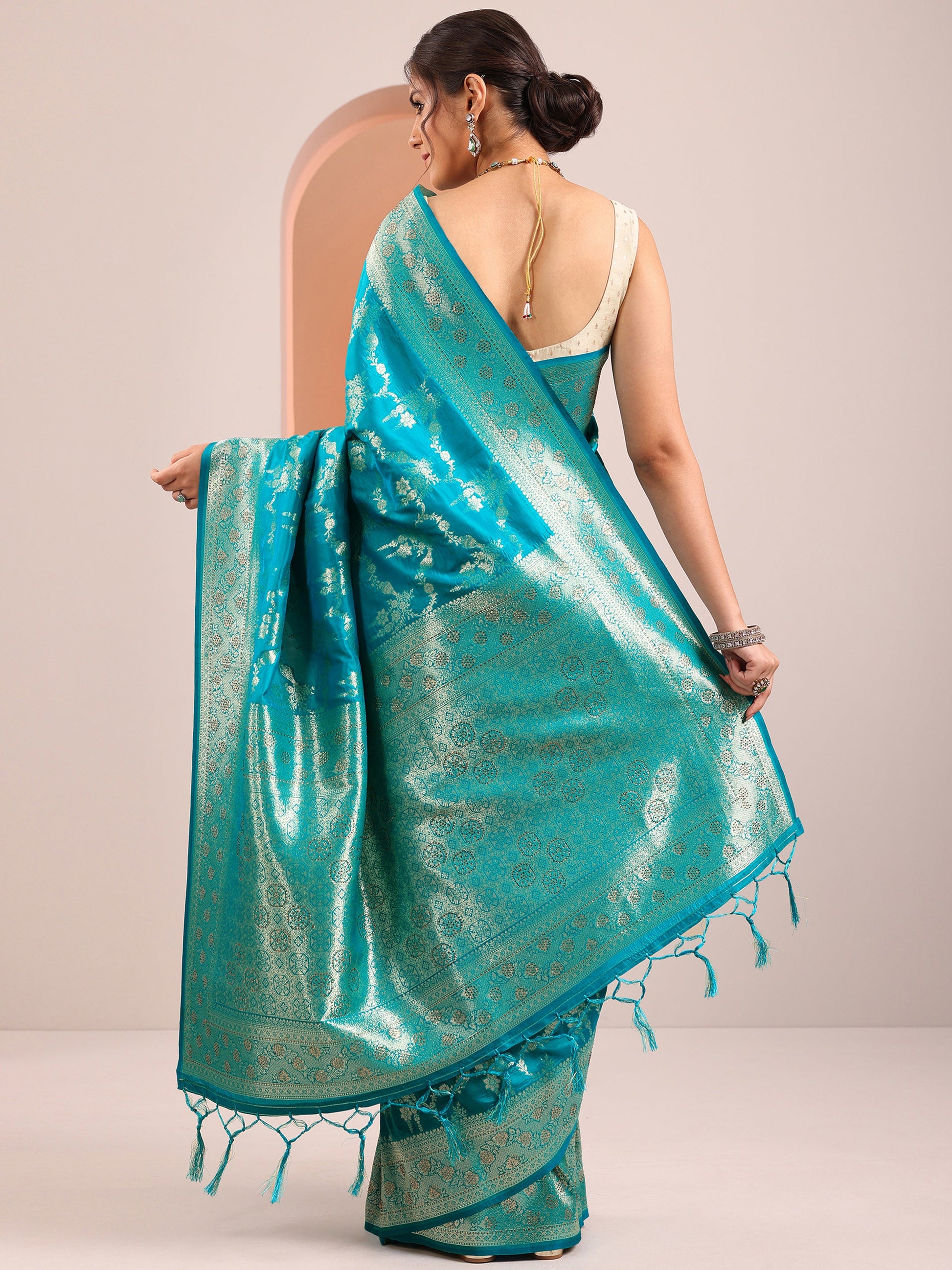 Our Turquoise Blue Woven Design Silk Blend Saree Features Captivating Print. Complemented With A Unstitched Blouse Piece. This Charming Saree Is Perfect For Festive Wear