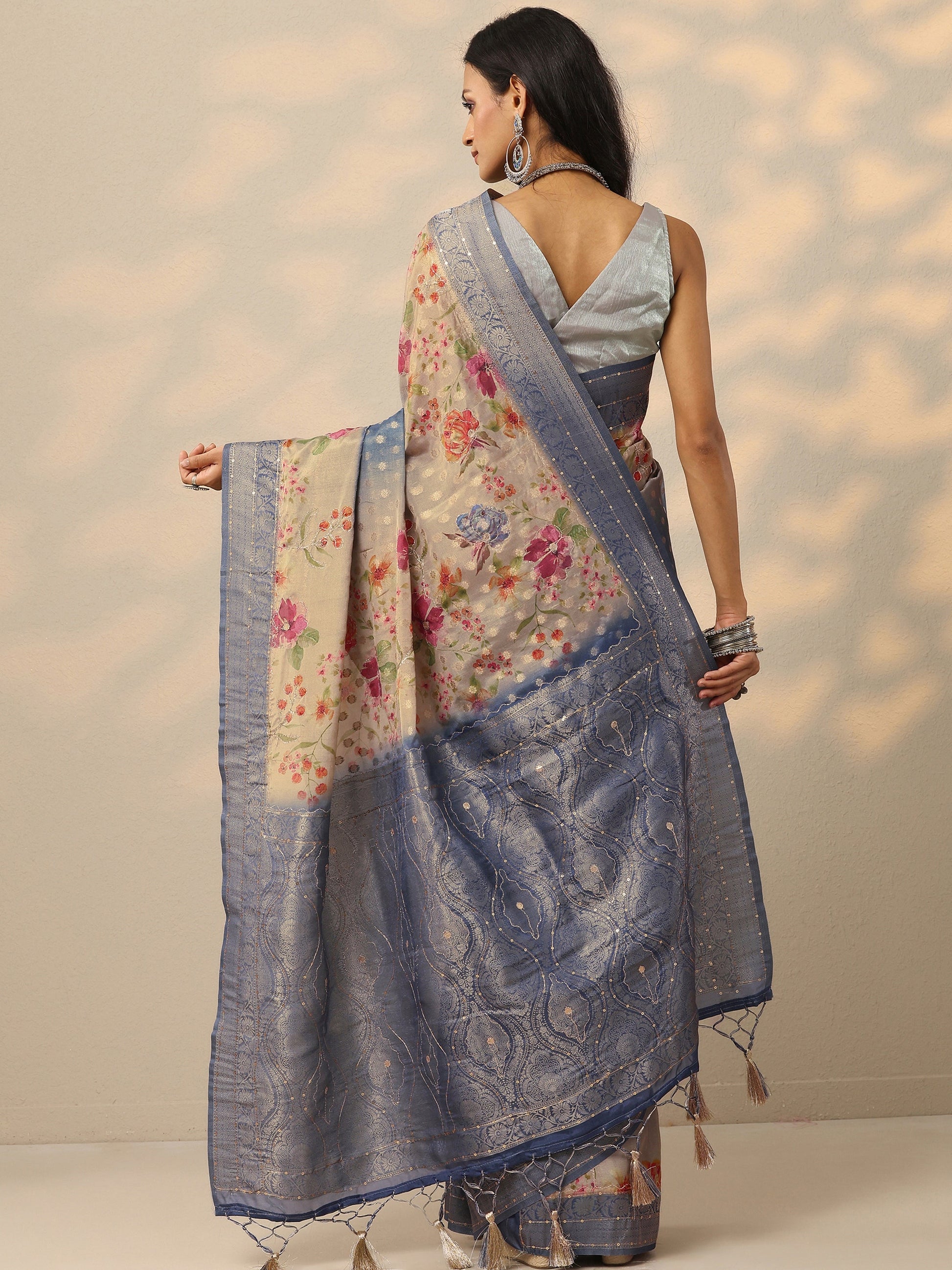 Our Blue printed Silk blend saree features captivating floral print. Complemented with a Blouse Piece. This charming saree is perfect for festive occasions.
