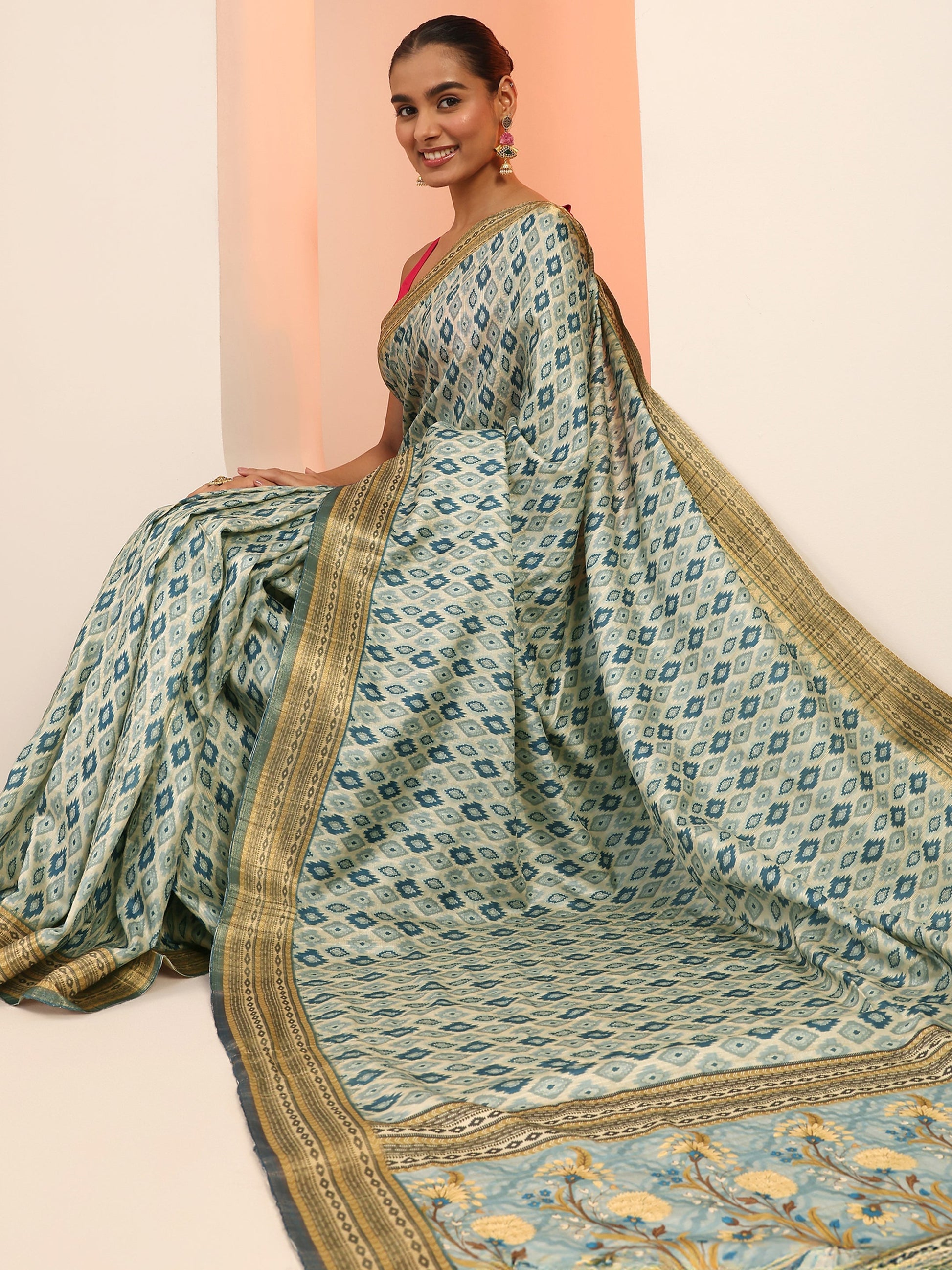 Our Turquoise Blue Printed Silk Blend Saree Features Captivating Woven Print. Complemented With An Unstitched Blouse Piece. This Charming Saree Is Perfect For Festive Wear