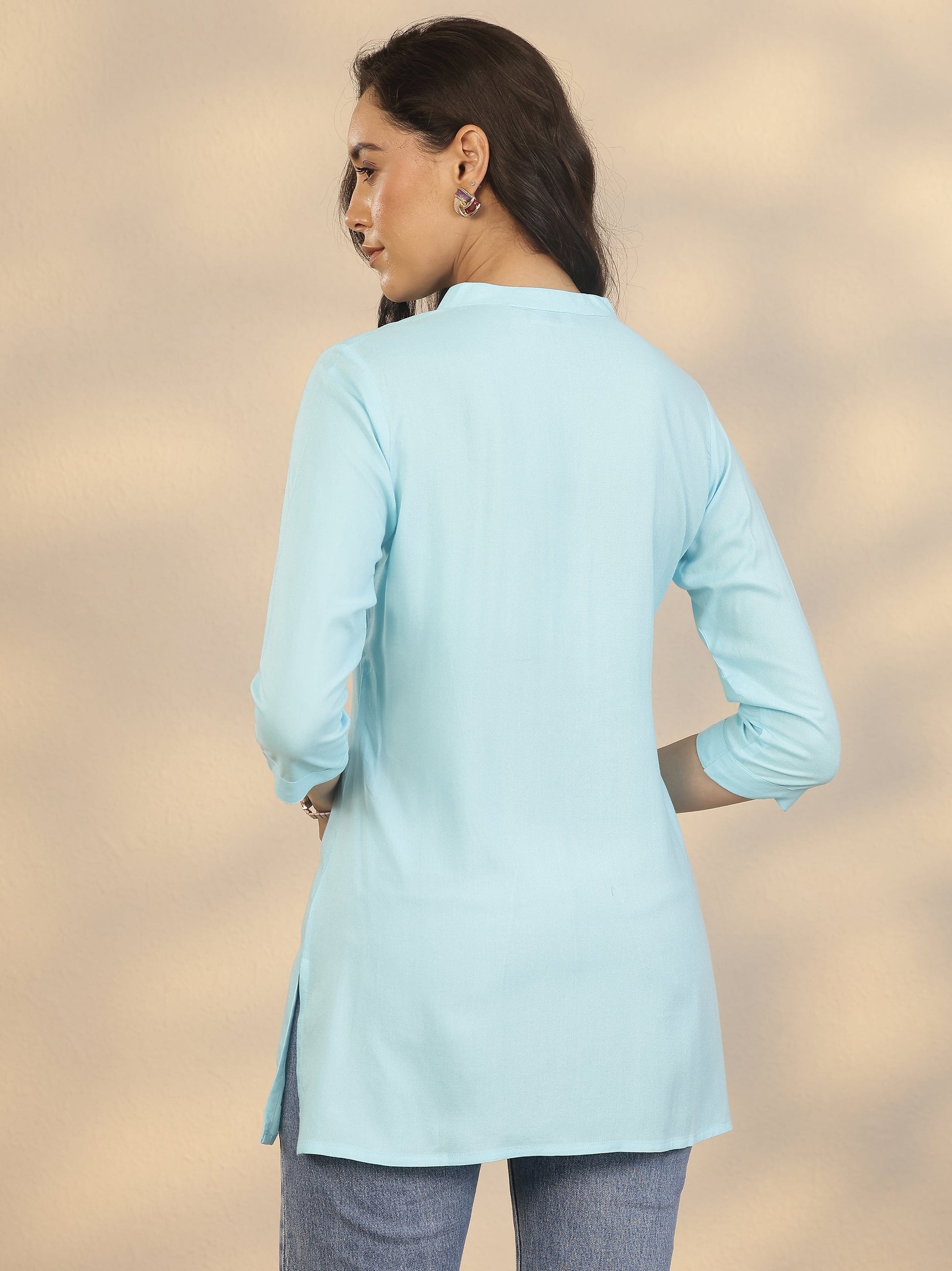 Our 1-piece sea green rayon straight-fit kurta features a mandarin collar neckline, regular sleeves and statement Yoke. Adorned with top print, this style is perfect for work wear and casual wear.