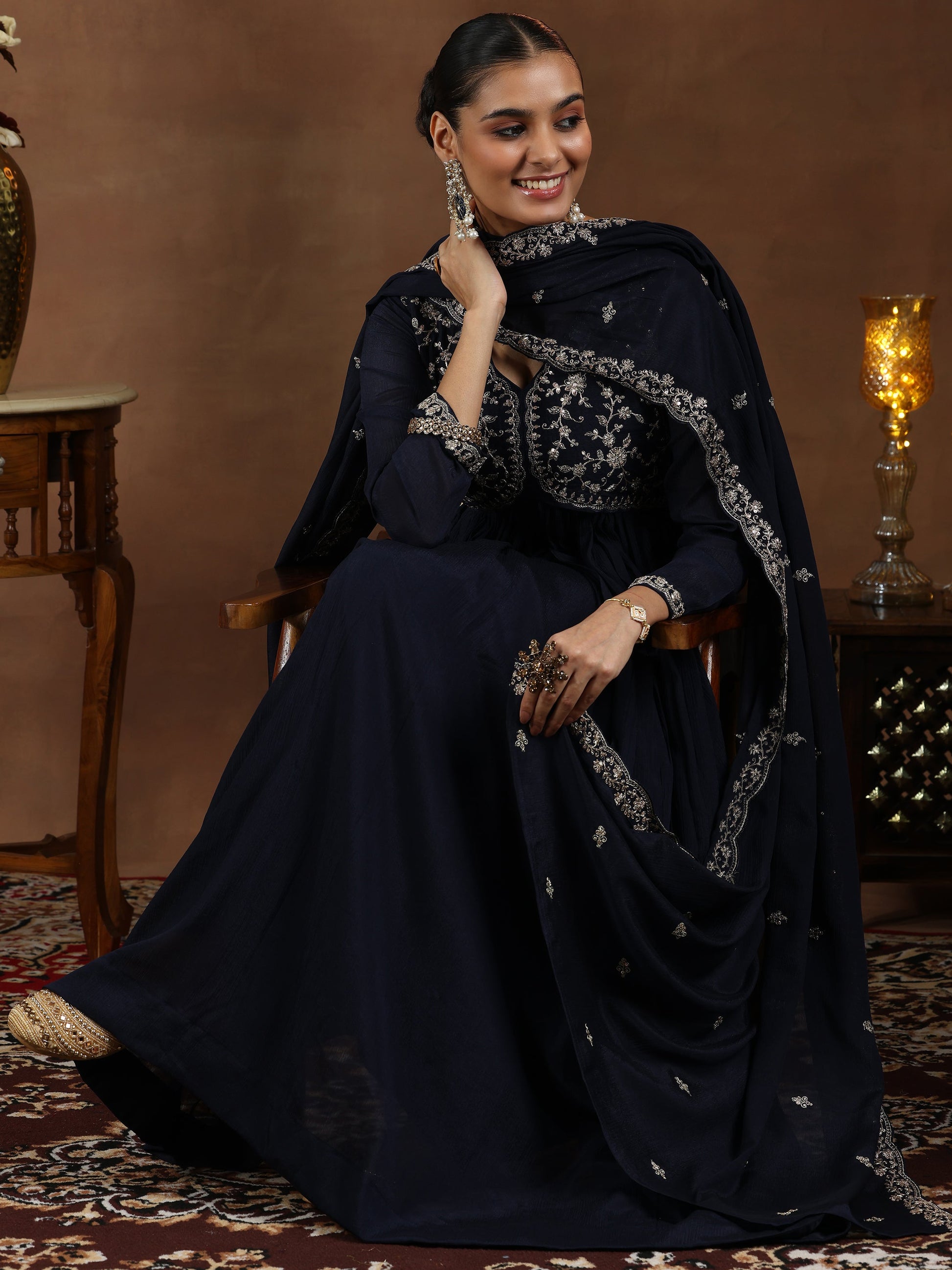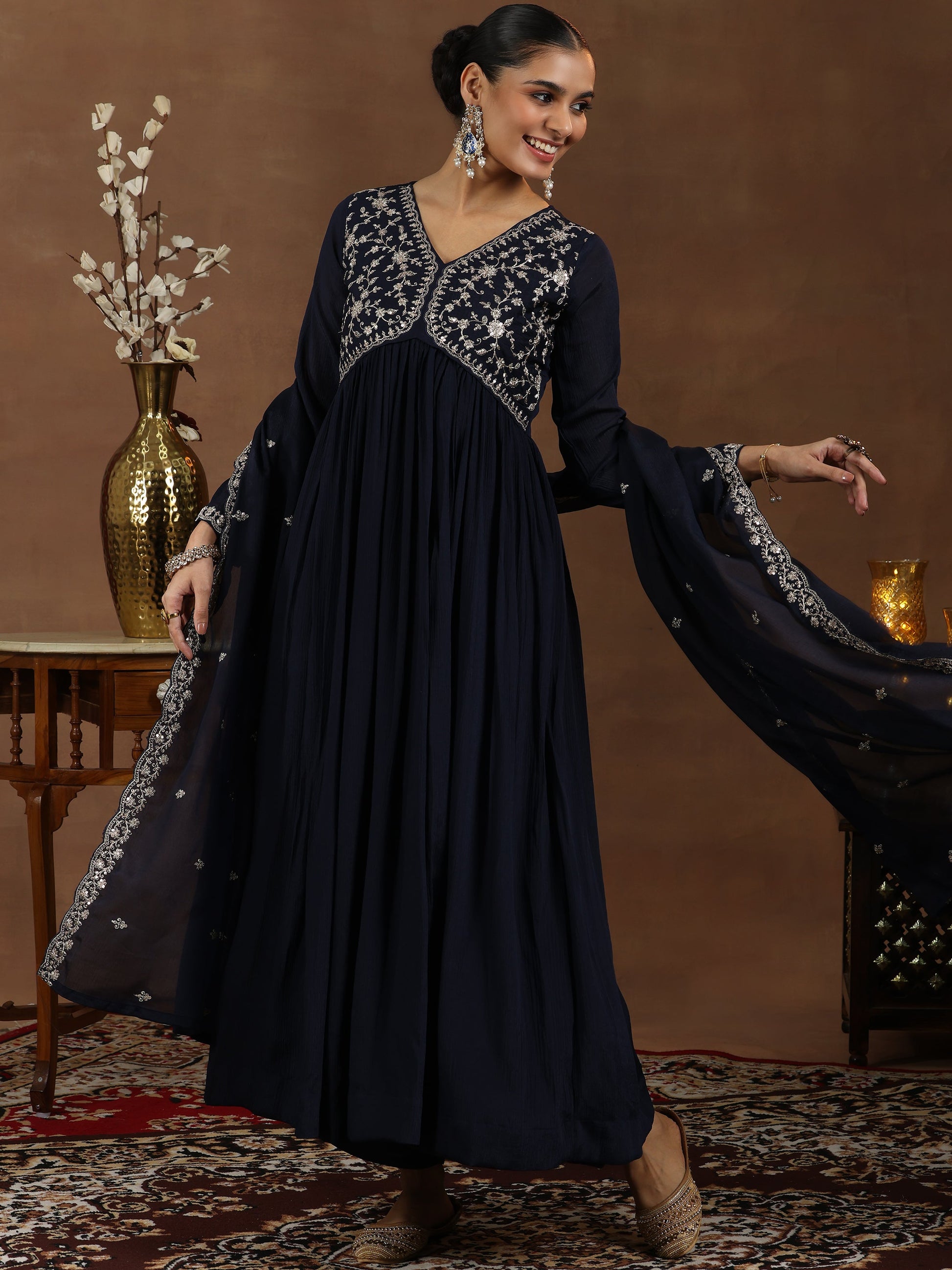 Blue Yoke Design Silk Blend A-Line Kurta With Trousers & Dupatta