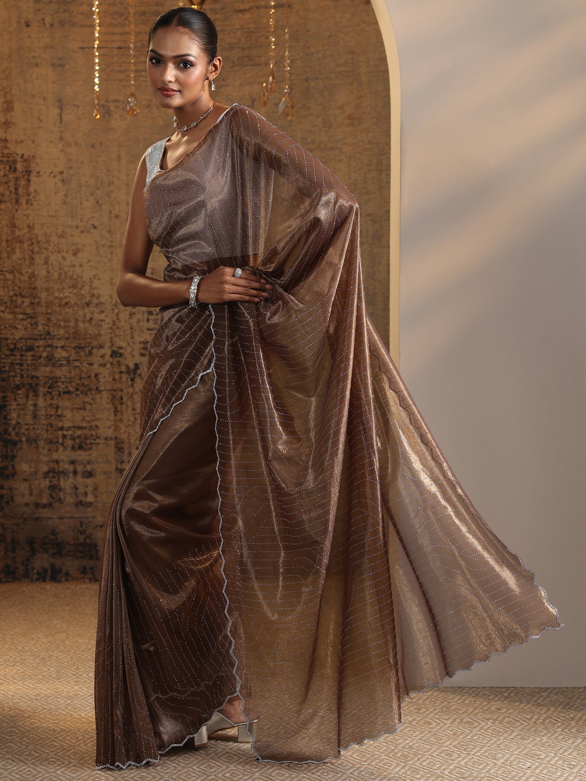 Brown Embellished Jimmy Choo Organza Saree With Unstitched Blouse Piece