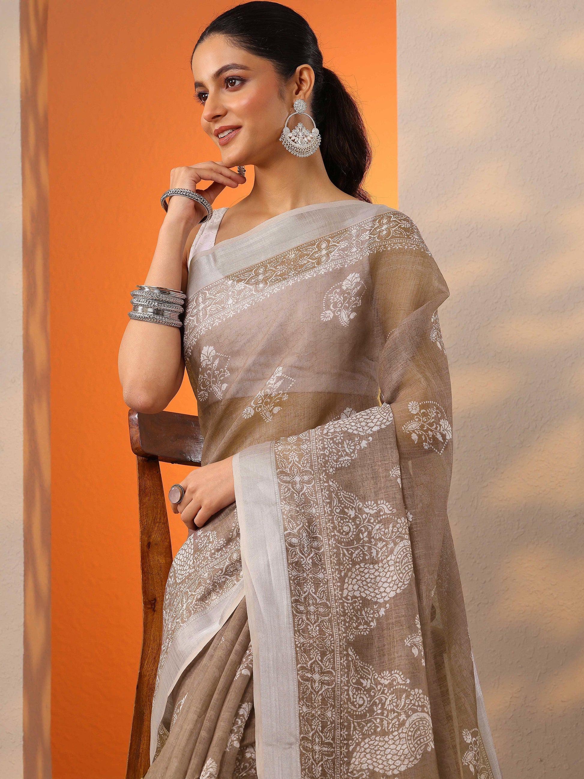 Our Taupe Printed Cotton Blend Saree Features Captivating Top Print. Complemented With An Unstitched Blouse Piece. This Charming Saree Is Perfect For Casual Wear.