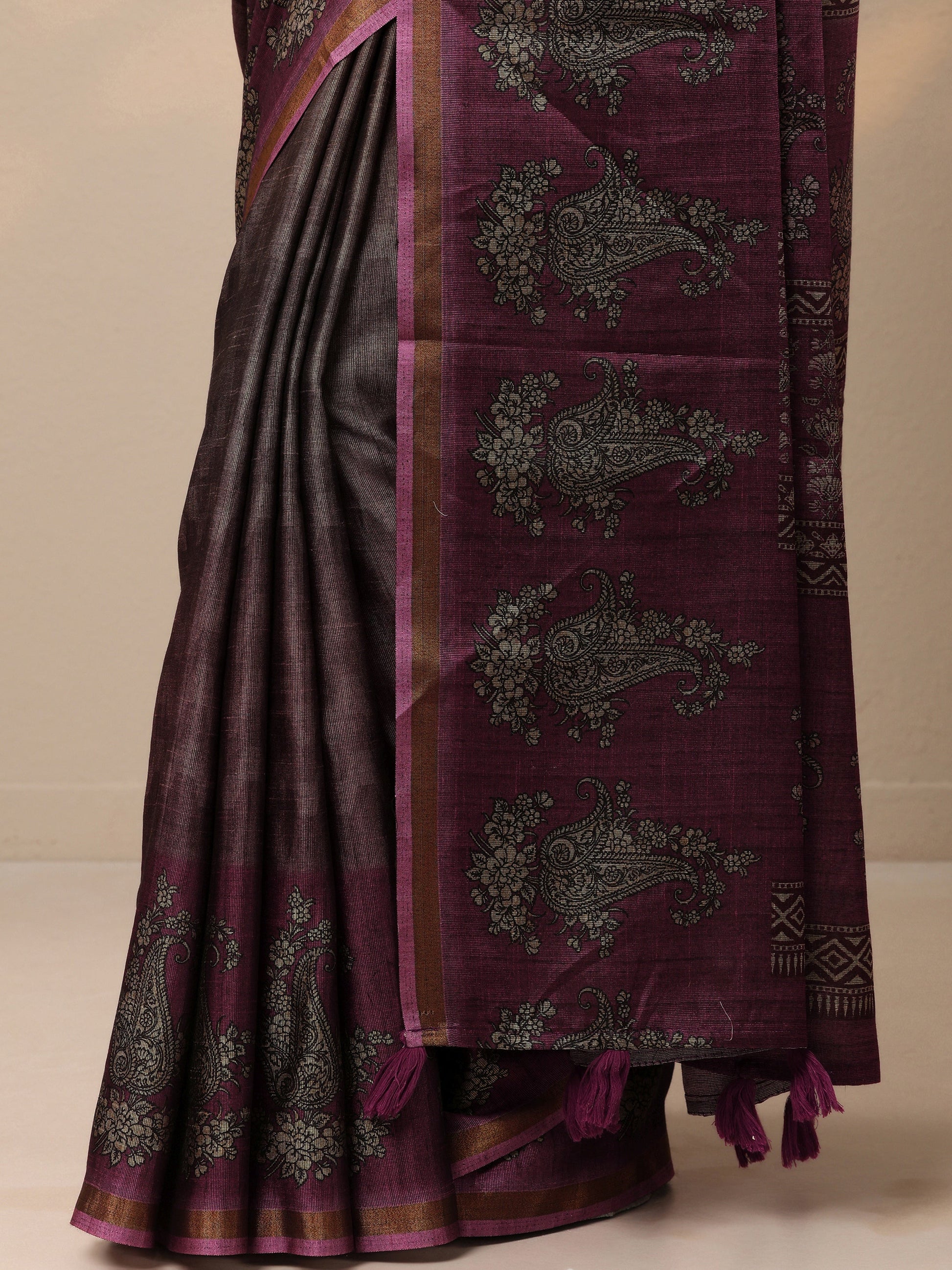 Our Burgundy printed cotton blend saree features captivating Ethnic Motif print. Complemented with an unstitched blouse piece. This charming saree is perfect for festive wear.