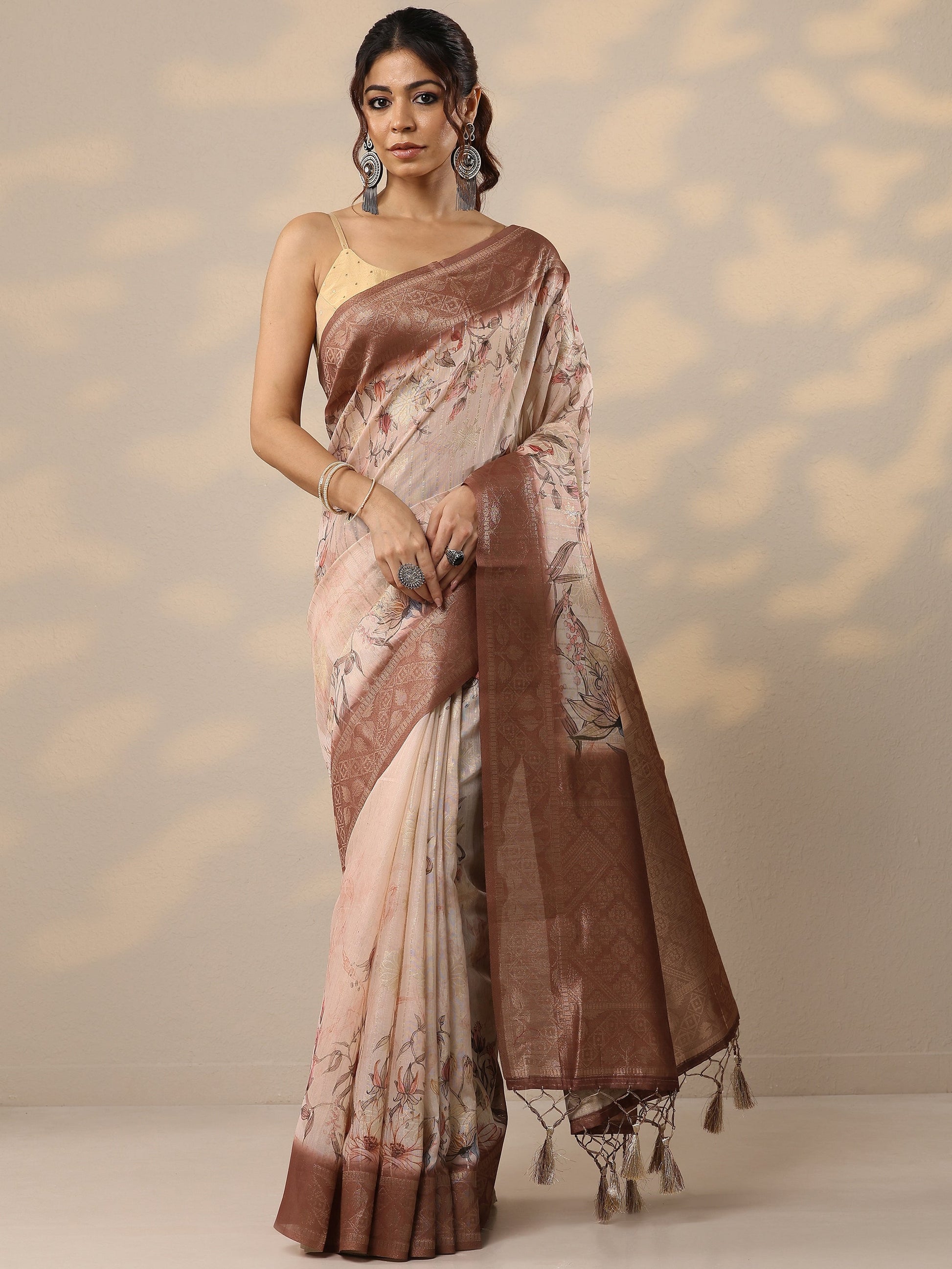 Brown Printed Cotton Blend Sarees With Unstitched Blouse Piece