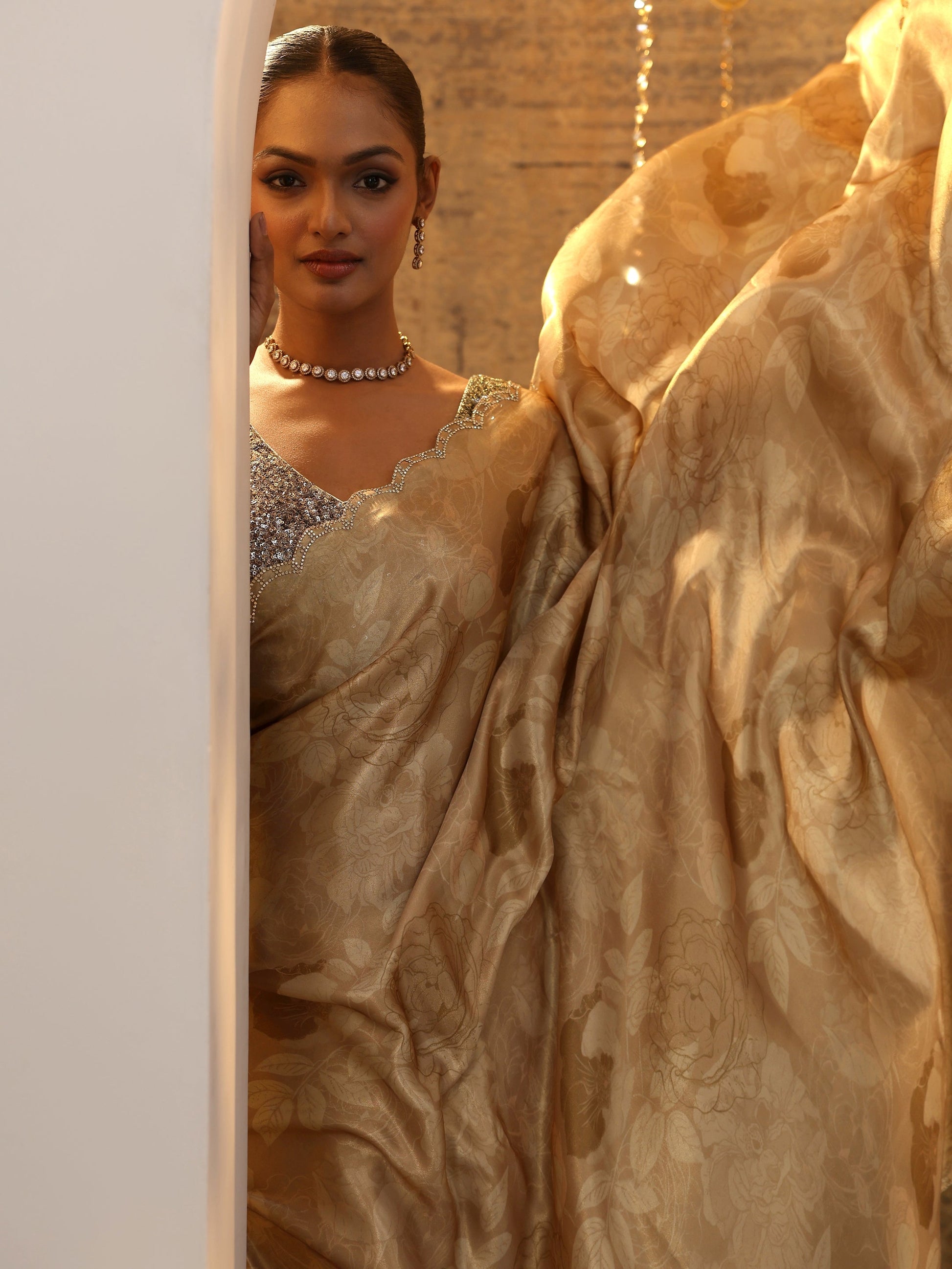 Our Gold Printed Satin Saree Features Captivating Floral Printed Design. Complemented With A Unstitched Blouse. This Charming Saree Is Perfect For Festive Wear.