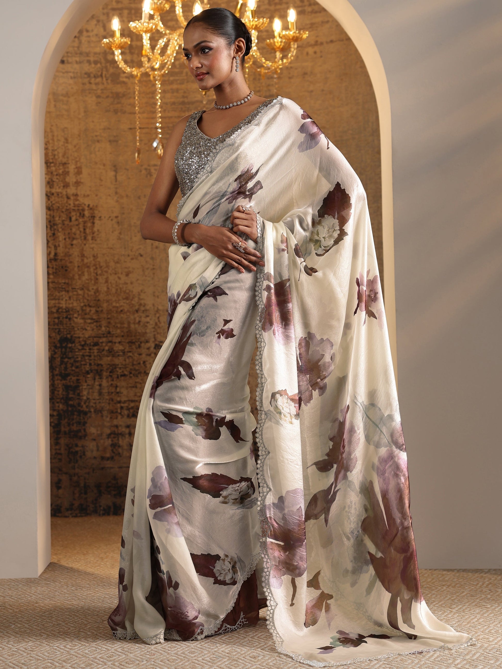 Our Off White Printed Satin Saree Features Captivating Floral Printed Design. Complemented With A Unstitched Blouse. This Charming Saree Is Perfect For Festive Wear.
