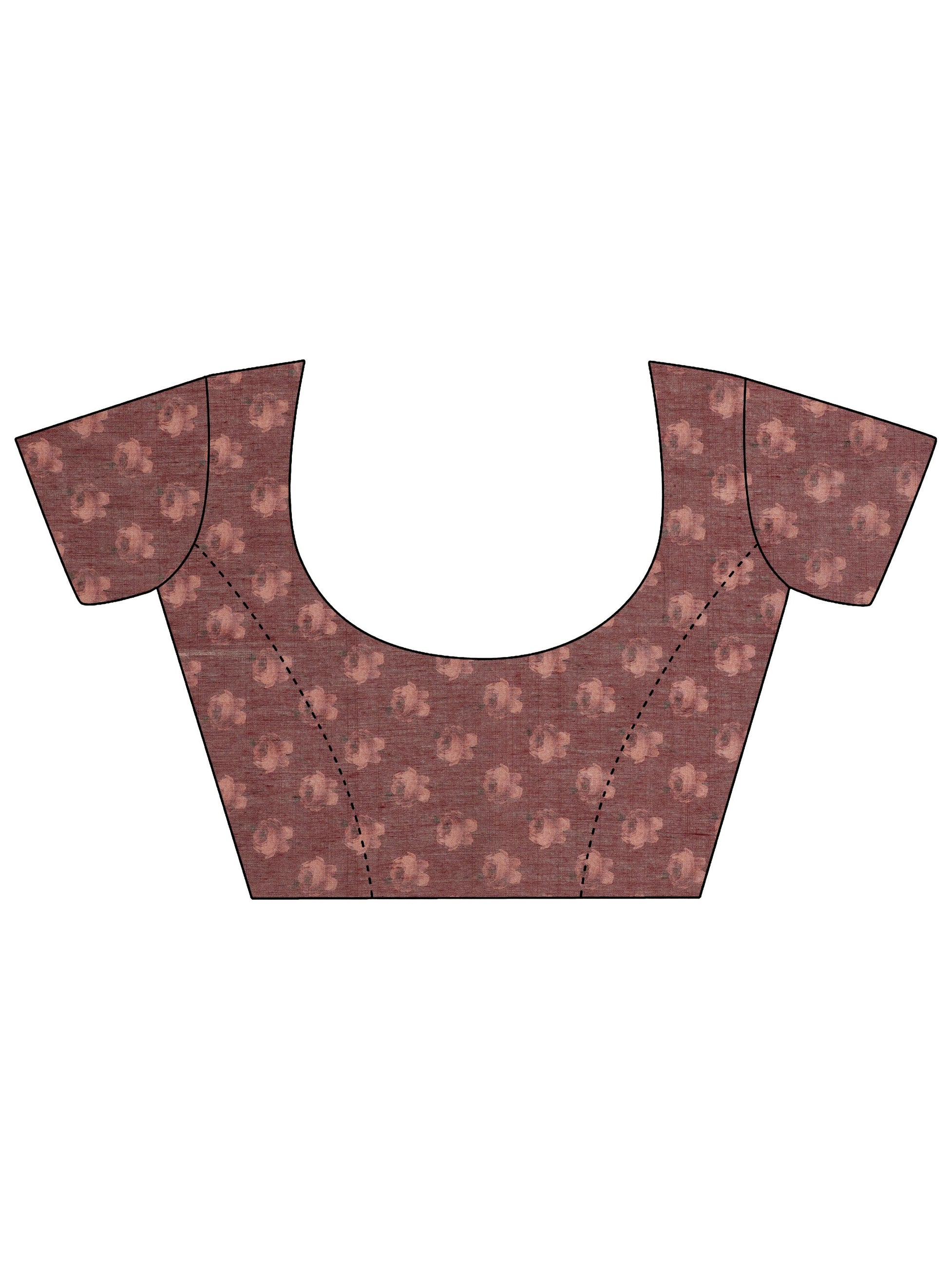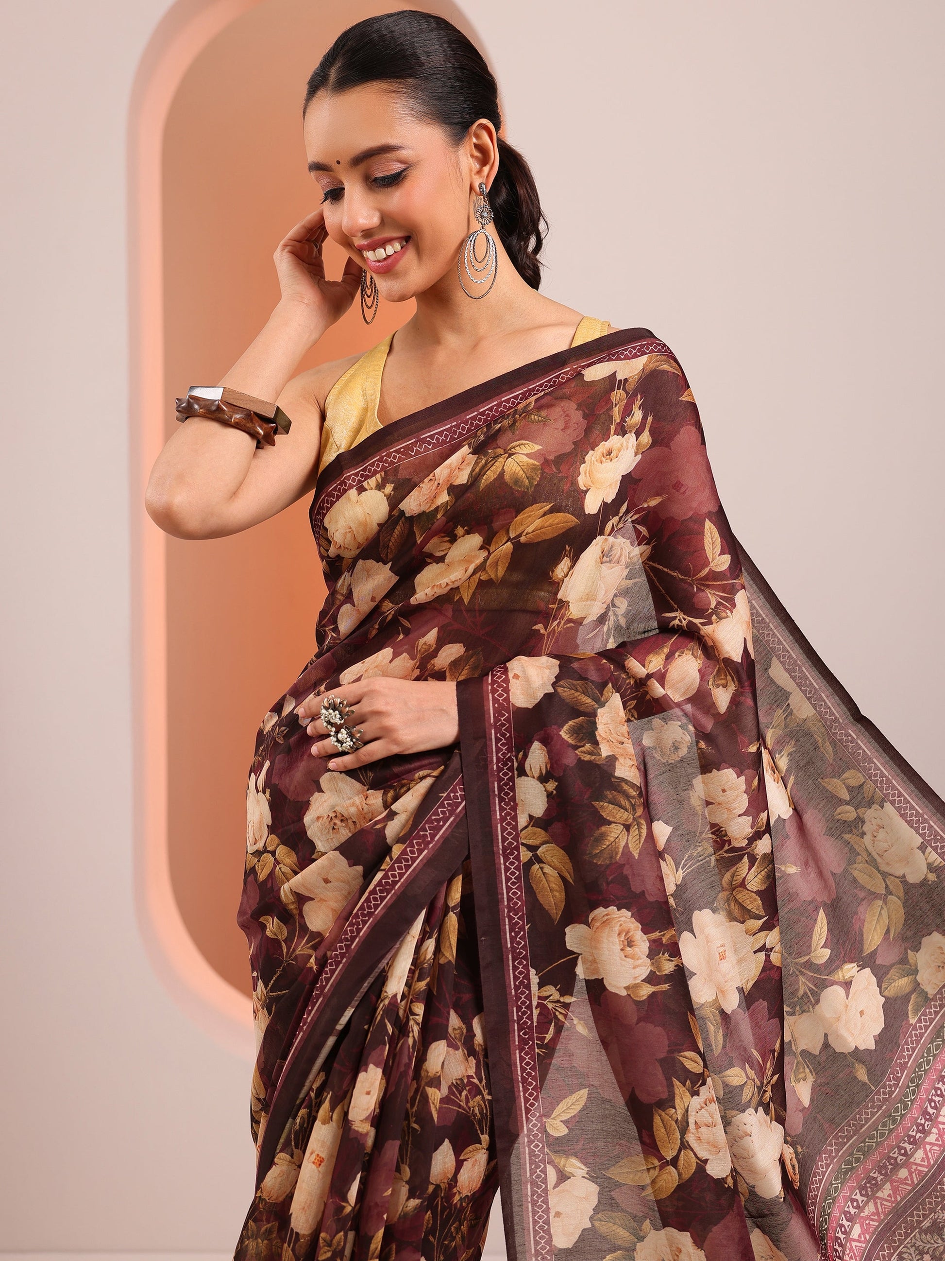 Brown Printed Silk Blend Saree With Unstitched Blouse Piece