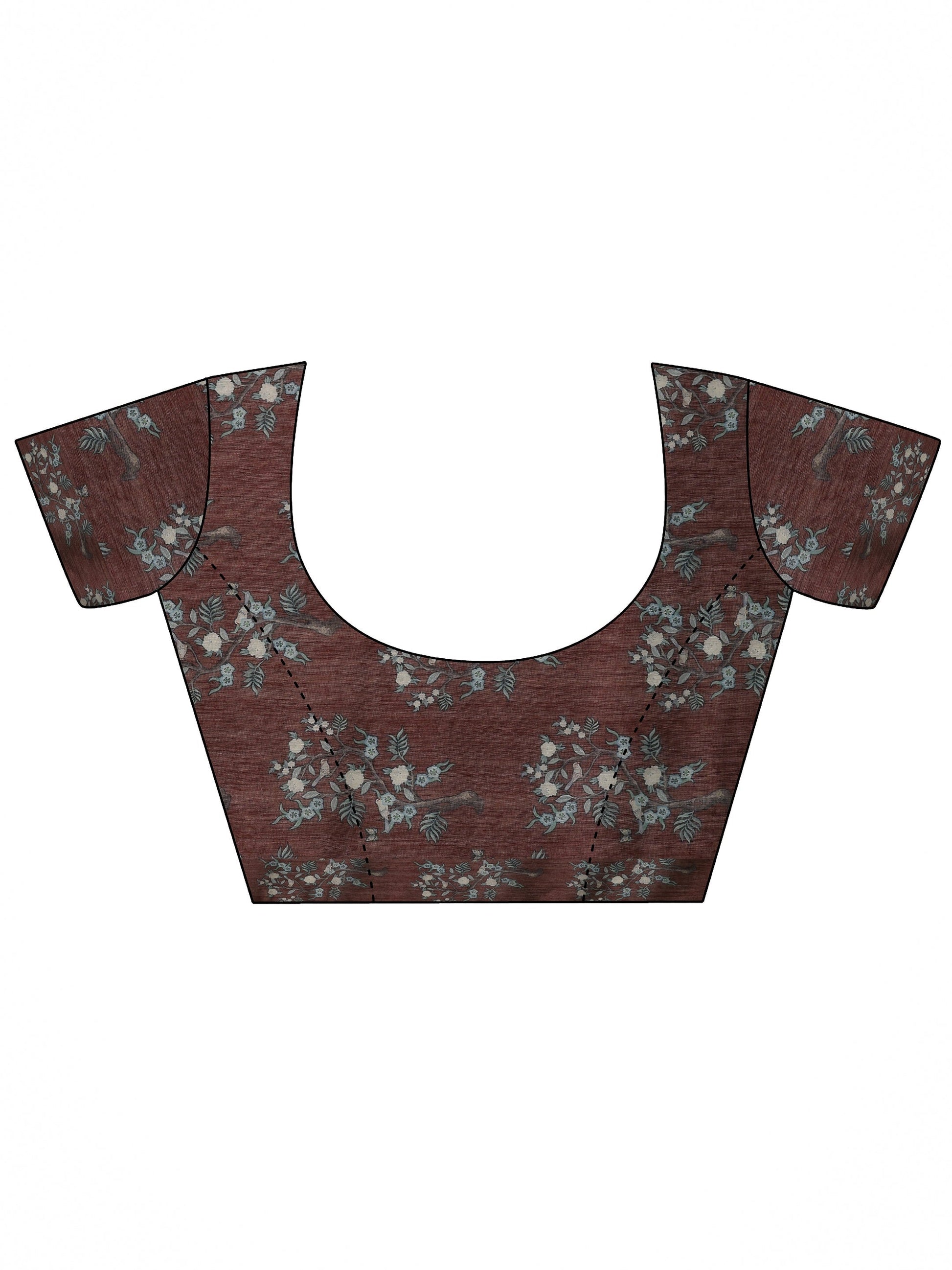 Brown Printed Silk Blend Saree With Unstitched Blouse Piece