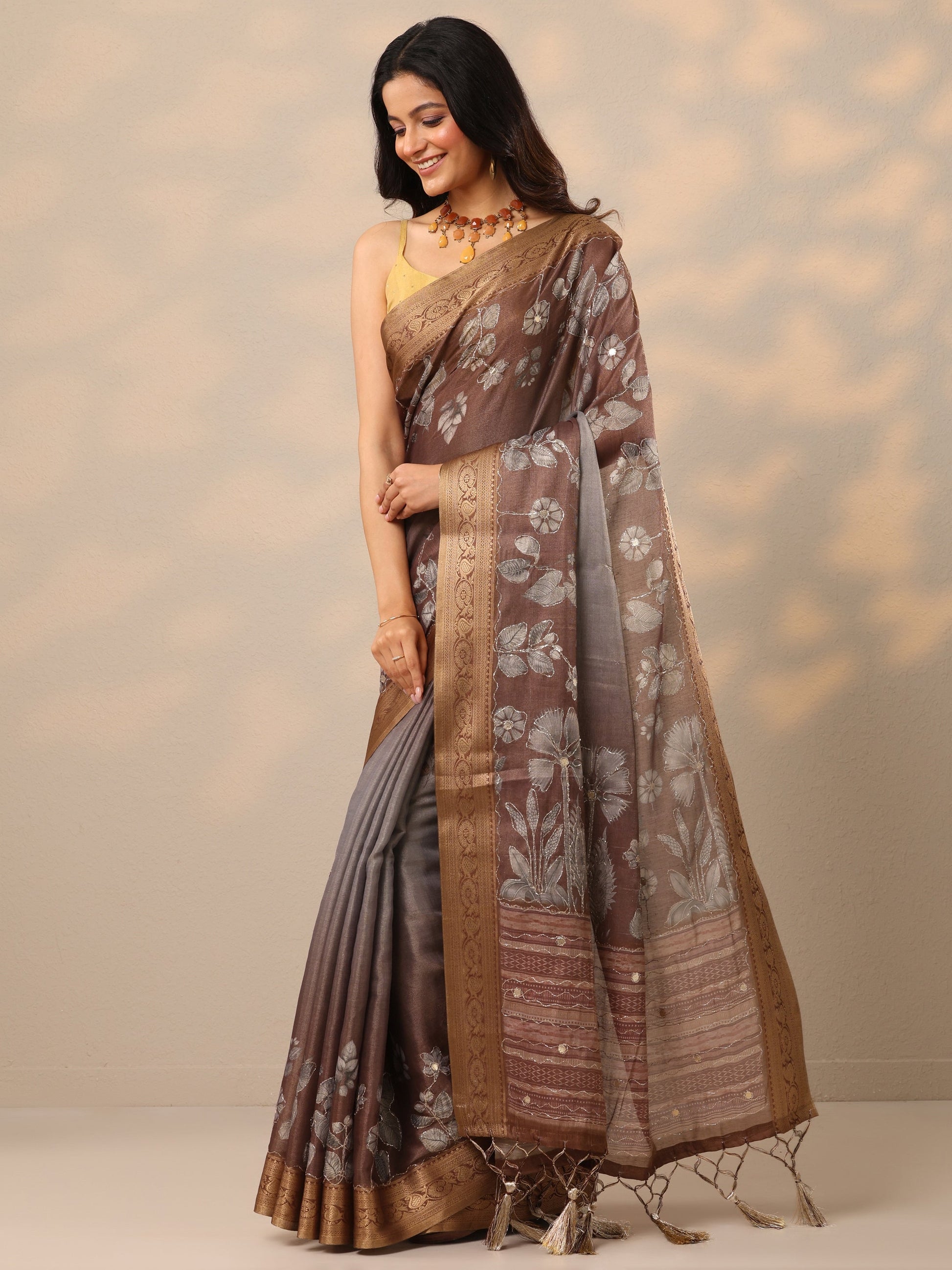 Brown Printed Silk Blend Sarees With Unstitched Blouse Piece