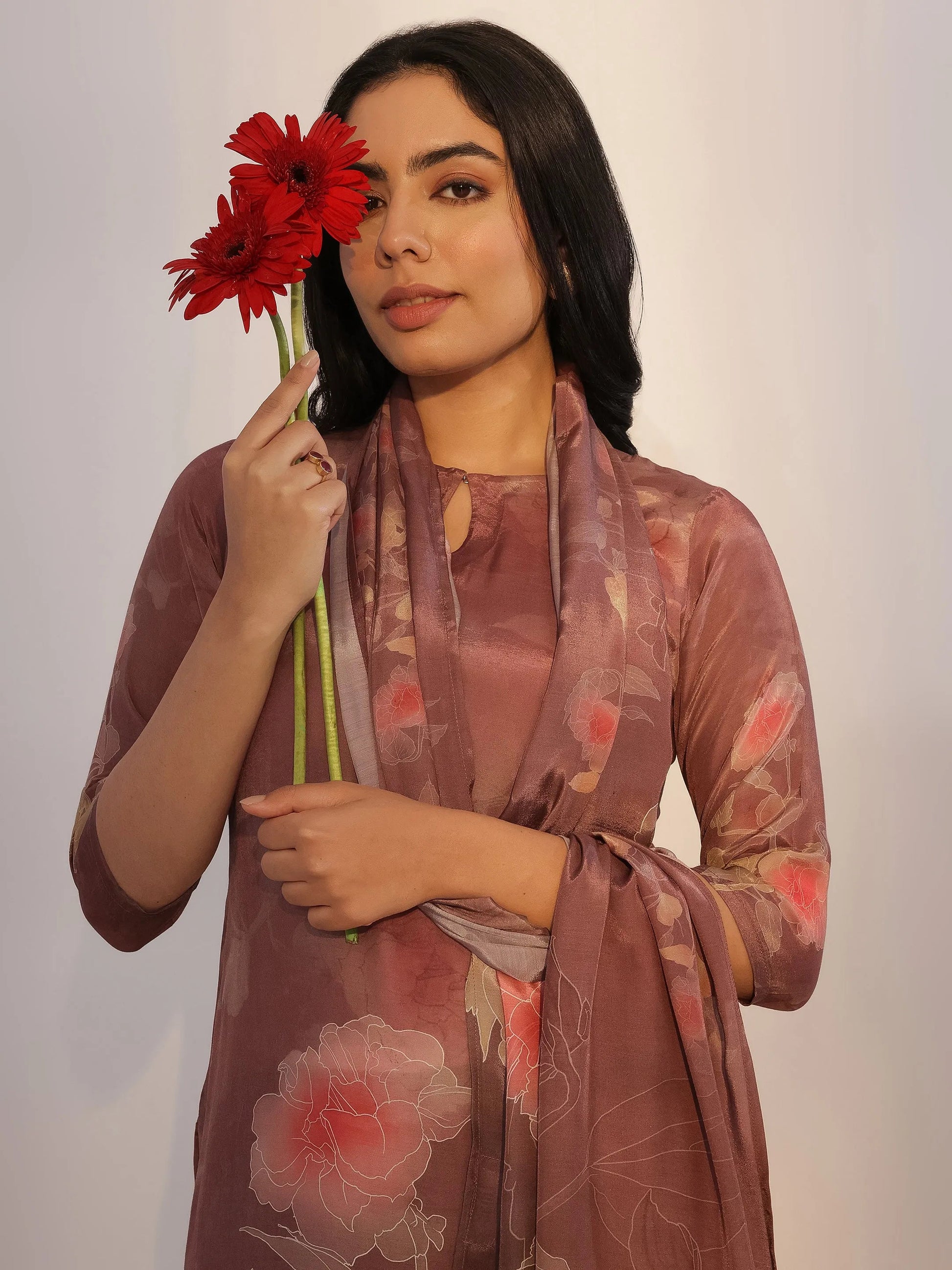 Brown Printed Silk Blend Straight Suit With Dupatta
