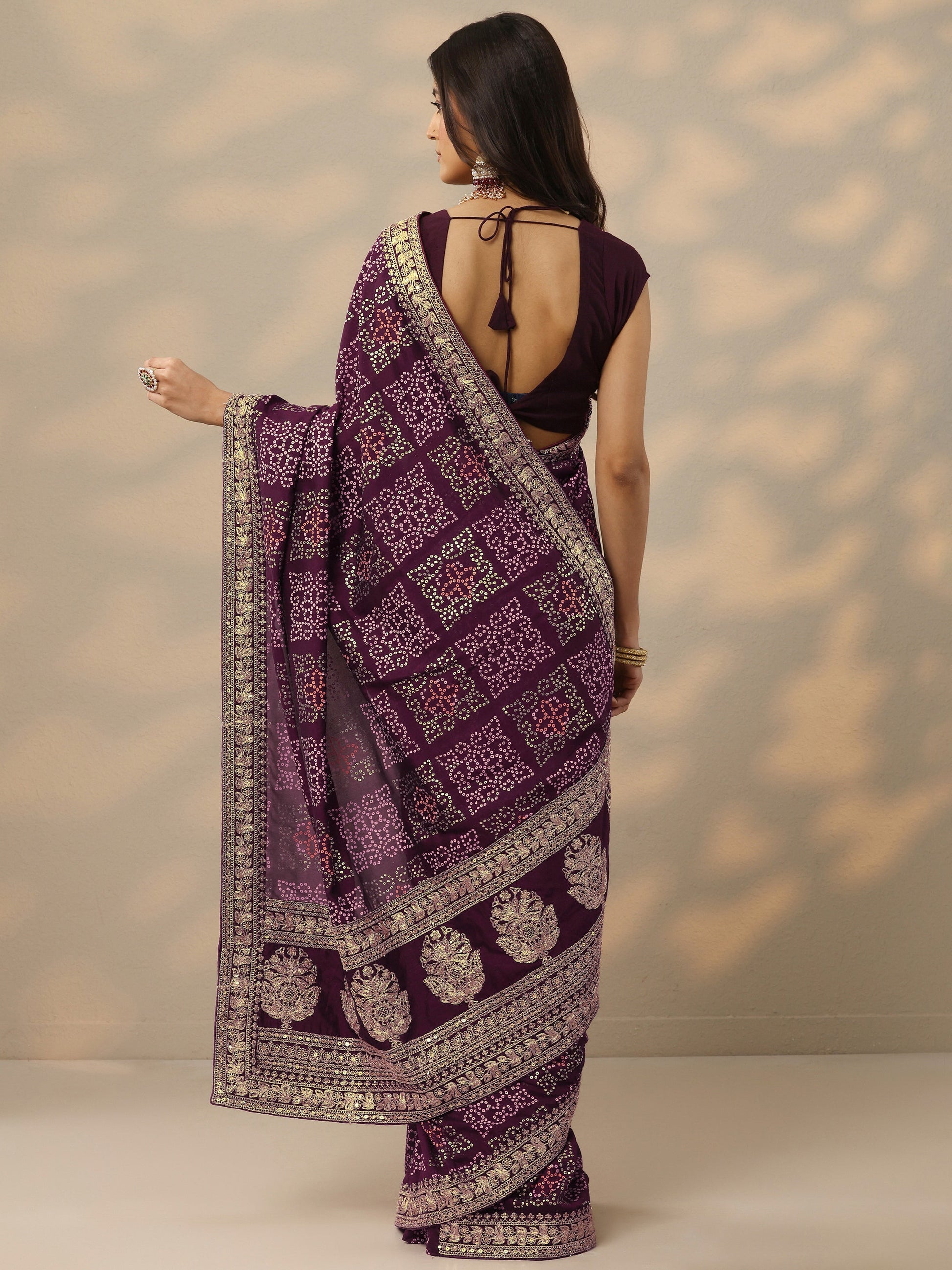 Burgundy Bandhani Printed Silk Blend Saree With Unstitched Blouse Piece