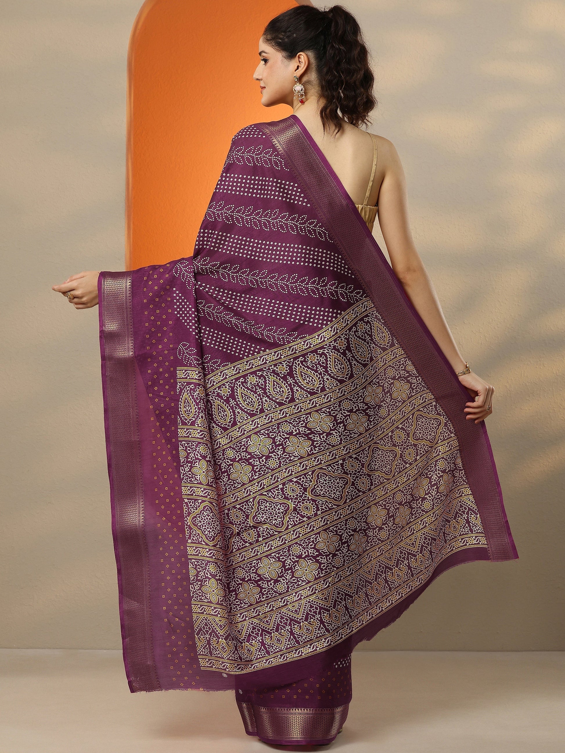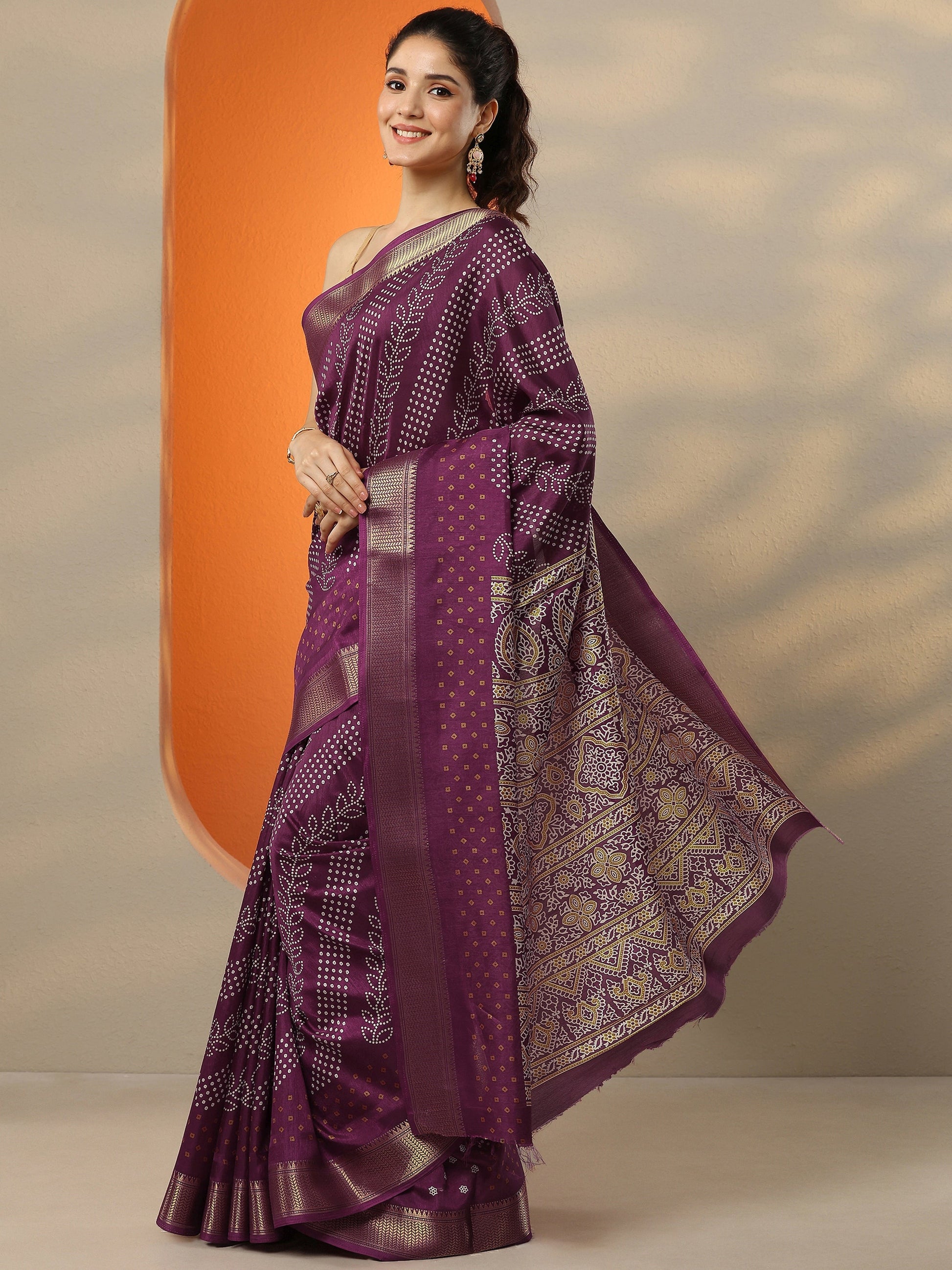 Burgundy Bandhani Printed Silk Blend Saree With Unstitched Blouse Piece