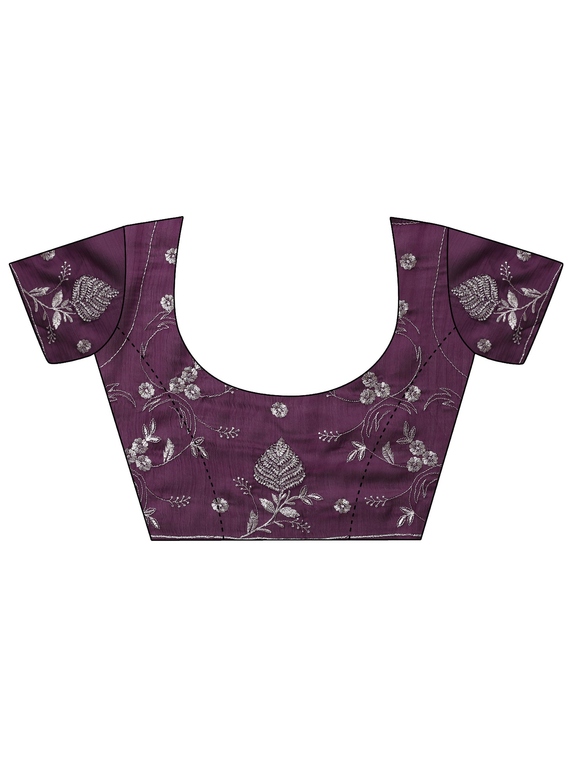 Our purple Chinon saree features captivating embellishments. Complemented with a stitched blouse. This charming saree is perfect for festive occasions.