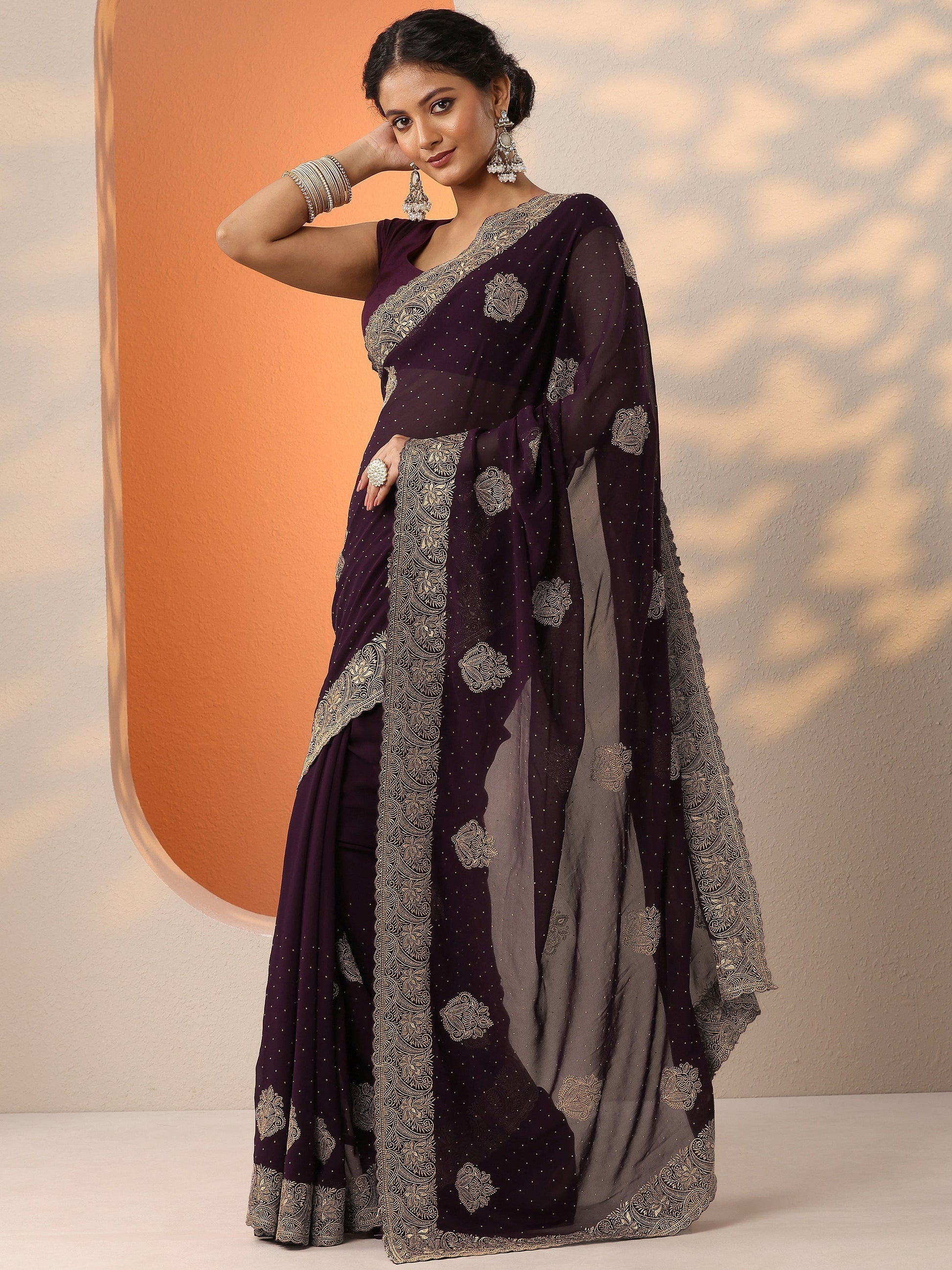 Our Burgundy Georgette saree features captivating embellishments. Complemented with a Stitched Blouse. This charming saree is perfect for festive occasions.