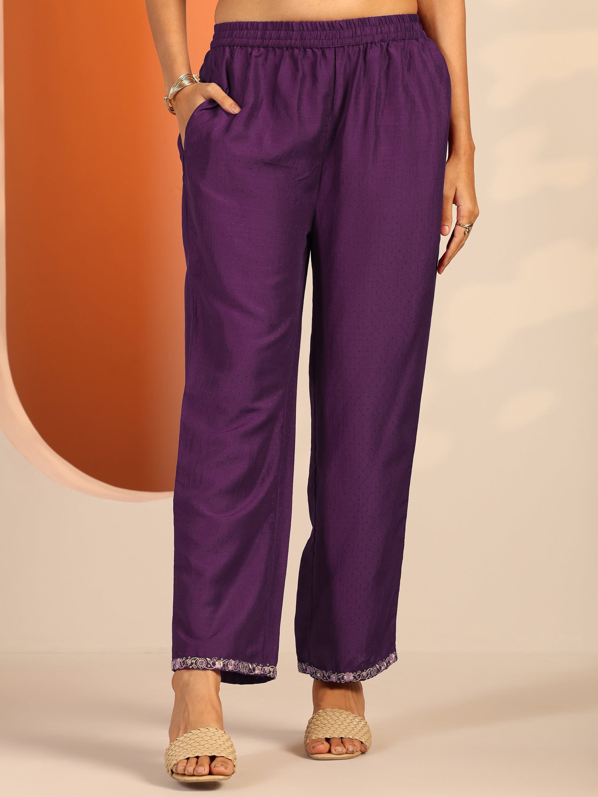 Our 3-piece purple silk blend Anarkali kurta set features a V-neckline, regular sleeves, and a statement yoke. Complemented with lining and palazzo pants with a partially elasticated waistband and 2 pockets, and an embroidered dupatta. Adorned with embroidered embellishments, this style is perfect for festive wear.