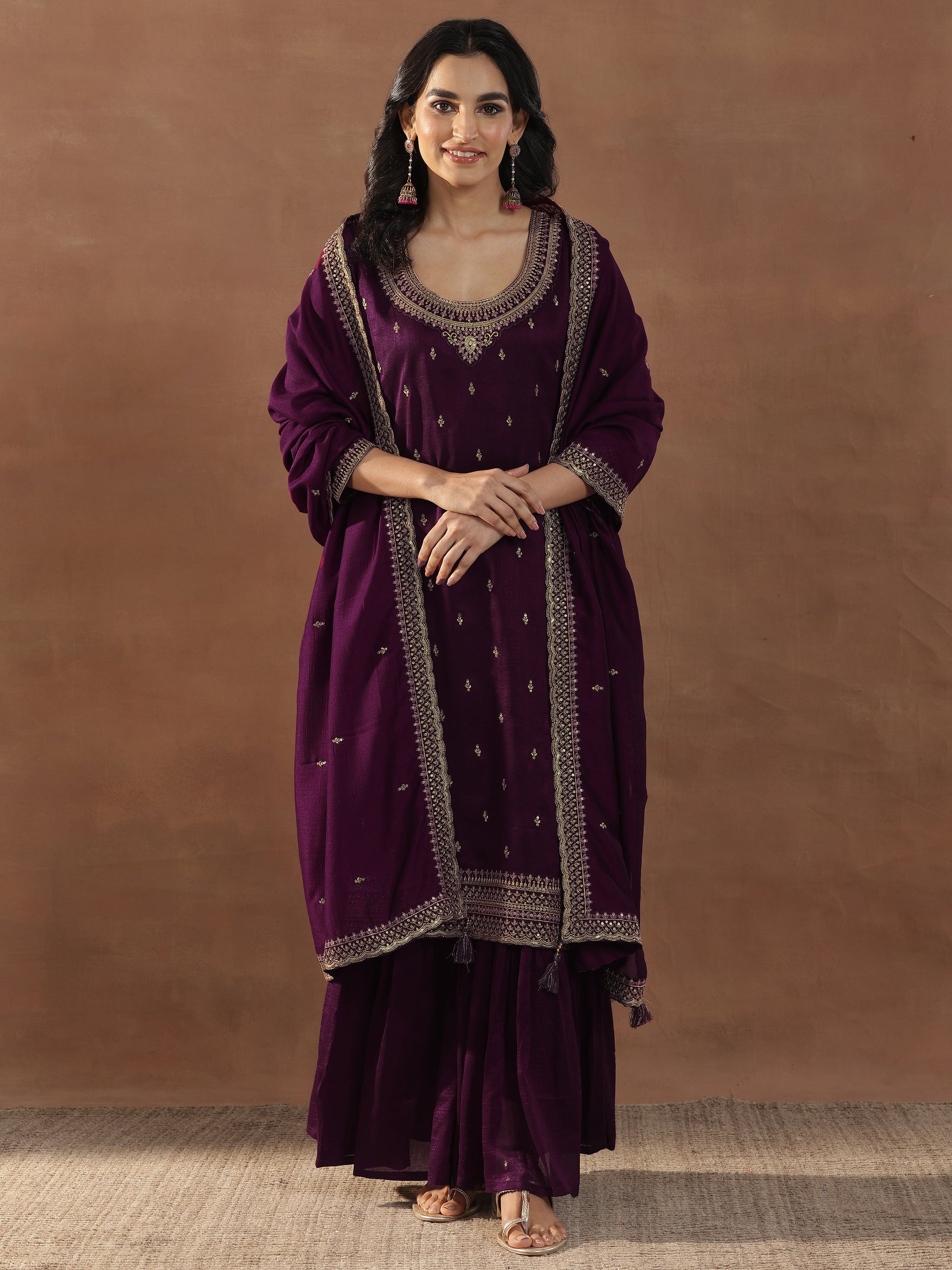 Our 3-piece Purple Silk Blend Kurta Set features a Straight-fit kurta with a U-notched neckline, Regular Sleeves, and statement yoke. Complemented with Sharara Pants with an Elasticated waistband and an Embroidered dupatta. Adorned with Embroidered accents, this style is perfect for Dark Festive occasions.