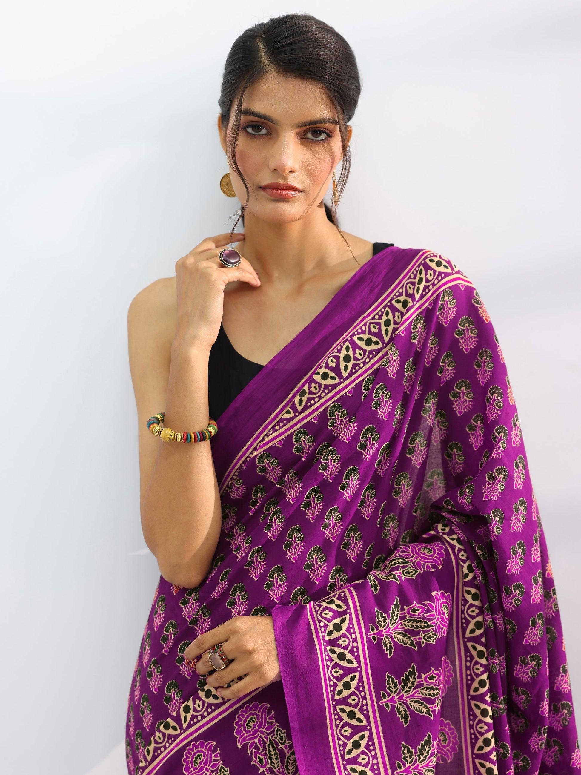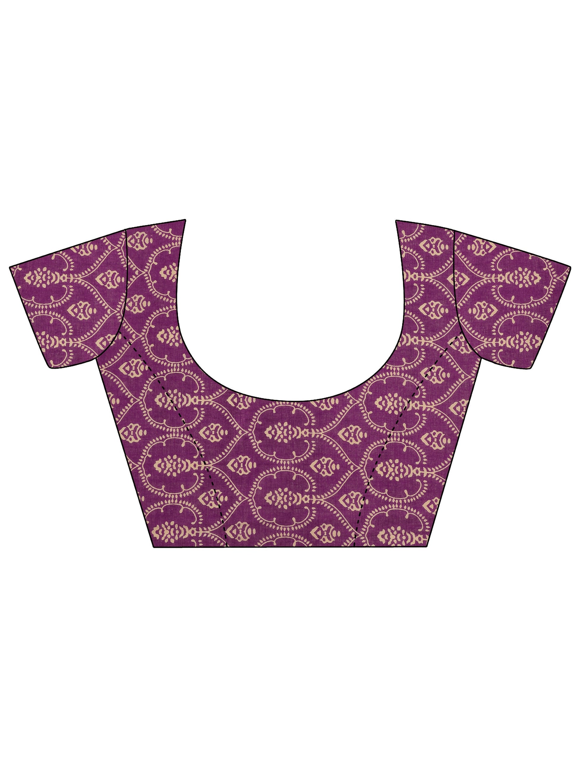 Our Purple Printed Cotton Saree Features Captivating Ethnic Motif Printed Design. Complemented With A Unstitched Blouse. This Charming Saree Is Perfect For Casual Wear