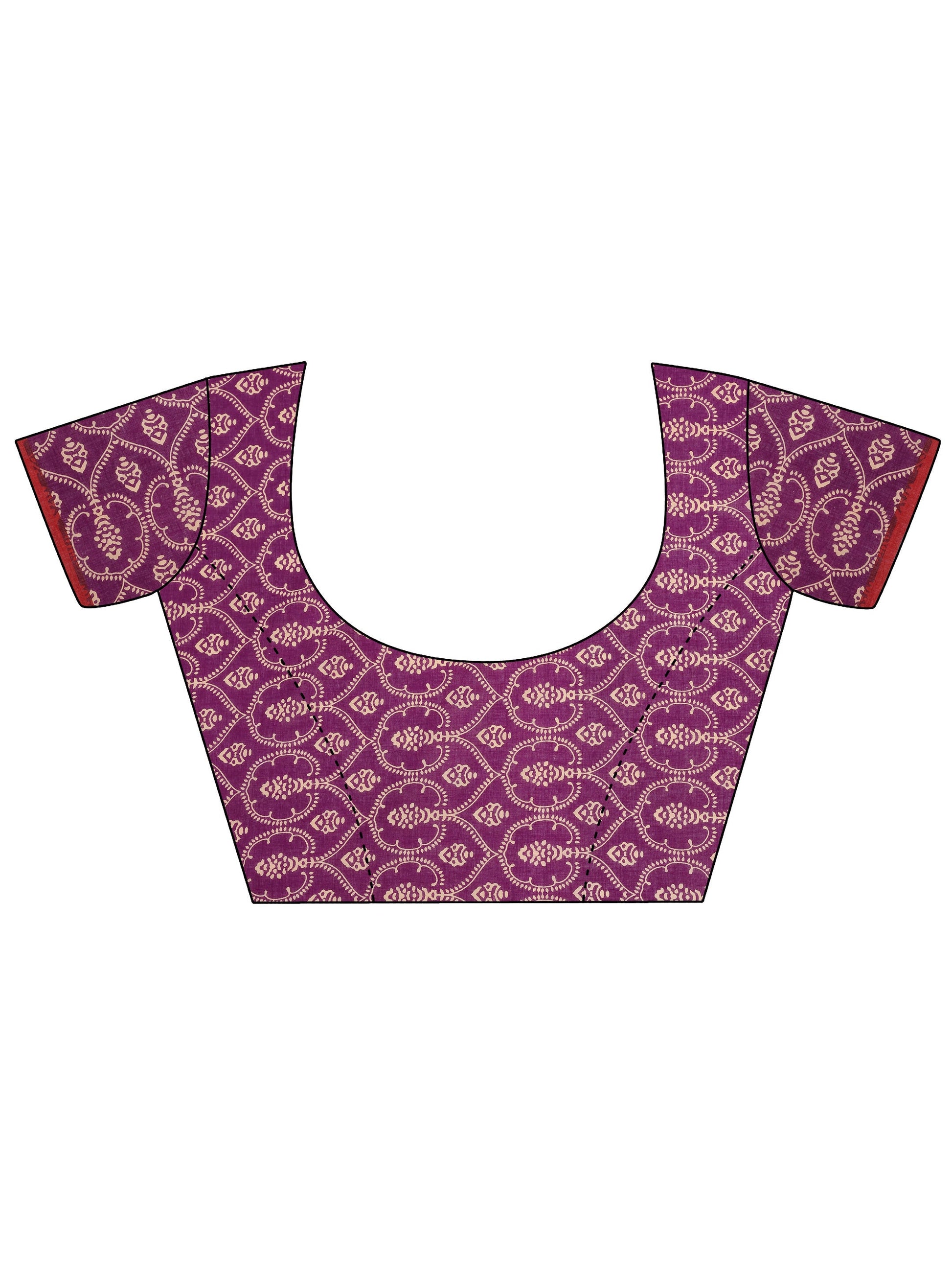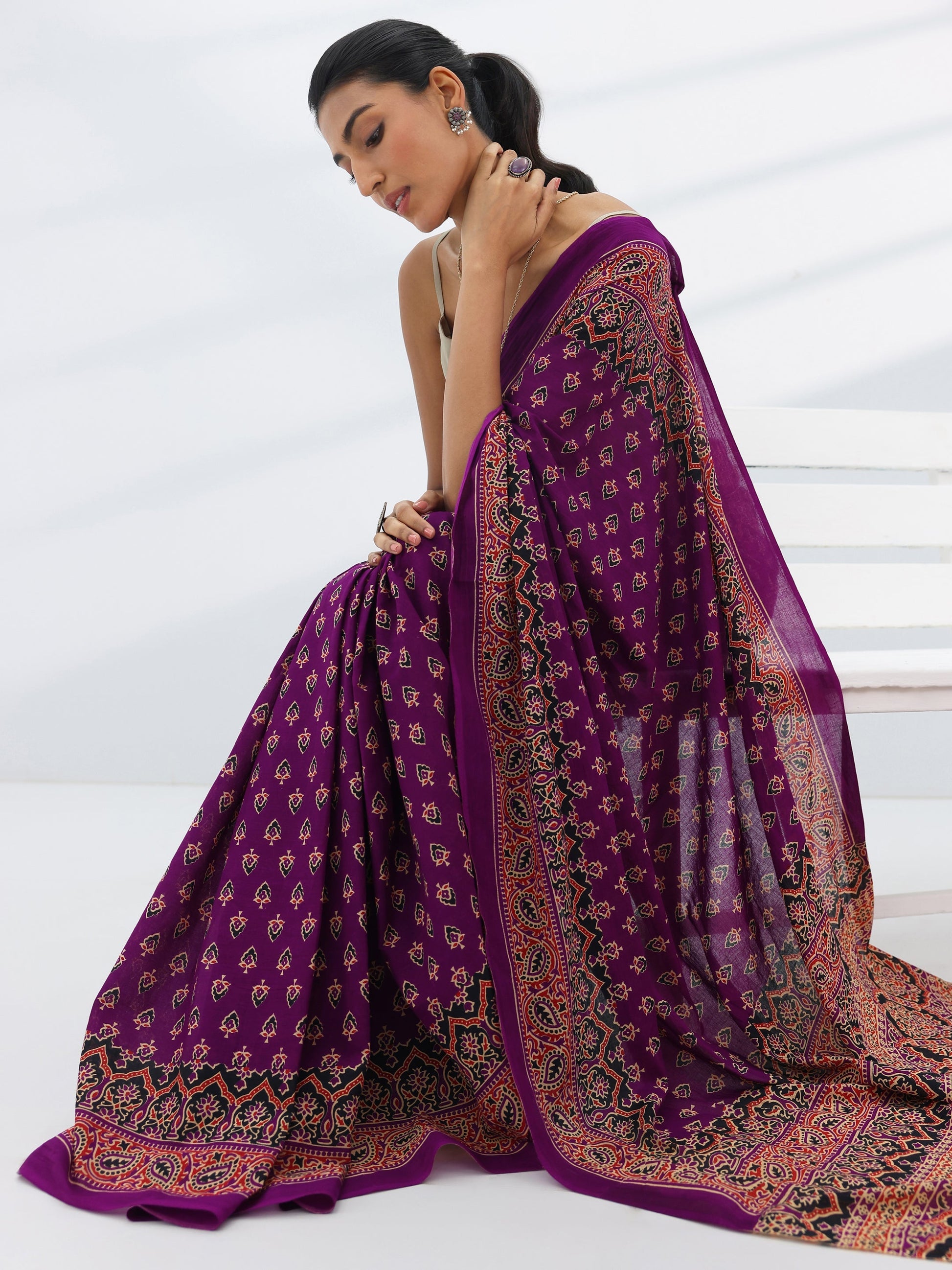 Our Purple Printed Cotton Saree Features Captivating Ethnic Motif Printed Design. Complemented With A Unstitched Blouse. This Charming Saree Is Perfect For Casual Wear