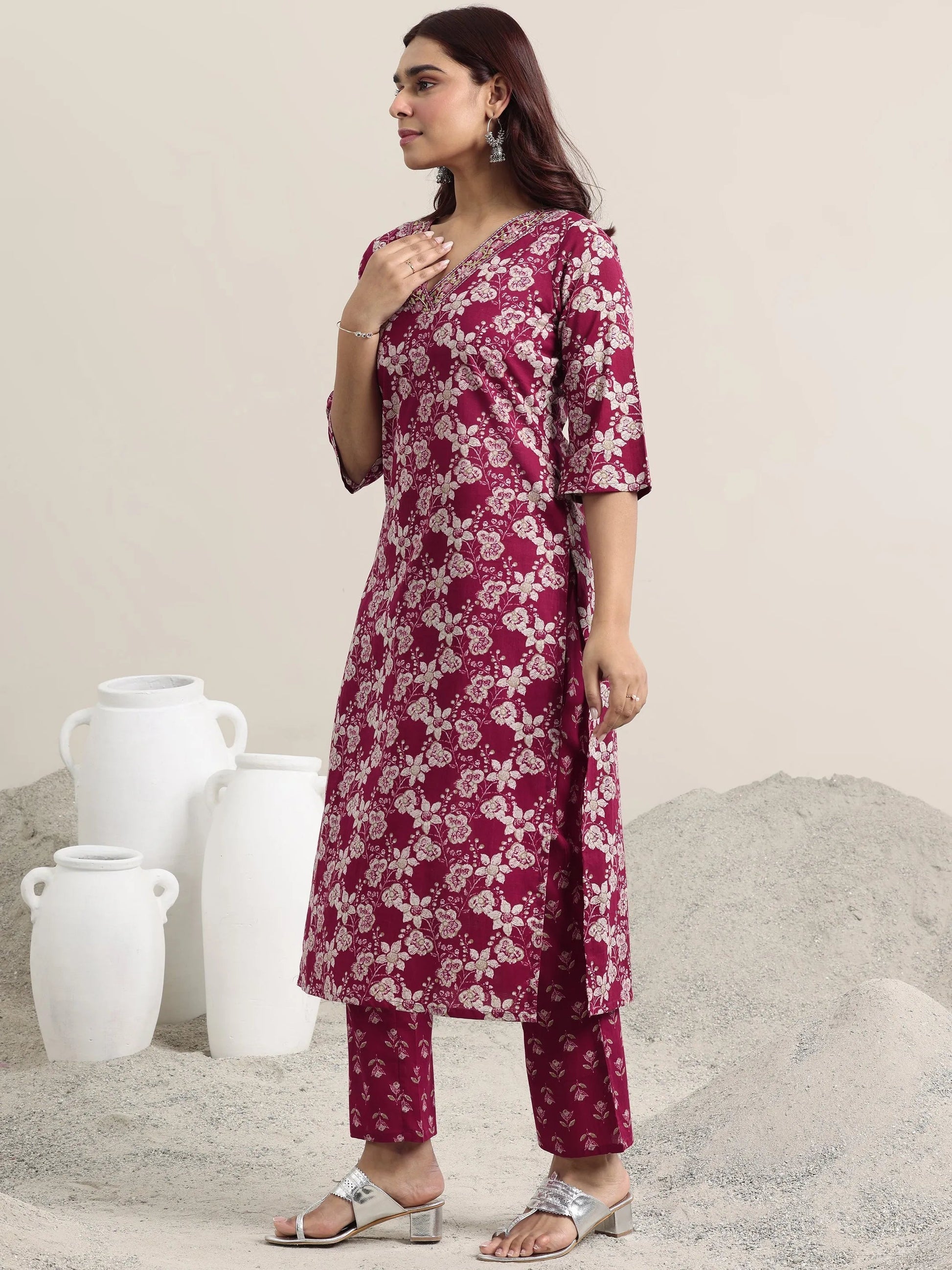 Our 3-piece burgundy printed cotton straight suit set features a kurta with V-neckline and three-quarters sleeves. Complemented with printed trousers with partially elasticated waistband and roomy pockets, and a printed dupatta. Highlighted with floral prints and thread work, this style is perfect for elevated everyday style.