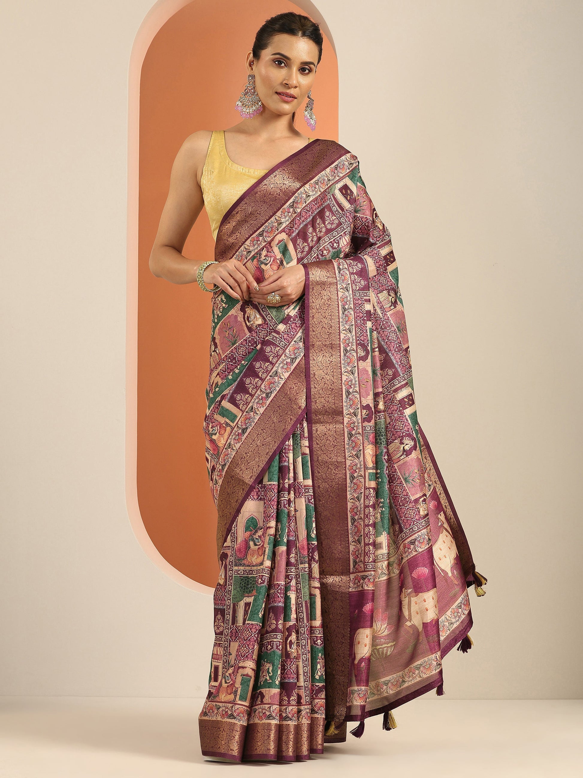 Our Maroon Printed Silk Blend Saree Features Captivating Tribal Printed Design. Complemented With A Unstitched Blouse Piece. This Charming Saree Is Perfect For Festive Wear.